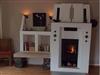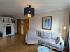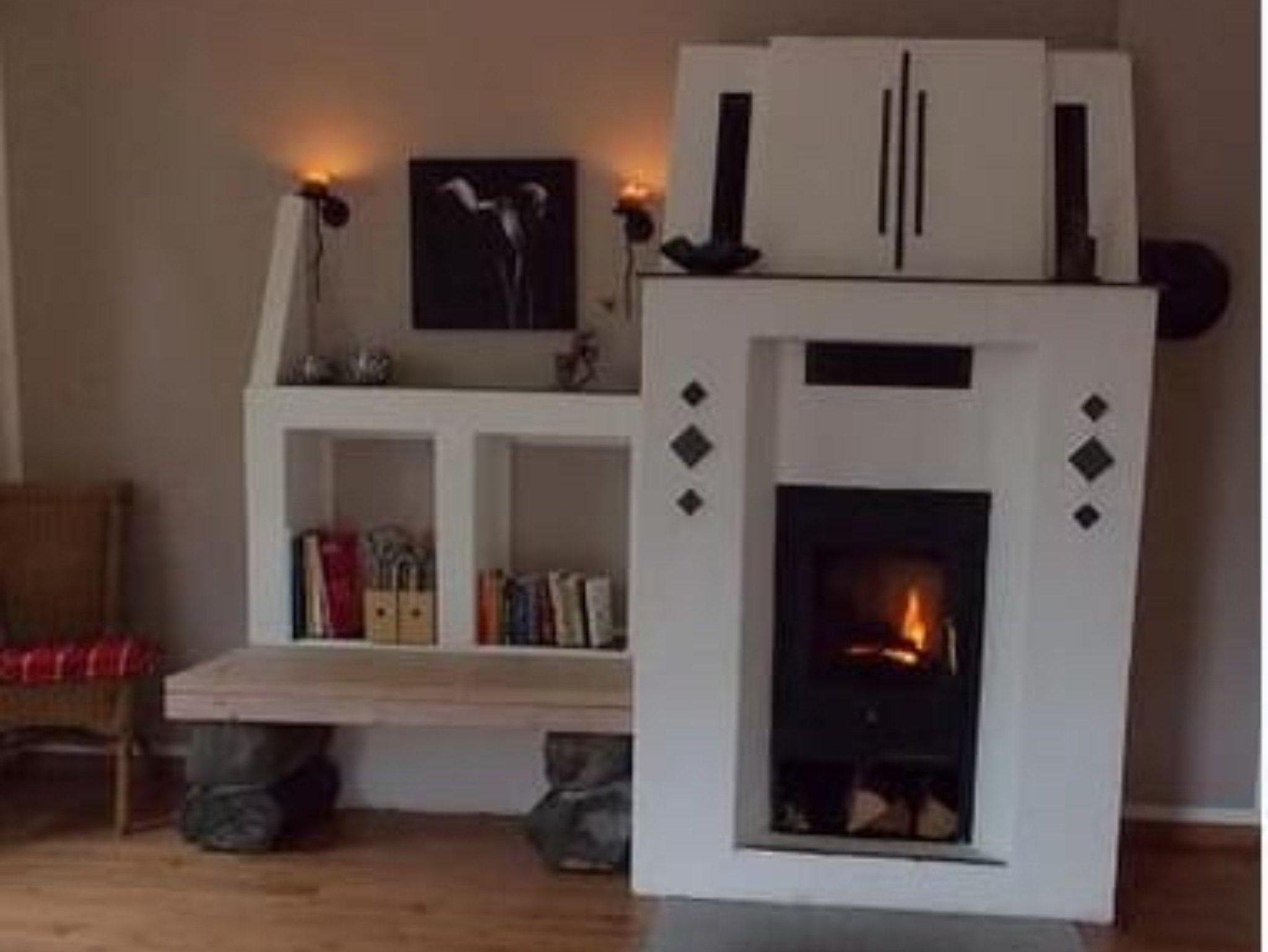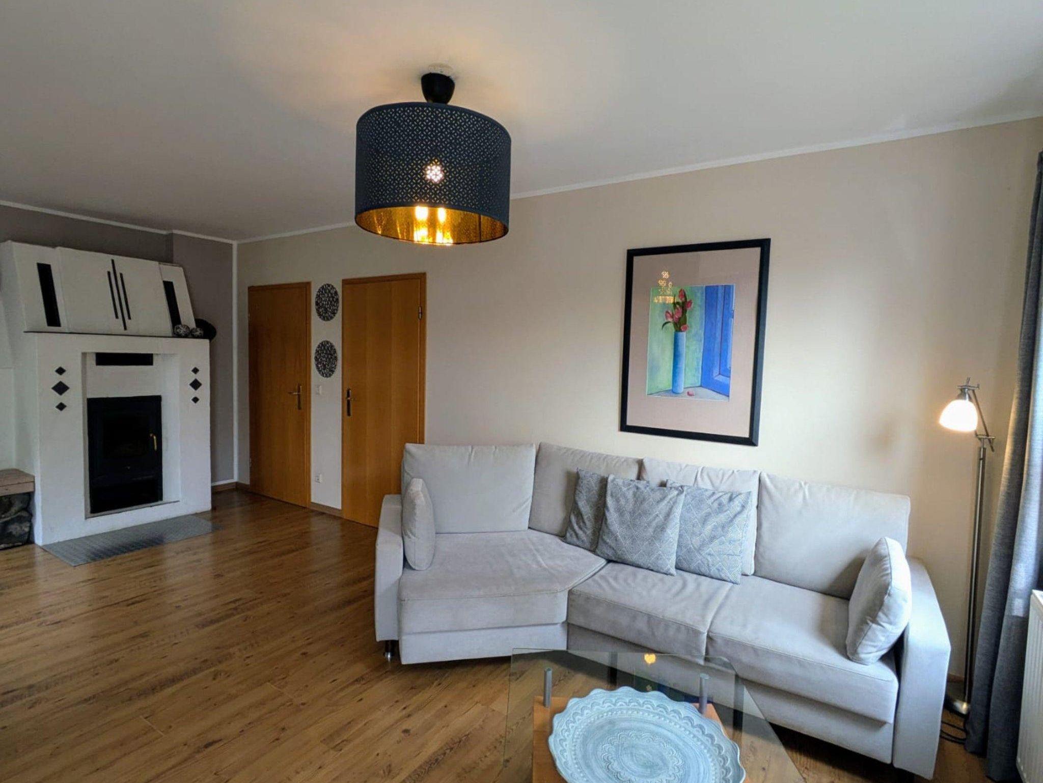 Das Wohnzimmer ist mit einem Gründerzeitschrank, Schlafsofa (150x200cm), Tisch, Sessel, Sitzwürfel, Stehlampe, Regal, Flachbildschirm und Kamin ausgestattet. Vom Wohnzimmer aus erreichen sie die Terrasse.