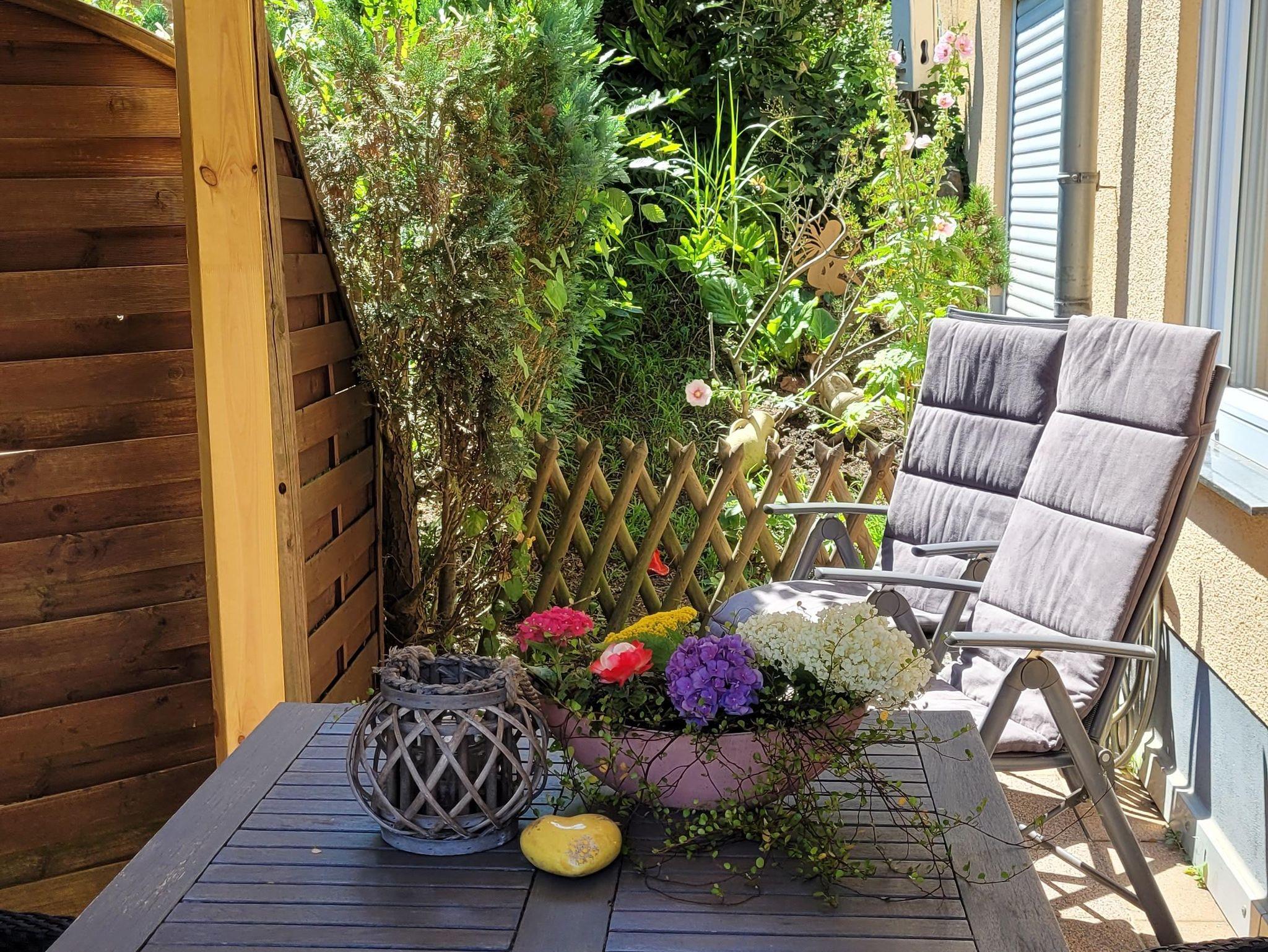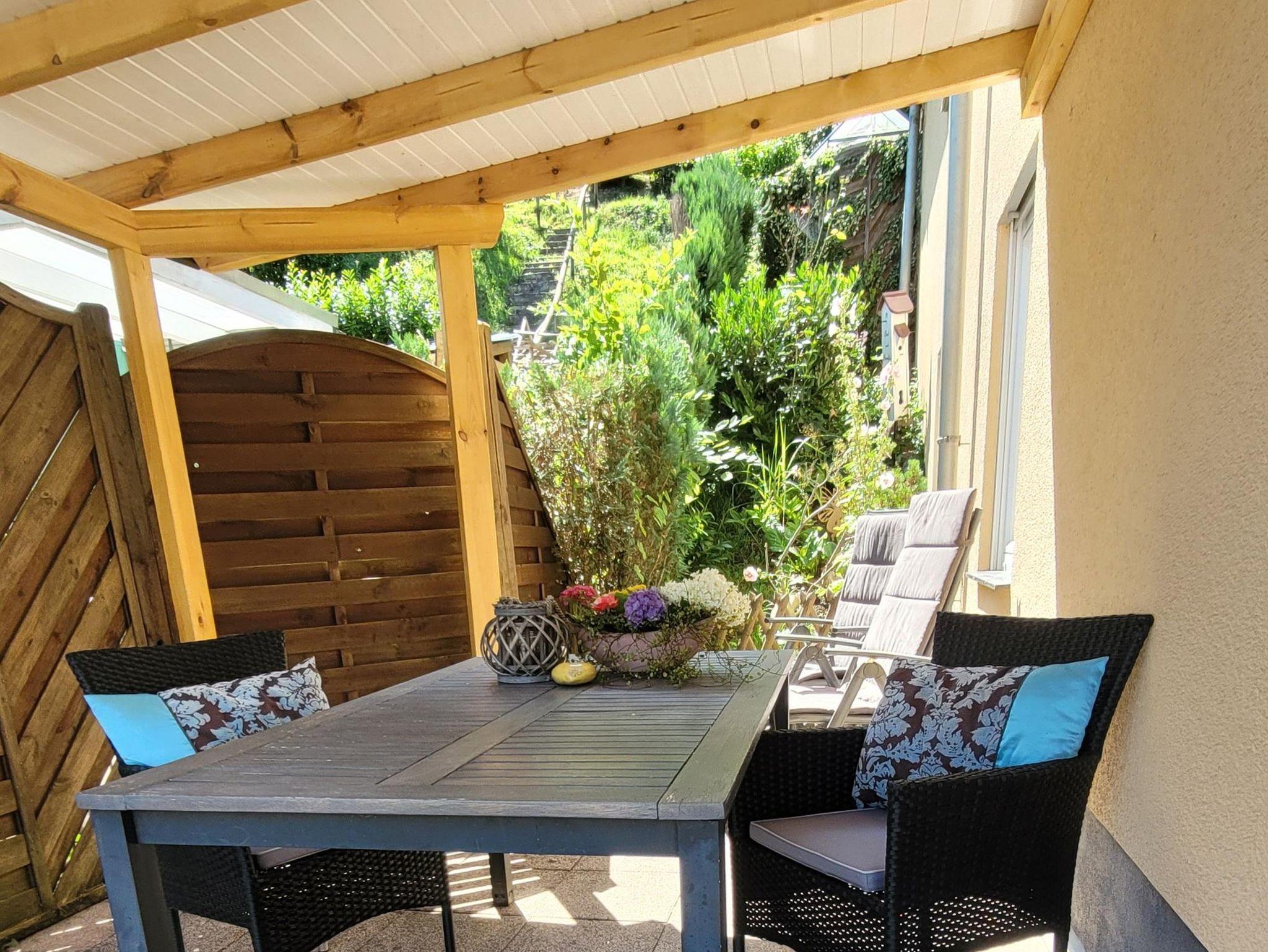 Die Terrasse, ca. 20 qm, ist mit Gartenmöbel und Liegestühle bestückt. Zur Terrasse zählt ein Hanggarten.