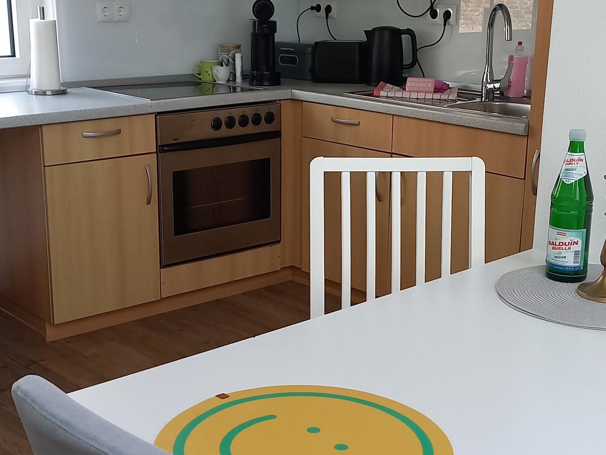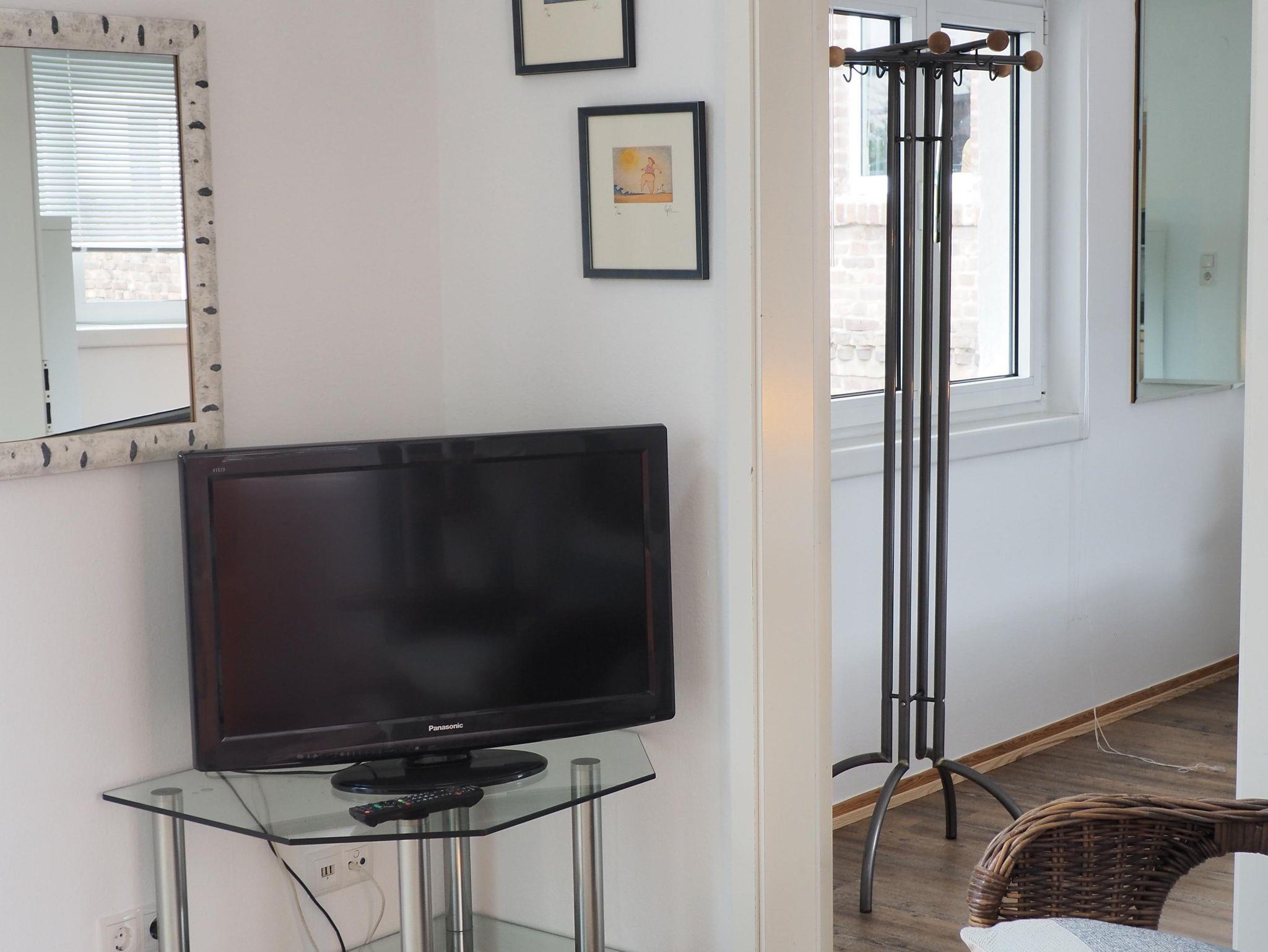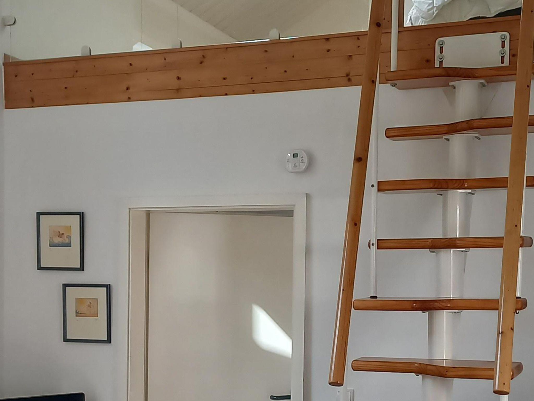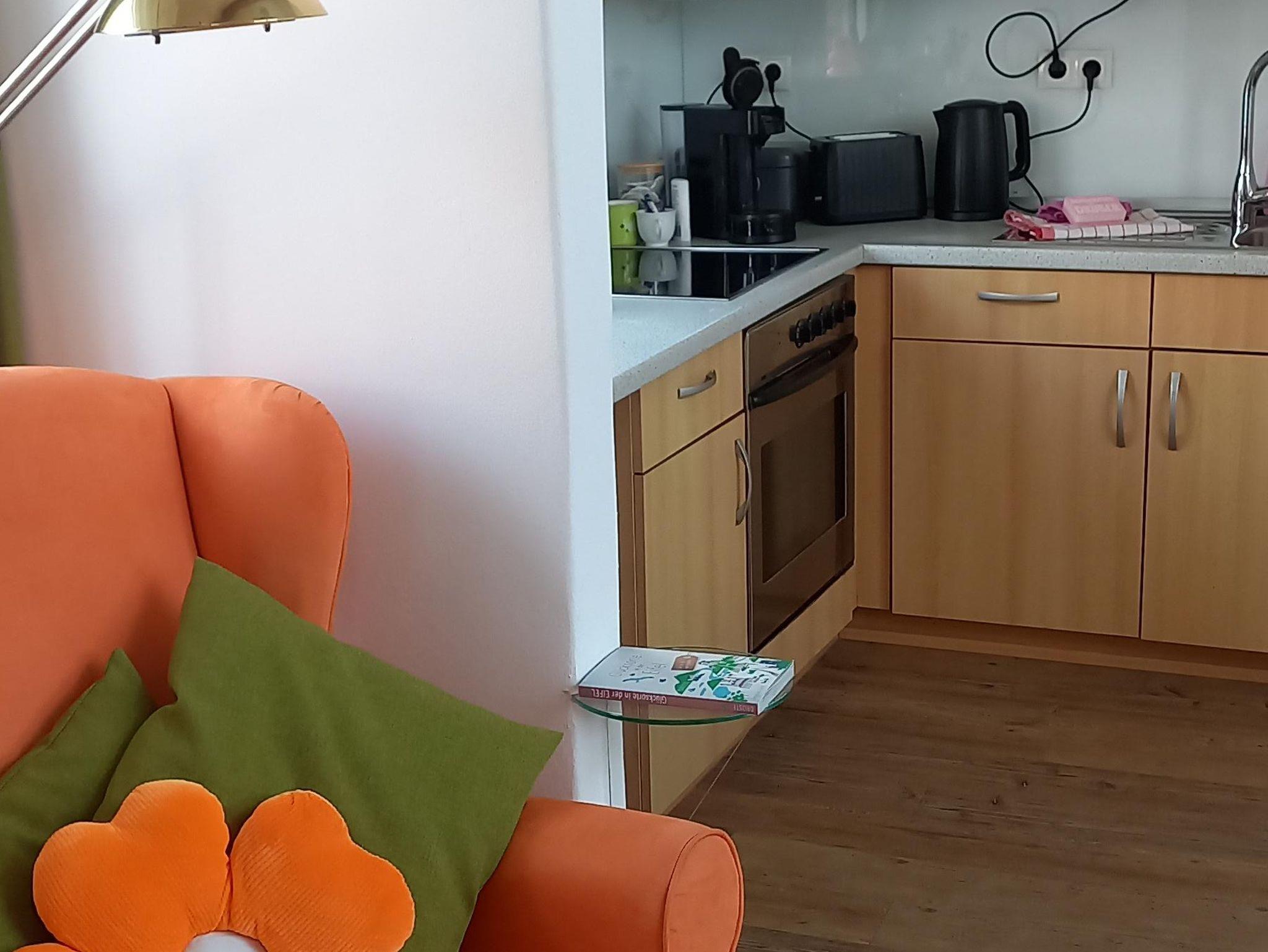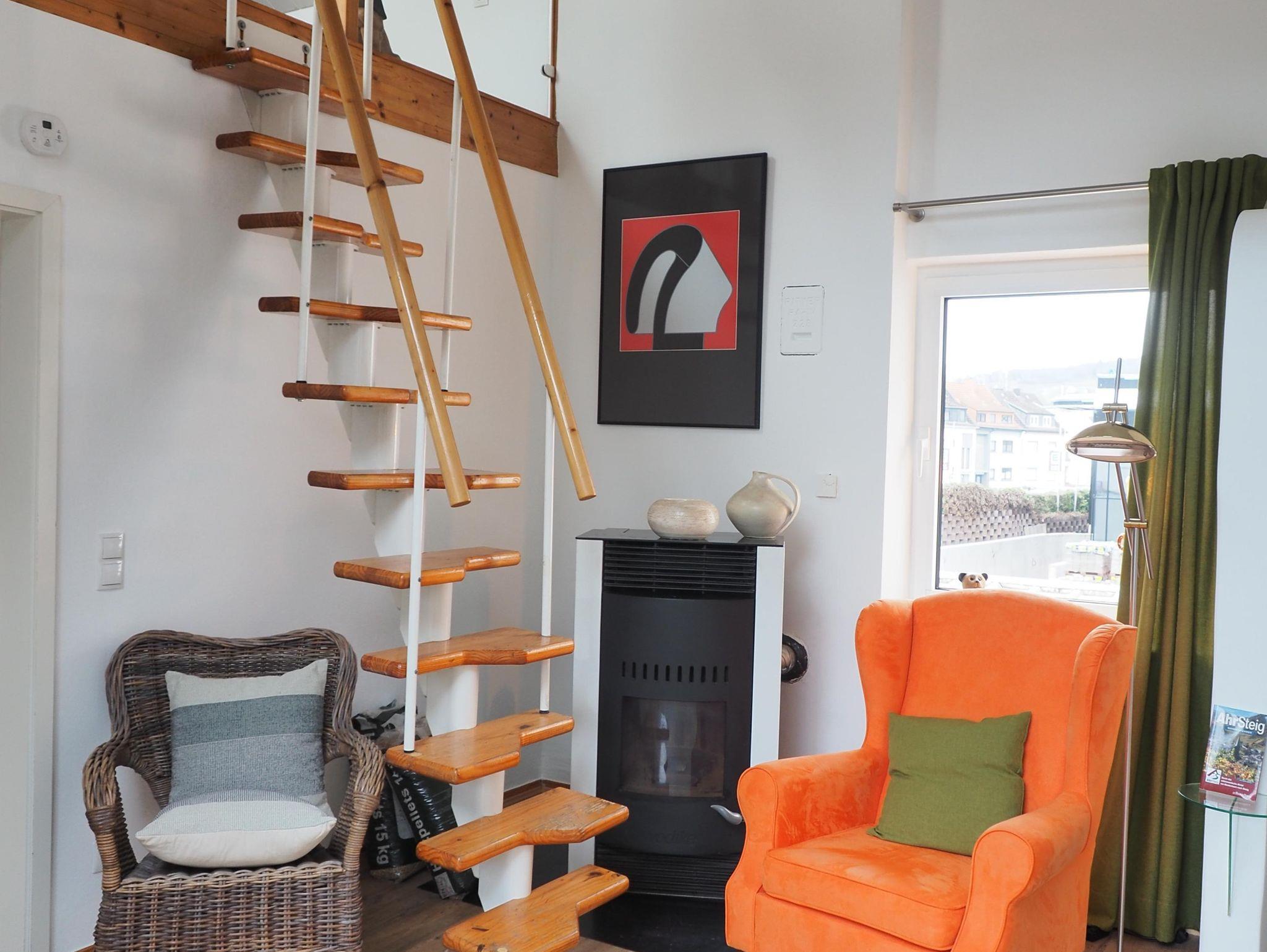 Wohnen überm Atelier ist eine helle und liebevoll eingerichtete Wohnung geeignet für 1-3 Personen.Sie bietet ein geräumiges helles Schlafzimmer mit Boxspring-Doppelbett 180 x 200 cm , Nachttische mit Beleuchtung , Steckdosen am Bett und einem Regal mit einigen gut erhaltenen spannenden Büchern. Über eine steile Treppe erreicht man den Raum mit einen Einzelbett.Die offene Wohnküche ist mit Mikrowelle, Herd mit Ceranfeld und Kühl-Gefrierschrank ausgestattet. Ebenso stehen viele Gewürze, Essig,Öl, Zucker, Süßstoff,Küchentücher und Spülmittel zur Benutzung bereit.Im Tageslicht-Bad befindet sich eine große Dusche , sowie Föhn , Badetücher sowie Besen und Staubsauger. Kabel-TV und freies WiFi sind ebenso vorhanden. Der Balkon ist windgeschützt und auf ihm dürfte geraucht werden. Für den Hund stehen Näpfe bereit.