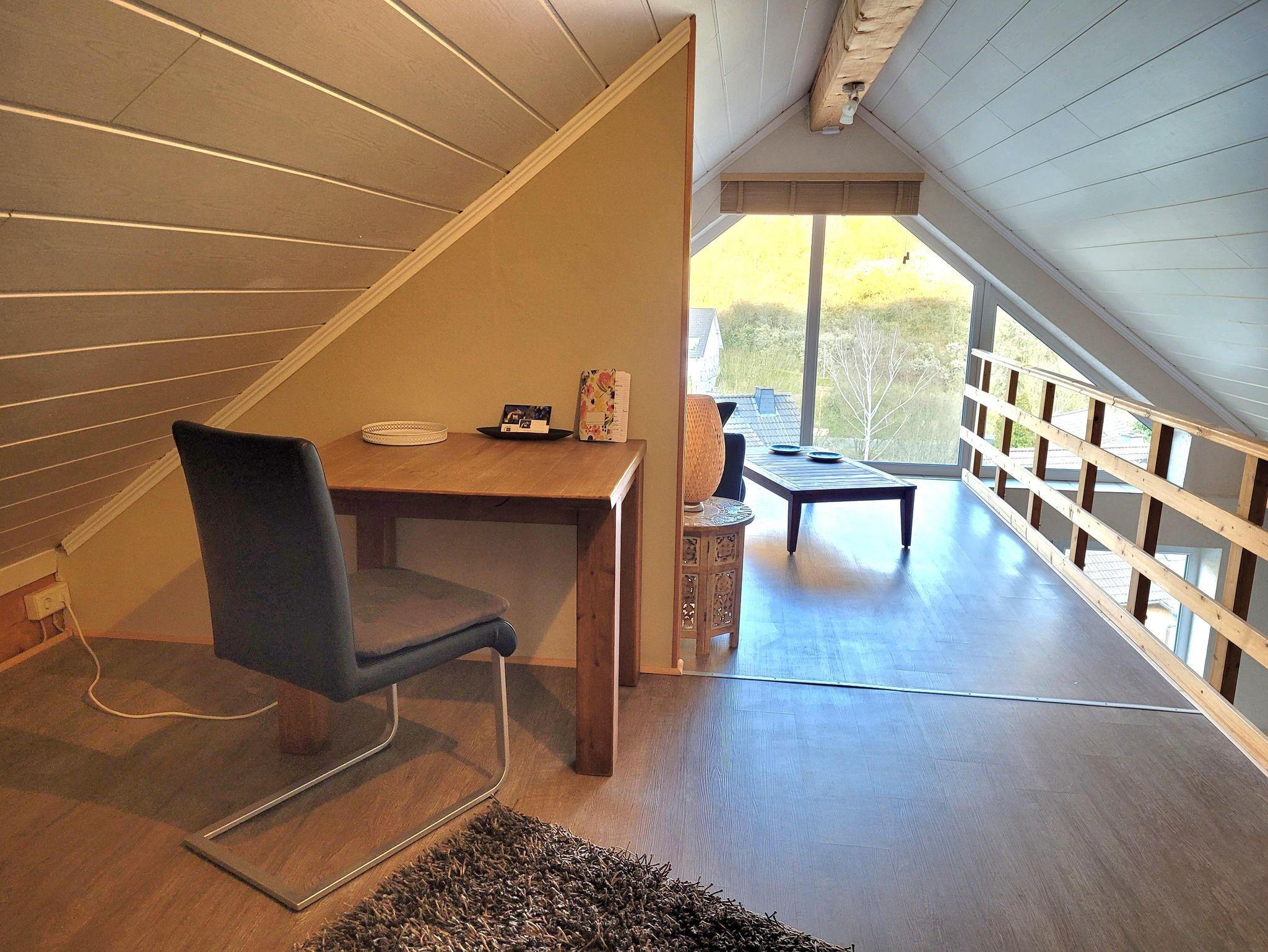 Die Ferienwohnung befindet sich auf zwei Ebenen, mit 2 separaten Schlafzimmern und auf dem offenen Podest/Galerie befindet sich ein Schlafsofa und ein Schreibtisch als Arbeitsplatz, WorkSpace etc.