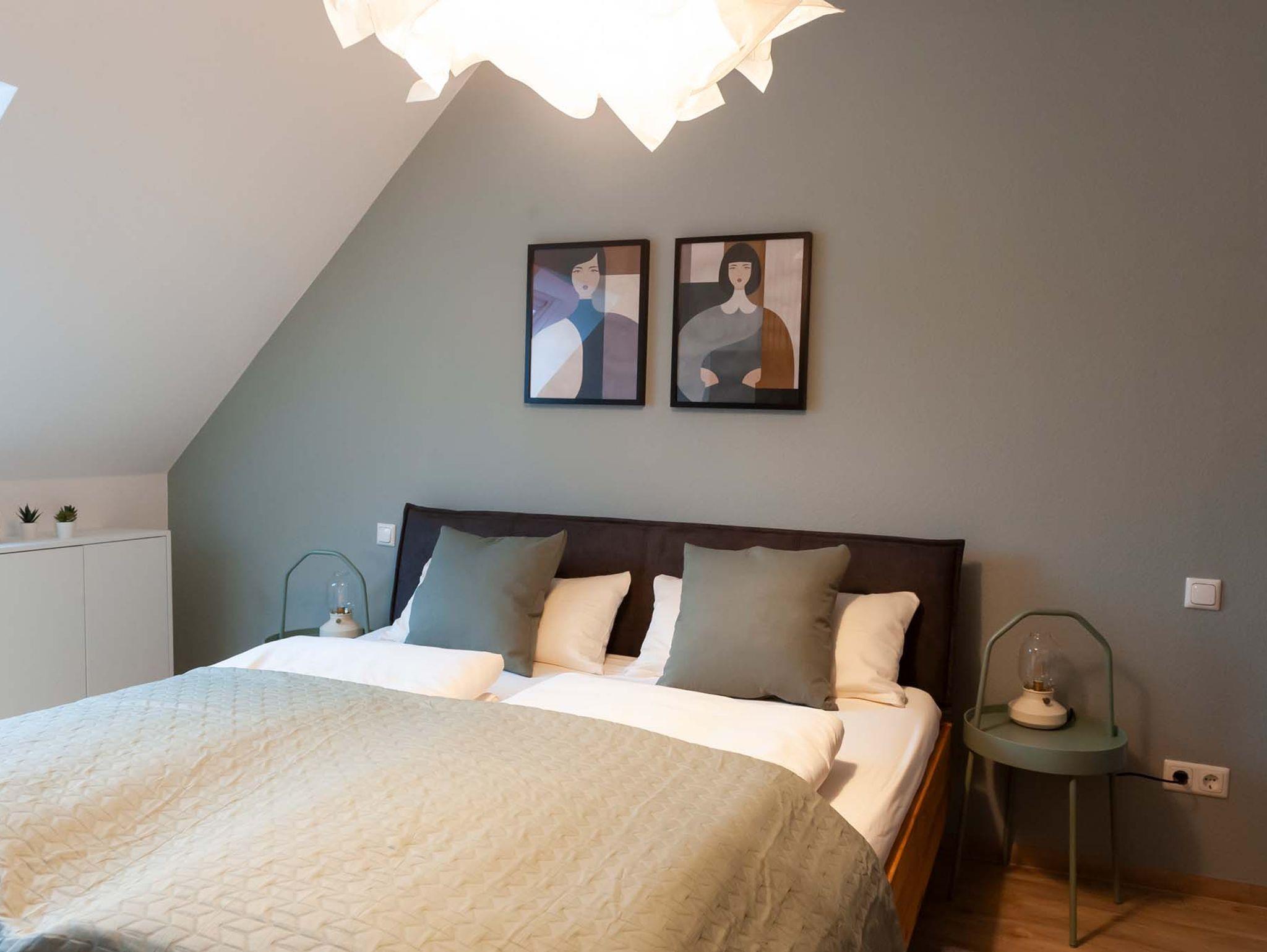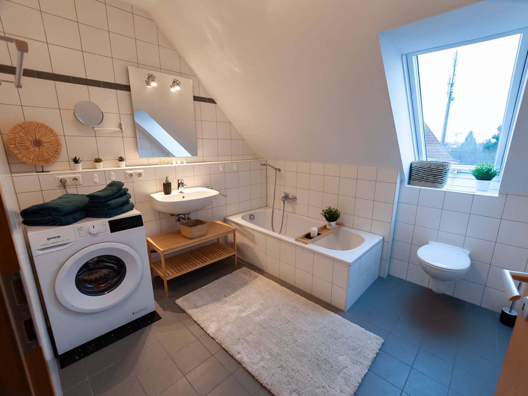 Zwei Schlafzimmer und ein Badezimmer mit Wanne und Waschmaschine befinden sich auf der 2. Etage. Ein Schlafzimmer ist mit einem Vollholzbett 180×200 und Smart-TV ausgestattet. Das zweite Schlafzimmer ebenfalls mit einem Vollholzbett 160×200 sowie einer Schlafcouch (für eine Person).