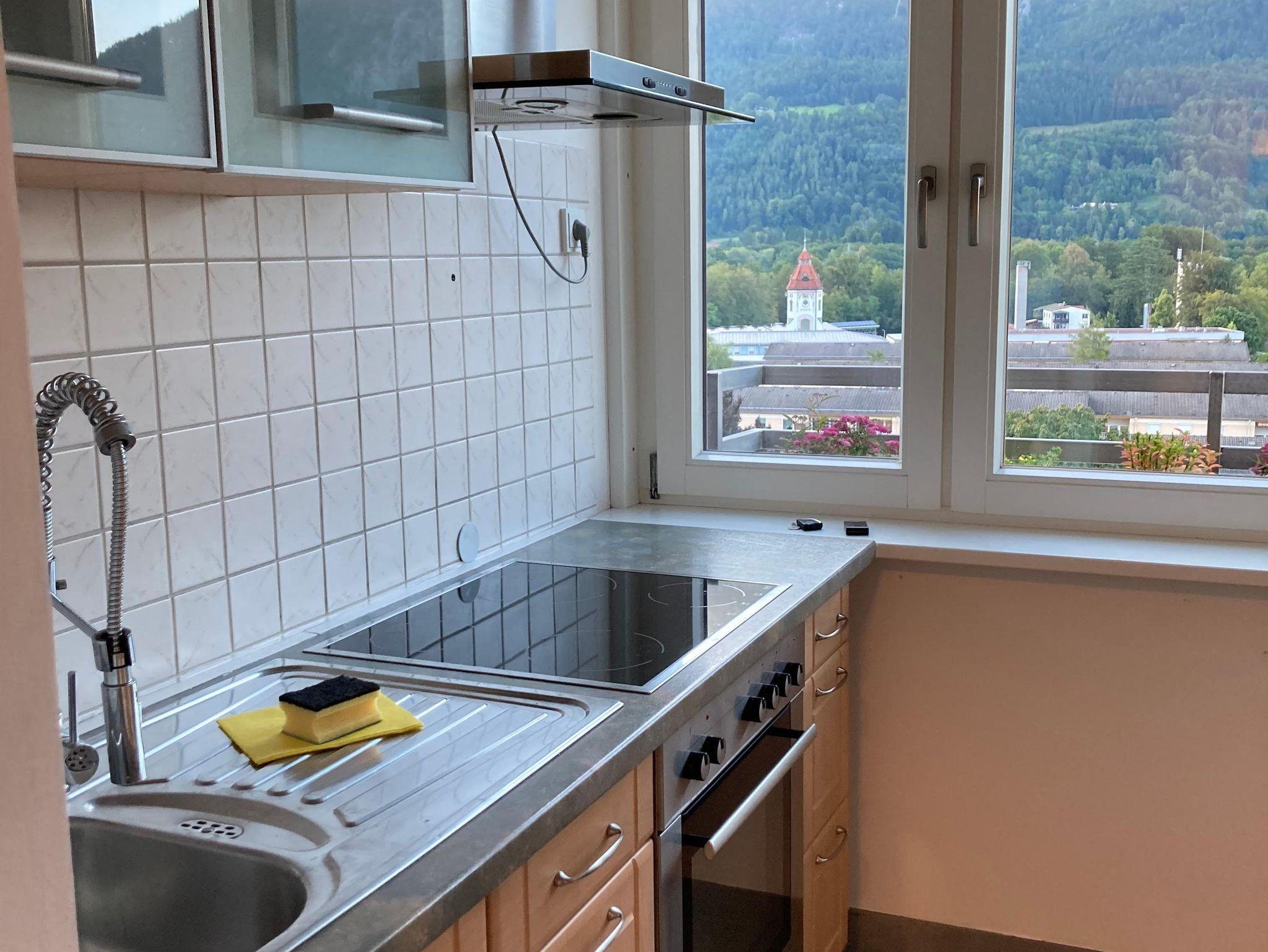 Der Küchenbereich ist vollumfänglich ausgestattet und lässt mit herrlichem Bergblick auf den Hochstaufen keine Wünsche offen.