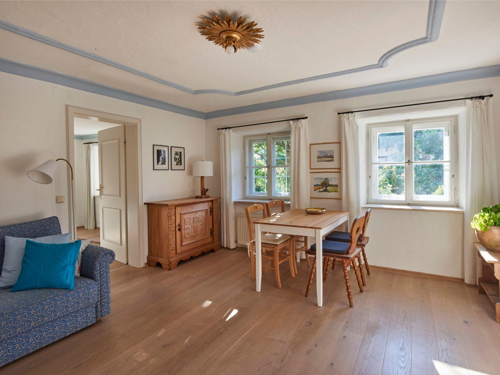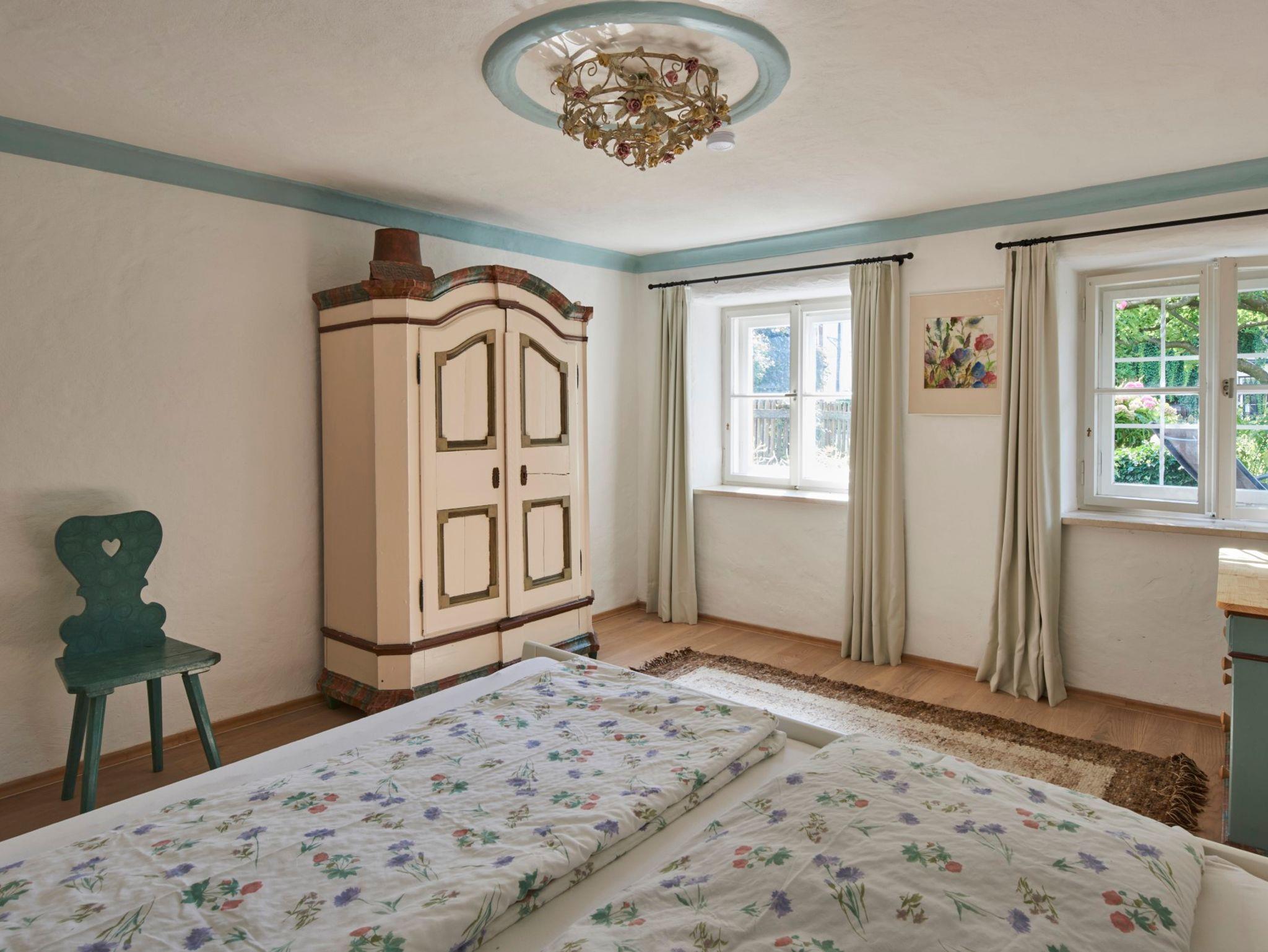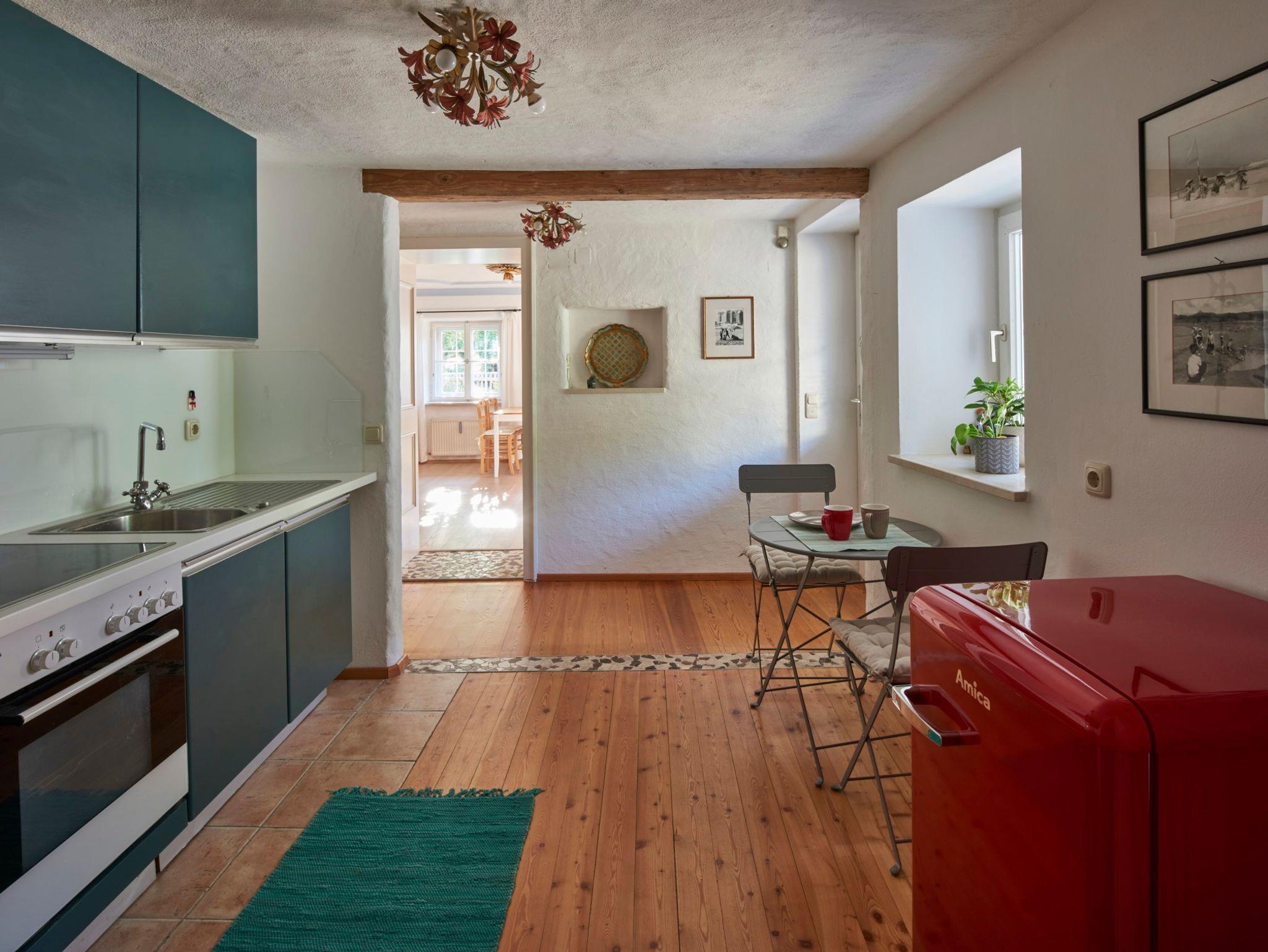 Unsere Ferienwohnung wurde liebevoll eingerichtet. Der Wohn- Essbereich, verfügt über eine Küchenzeile, einen Esstisch mit 4 Stühlen sowie einer Couch und einen Flachbild-TV. Das Schlafzimmer mit Doppelbett (Größe 1,60 x 2,00 m)haben wir mit viel Liebe zum Detail mit unseren originalen Bauernmöbeln eingerichtet. Das Badezimmer verfügt über eine Badewanne sowie eine Waschmaschine. In den Zimmern finden Sie alten Bauernstuck, der aufwendig saniert wurde. Zusammen mit den gebleichten Eichböden und den Sprossenfenstern verströmen die Räume ein gemütliches Flair. Für sehr schallempfindliche Menschen ist es vielleicht wichtig zu wissen, dass es sich um ein historisches Gebäude handelt, man also nicht von einem Schallschutz eines Neubaus ausgehen darf. Den gesamten Gartenteil vor Ihrer Wohnung können Sie zum Entspannen, Lesen oder Erholen oder einfach zum lauschen des Plätscherns des Florianibrunnens nutzen. Hier kann man sich einfach erholen.