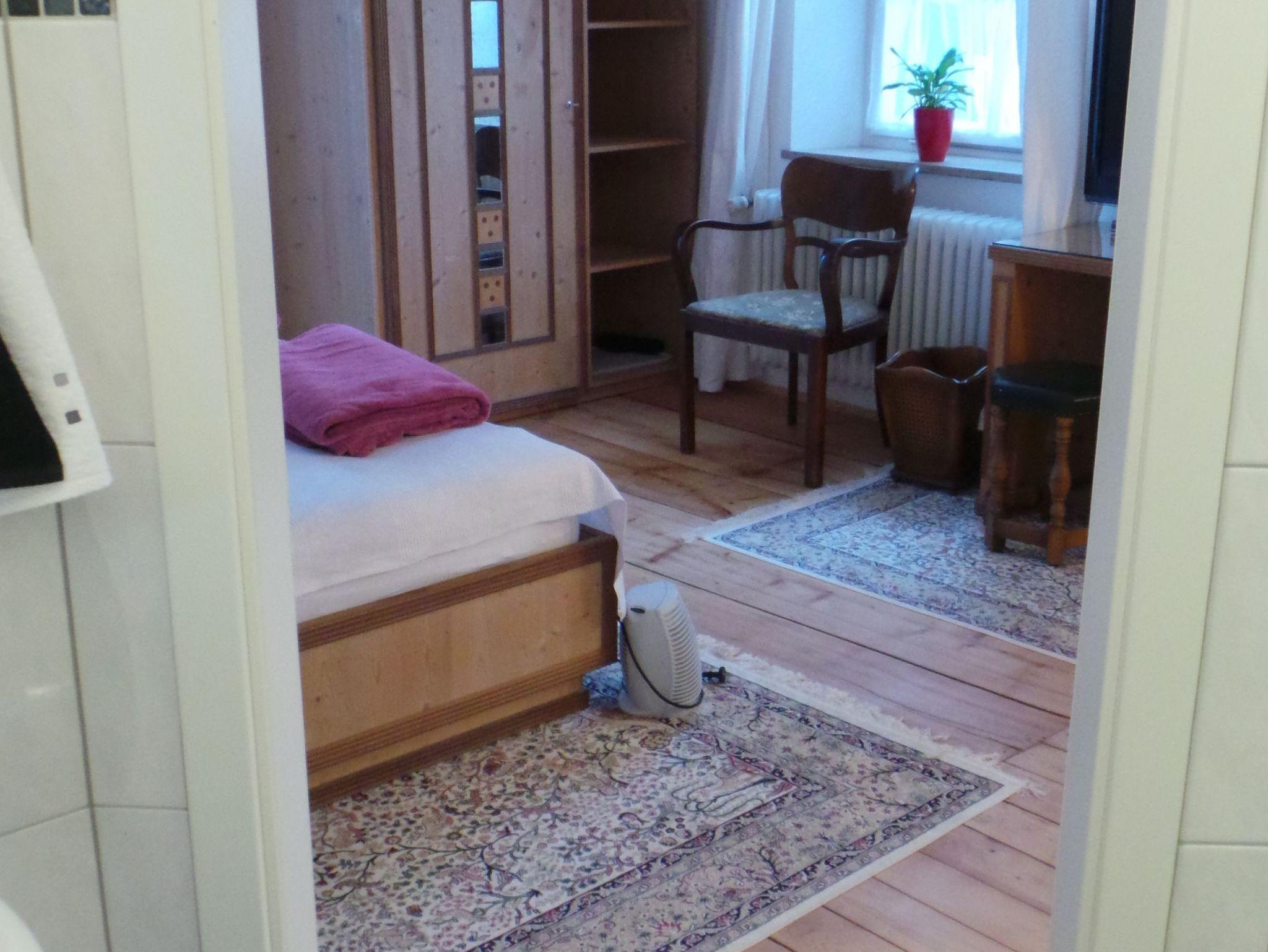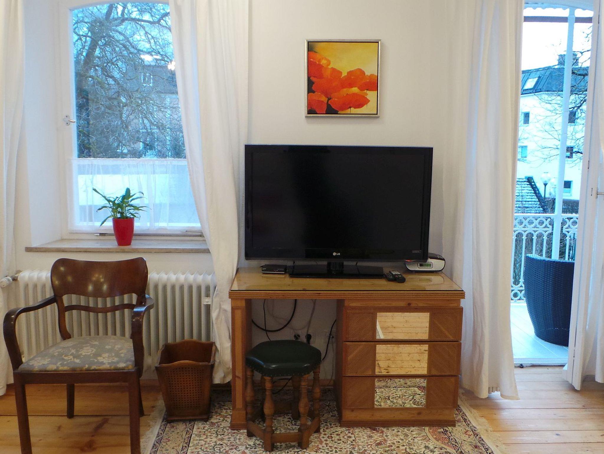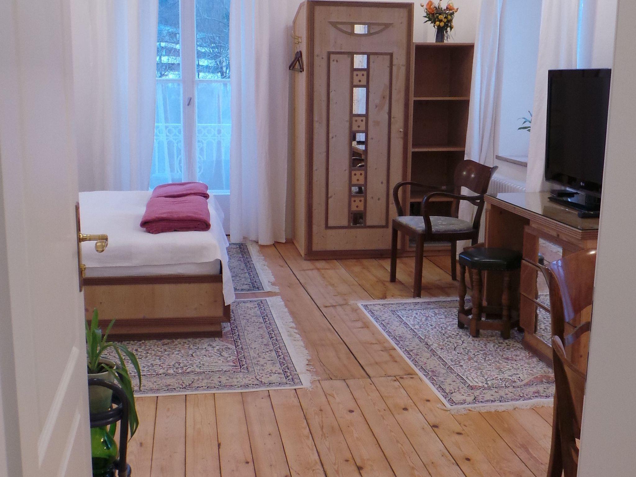 Die Ferienwohnung - TOP 2 (55 qm) mit sonnigem Ost- und Südbalkon, ist als Nichtraucherwohnung hell, freundlich und modern gestaltet, verfügt über ein Wohn/Esszimmer mit Küchenzeile und gesondertem Schlafzimmer mit Badezimmer (Du/WC). Die elegante Wohnung im 1. OG ist über eine schöne Holztreppe mit Fenster/Zwischenpodest in der Villa Bariole gut erreichbar. Sie ist ideal für 1-3 Personen. Beide Zimmer bieten Balkonzugang, sowie ein vielfältiges Beleuchtungskonzept zum Wohlfühlen. Beide Balkone mit Lounge-Sitzgruppen laden zum Verweilen ein und gewähren einen wundervollen Ausblick in den Garten mit altem Baumbestand und in die Berge der Region. Der Predigtstuhl (1.613 Höhenmeter) ist vom Südbalkon aus gut sichtbar und erhebt sich abends wie ein leuchtender Kristall über der Stadt. Das Wohn/Esszimmer mit Fenster und Balkontüre (Süd) ist charmant eingerichtet, verfügt über ein Ausziehsofa, Wohnzimmertisch mit Sitzgruppe, Wand- Flachbild-TV mit Sat-Empfang, Internet/WLAN Anschluss und ein Radio mit CD-Player. Die Küchenzeile im Wohn/Esszimmer ist gut ausgestattet, verfügt über Spüle, Geschirrspüler, Kühl-/Gefrierschrank, Magnetresonanz-Kochplatte (2 Kochfelder) mit zugehörigem Kochgeschirr und Dunstabzug, Mikrowellenherd, Kaffeefilterautomat, Toaster, Wasserkocher, Besteck, Gläser und allen anderen relevanten Dingen. Frisches Gebäck können die Gäste in einer nahegelegenen Bäckerei fußläufig besorgen. Das Schlafzimmer mit Fenster und 2 Balkontüren (Ost und Süd) beinhaltet eine Essecke mit rundem Tisch, Schreibtisch mit großem Flachbild-TV mit Sat-Empfang, Internet/WLAN Anschluss, Doppelbett mit Komfortmatratzen, 2 Nachtkästchen, Radiowecker, Kleiderkasten, sowie ein Badezimmer (Du/WC).