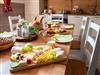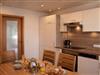 Große separate Küche mit Essecke, Ceranfeld, Backofen, Kühlschrank mit Gefrierfach, Mikrowelle, Kaffeemaschine, Wasserkocher und Toaster.