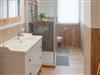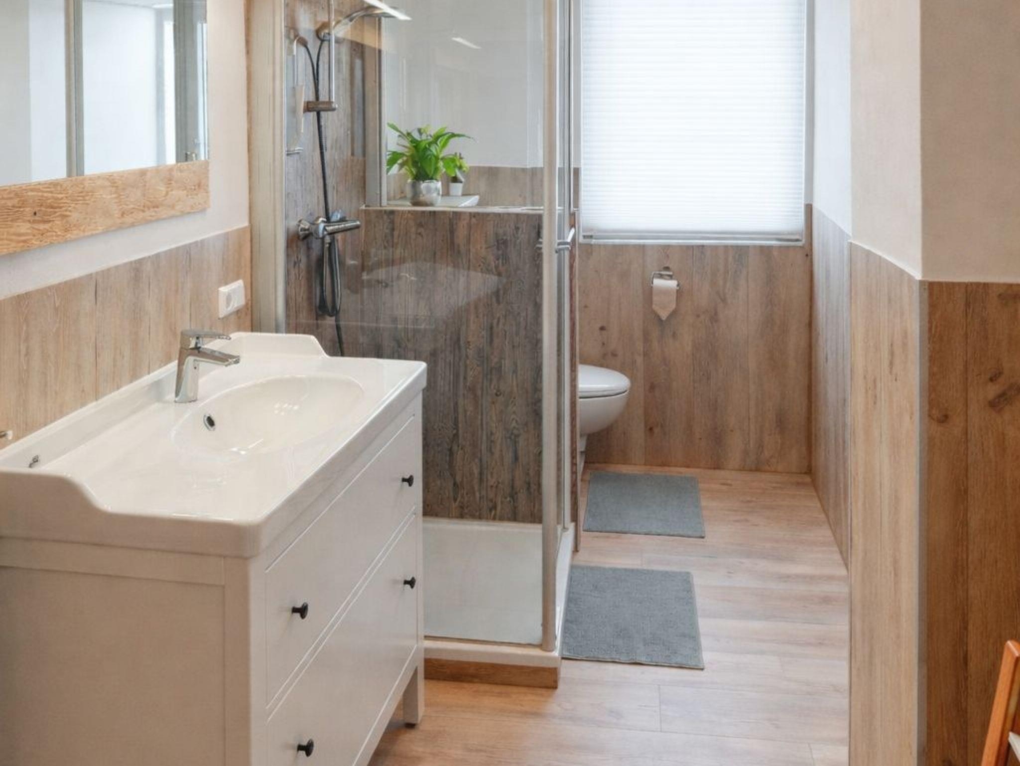 Dusche mit einer geringen Schwelle von ca. 5 cm, WC, Handtuchheizkörper, Kosmetikspiegel, Kinderschemel, großes Fenster, Föhn, Hand,- und Badetücher, welche im Preis mit inbegriffen sind.
