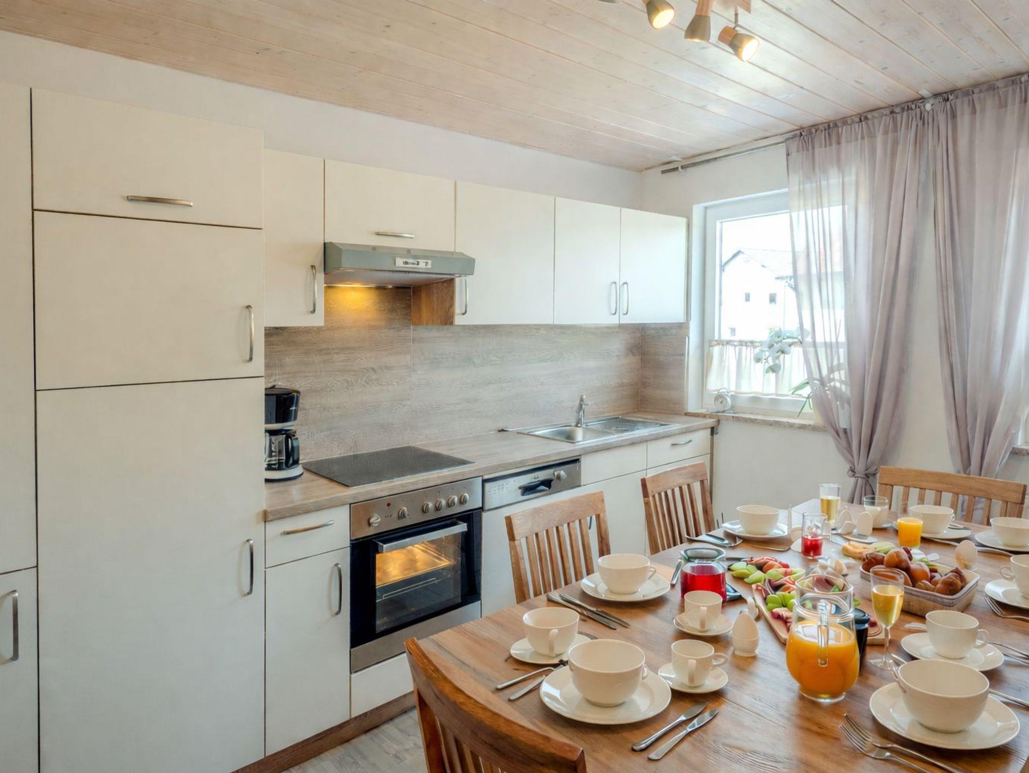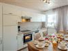 Große separate Küche mit Essecke, Ceranfeld, Backofen, Kühlschrank mit Gefrierfach, Kaffeemaschine, Wasserkocher und Toaster.