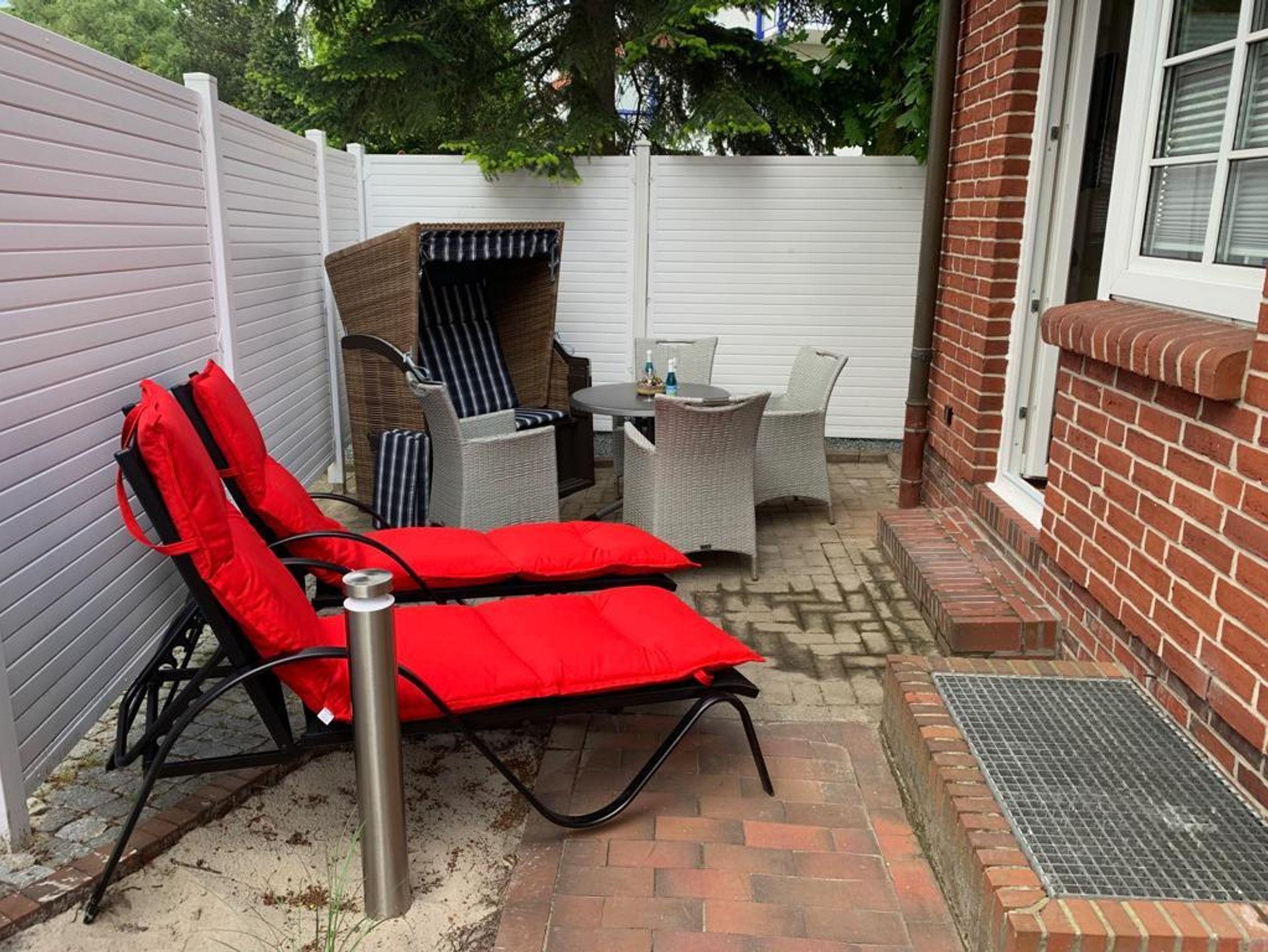 Eine Terrasse, ausgestattet mit Liegestühlen, Strandkorb und Sitzecke, lädt zur Entspannung ein.