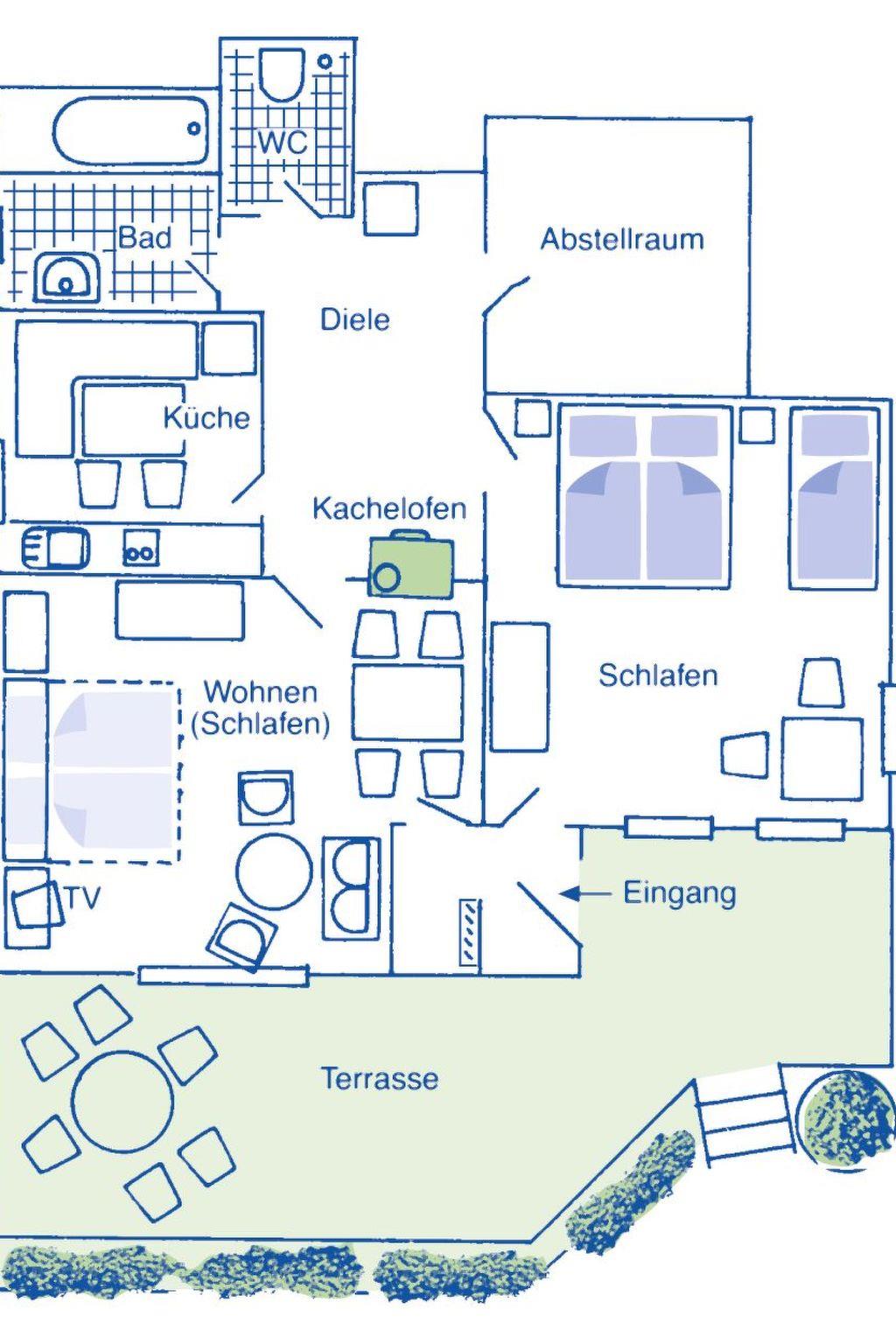die Wohnung hat einen eigenen Eingang über die abschließbare Terrasse,-mit 5 Treppenstufen - 1 Schlafraum mit 1 x Doppelbett 1,80x 2,00 m, 1 Einzelbett 1,80 m Lang -- Wohnraum : 1 Wohn/Schlafraum mit 2 Ausklappbetten 2,00 m ( Schrankbetten )- Sofa,- Sessel,- Couchtisch, alles in bequemer Sitzhöhe , helles Fichtenholz -Kabel TV, -Stereo Anlage,- Telefon kostenfrei im deutschen Festnetz,-- WLAN kostenfrei,-- Küche: neue großzügige WohnKüche mit gemütlicher Eckbankgruppe, - Kaffemaschine,- MicroWelle, - Wasserkocher, - Toaster, - Rührgerät,- Geschirrspüler, Herd Cerankochfeld und Backofen,- sehr gutes Geschirr und Töpfe ( Silit ) und vieles mehr--- Nichtraucher Wohnung --- Badezimmer : DuschBadewanne tiefergesetzt , GlasDuschwand , Waschbecken , Hocker - seperates WC , Diele : Garderobe
