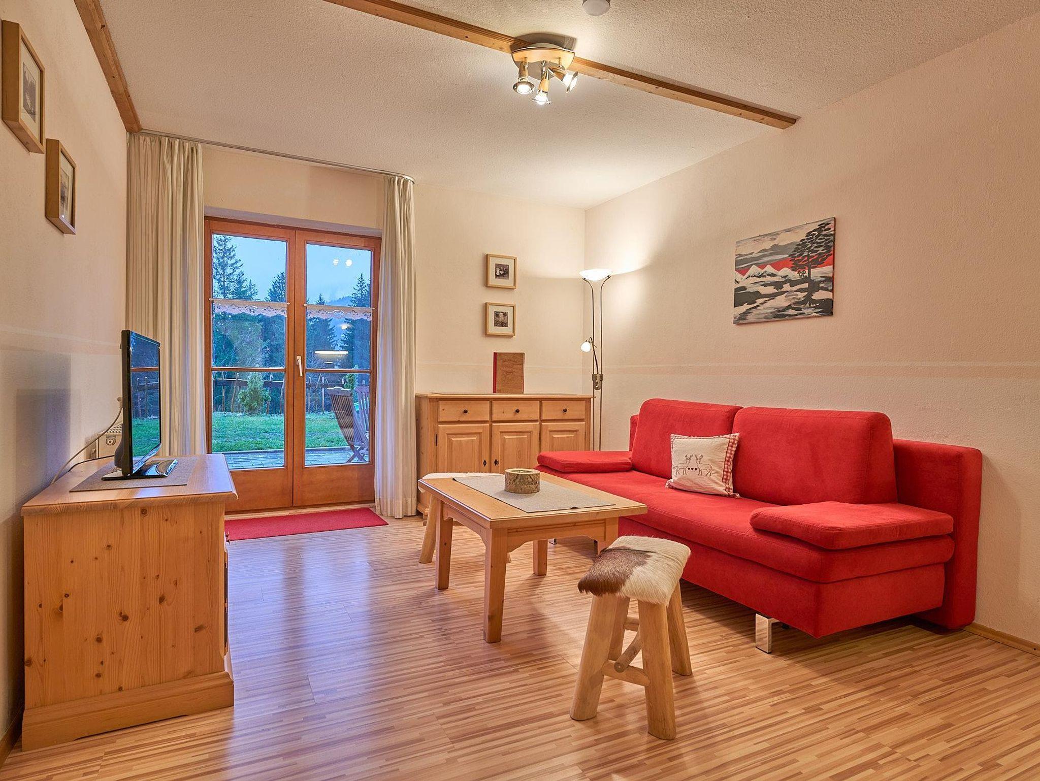 Wohnzimmer mit Ausziehcouch und TV;