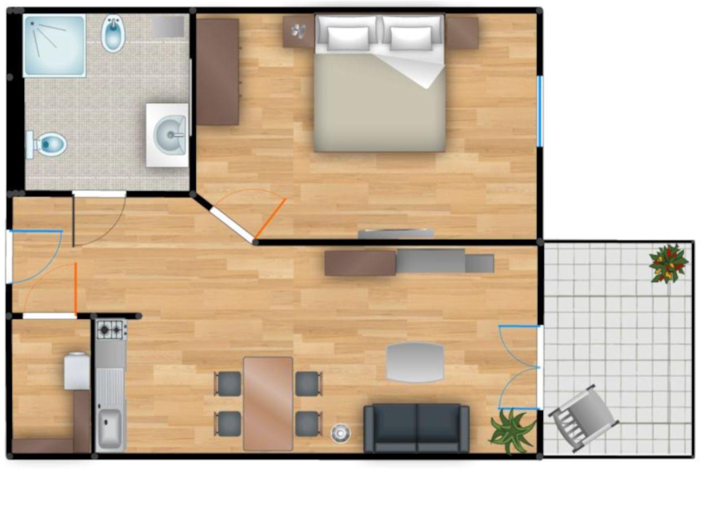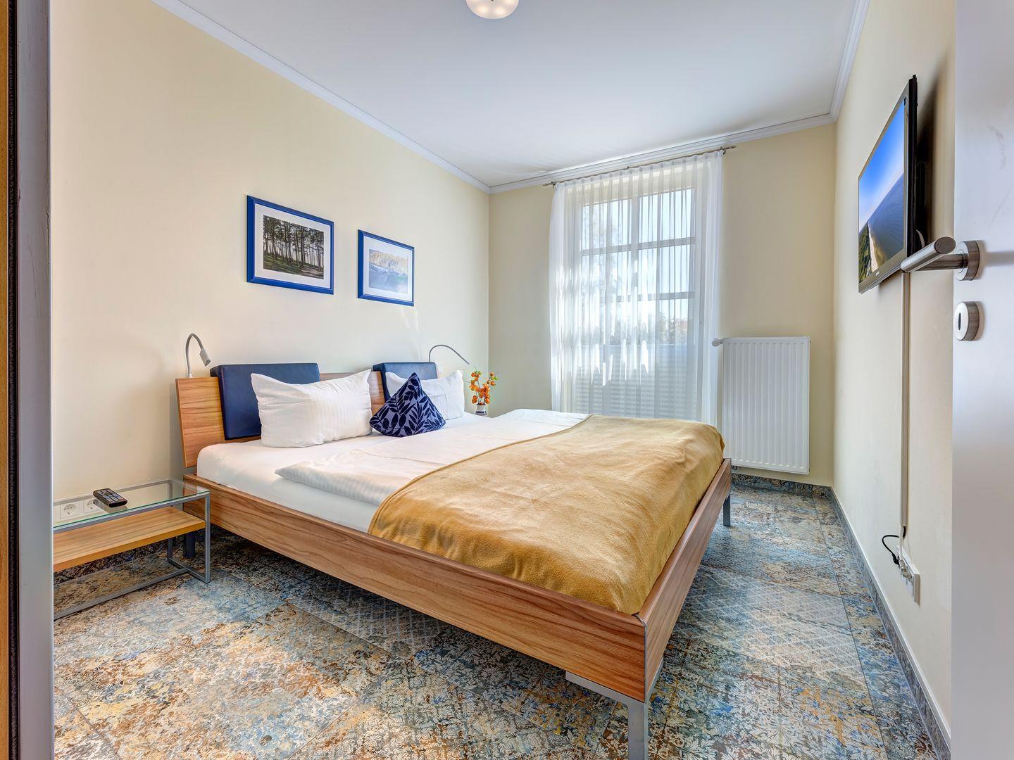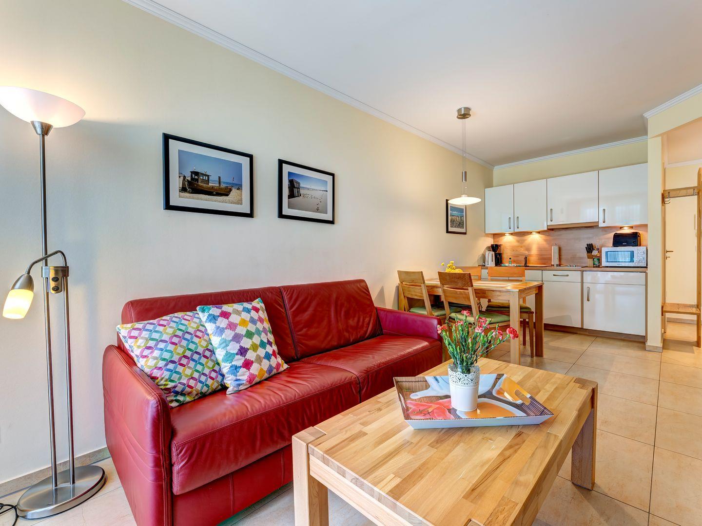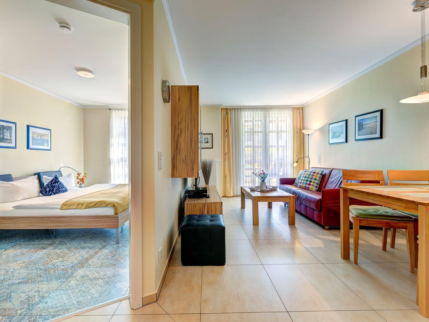 Das 2-Raum-Appartement verfügt über ein vollwertiges Schlafzimmer, das Gemütlichkeit und Entspannung verspricht. Zusätzlich steht im Wohnbereich ein komfortables Schlafsofa bereit, das Platz für eine dritte Person bietet.