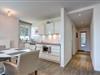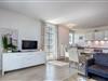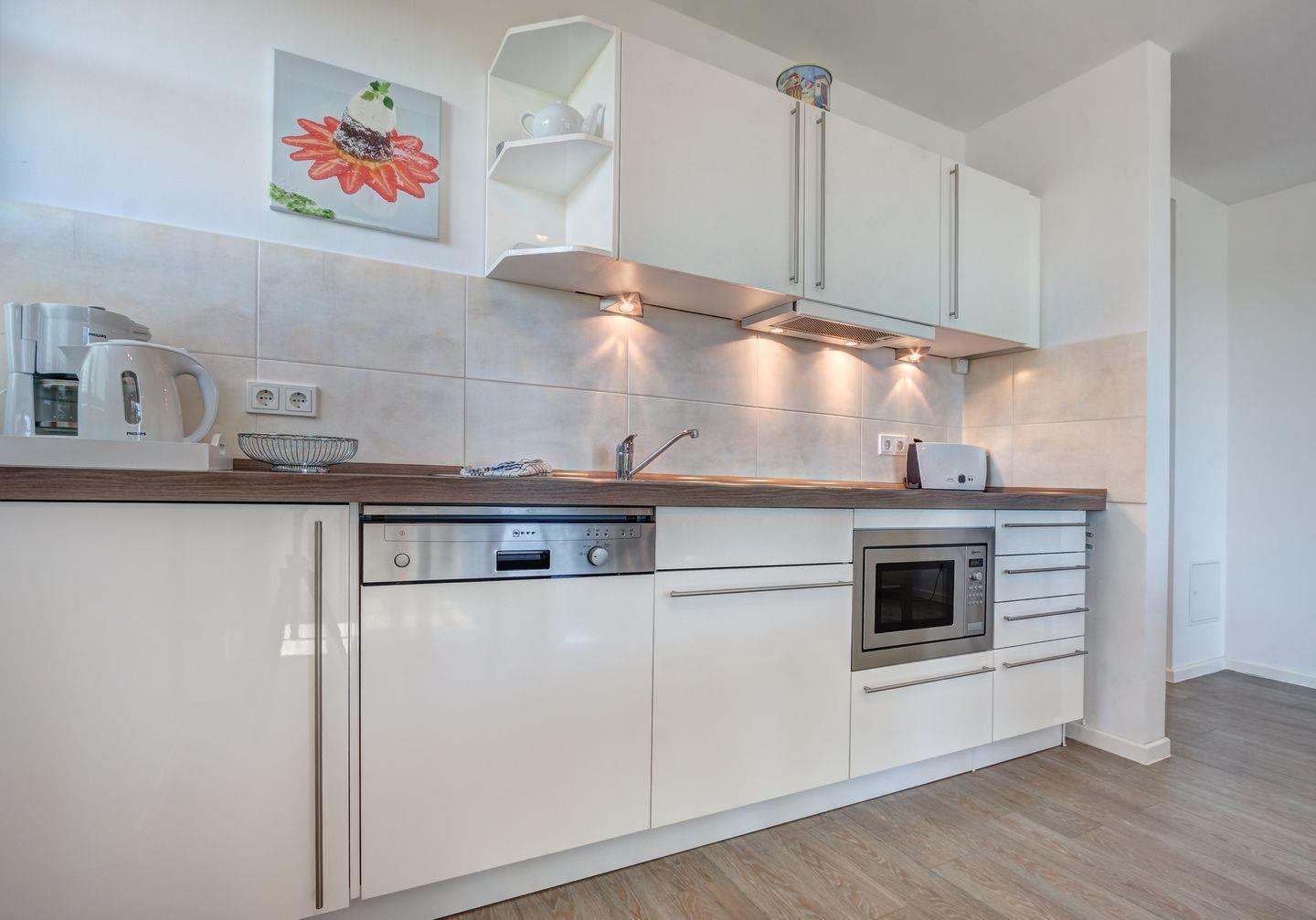 Die 58m² bieten ein gemütliches Schlafzimmer und eine moderne Einbauküche mit Geschirrspüler und Mikrowelle. Die Erdgeschoss-Terrasse macht die Wohnung ideal für Paare.