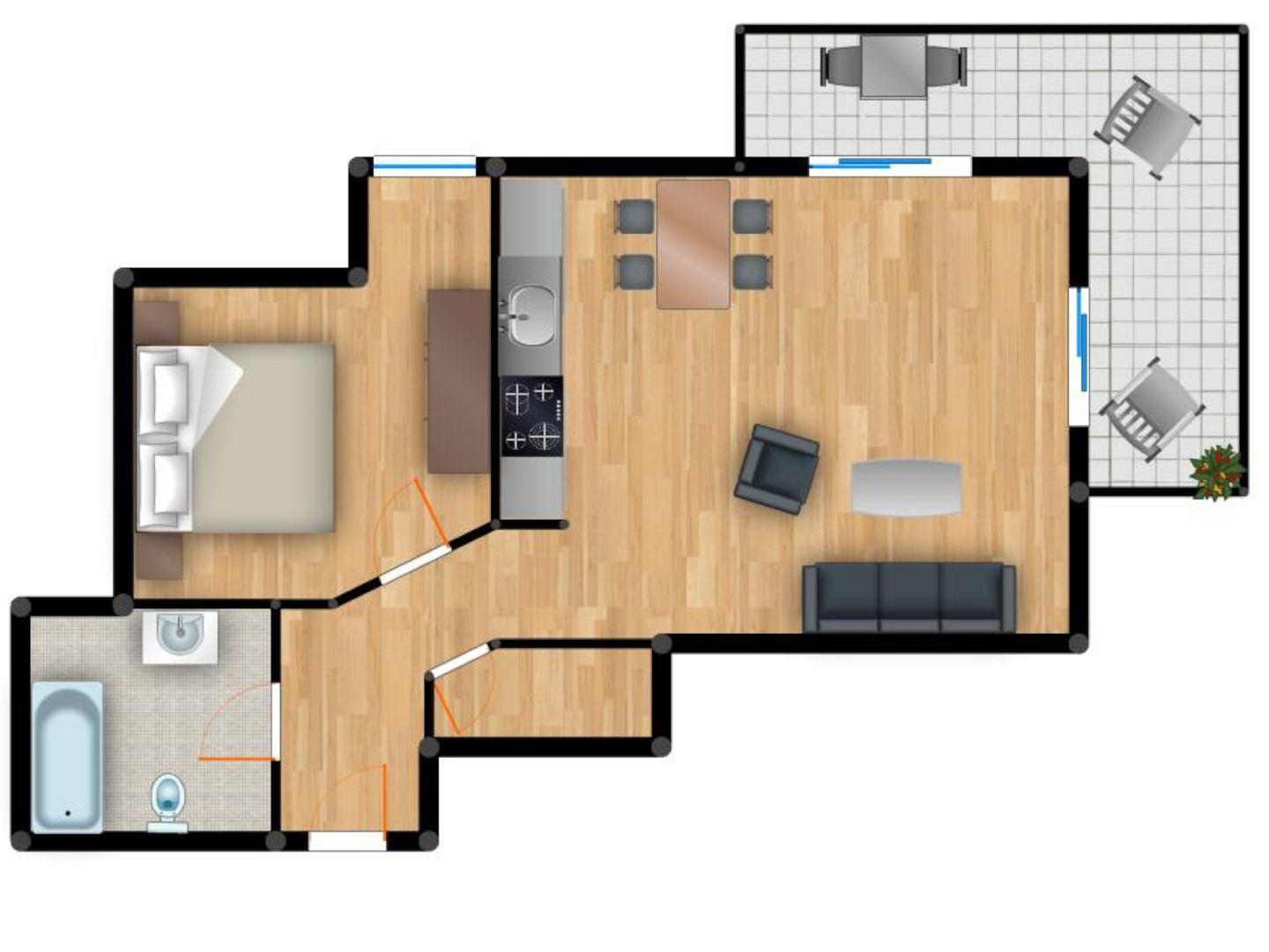 Die mit 5-DTV-Sternen zertifizierte, großzügige 2-Raum-Wohnung verfügt über einen großen Wohn- und Essbereich (ca. 20m²), einen vollwertigen Schlafzimmer und eine große Terrasse im Erdgeschoss.