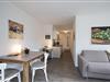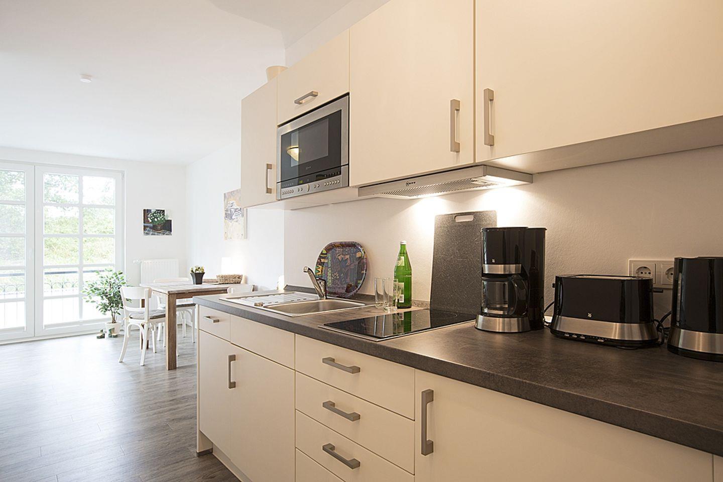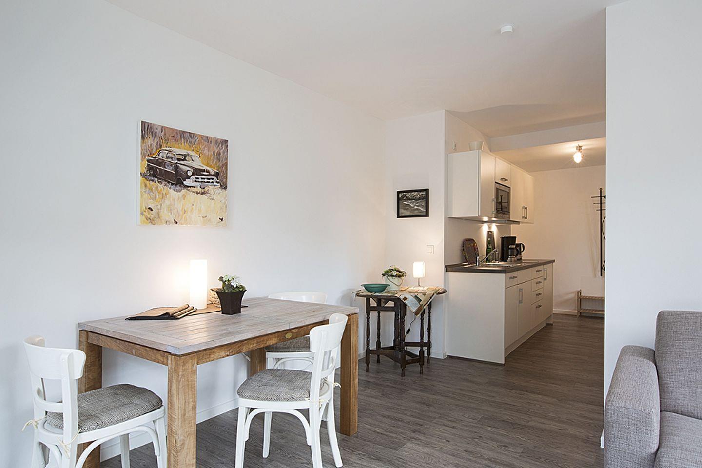Die Wohnung verfügt über ein vollwertiges Schlafzimmer und im großzügigen Wohnraum befindet sich eine hochwertige Schlafcouch. Die vollausgestattete Einbauküche ermöglicht es Ihnen, Ihre kulinarischen Vorlieben zu entfalten. Handgemalte Original-Gemälde schaffen eine besonders gemütliche Atmosphäre in der gesamten Wohnung.