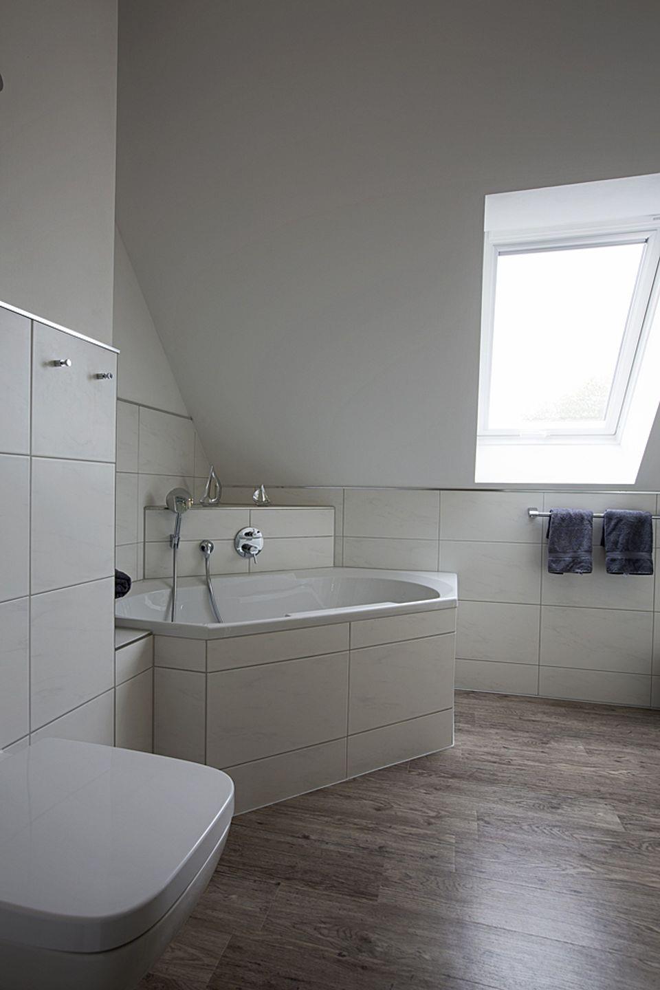 Im Obergeschoss befinden sich zwei Schlafzimmer mit bequemen Doppelbetten, Flachbildfernsehern und ein großzügig gestaltetes Tageslichtbad mit Eckbadewanne und Dusche. Ein Gäste-WC befindet sich im Erdgeschoss.