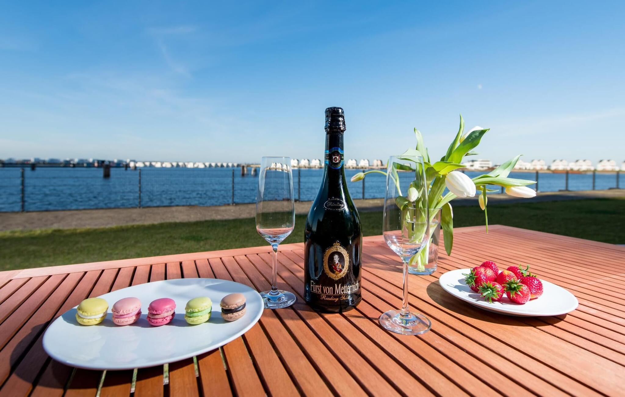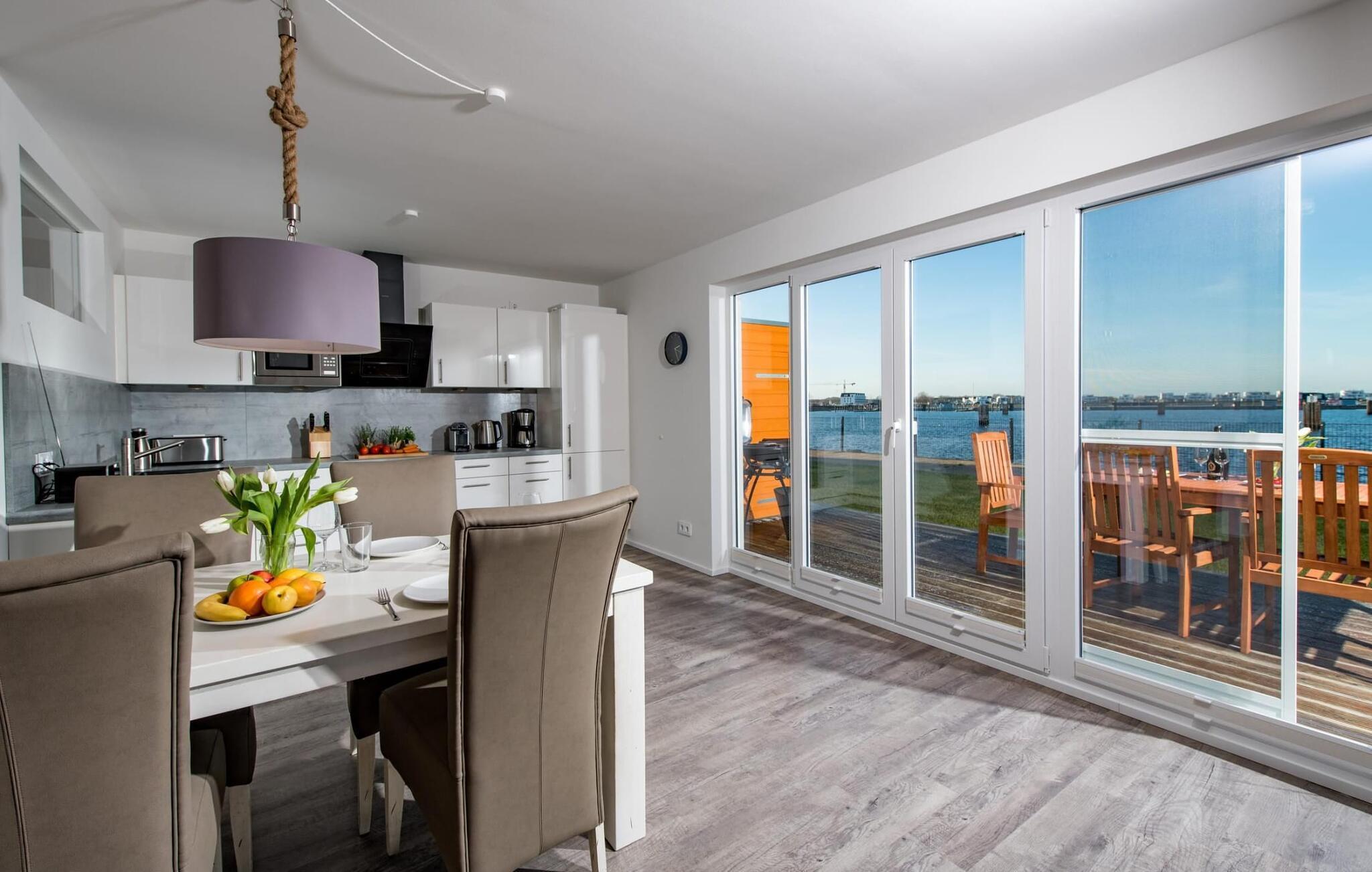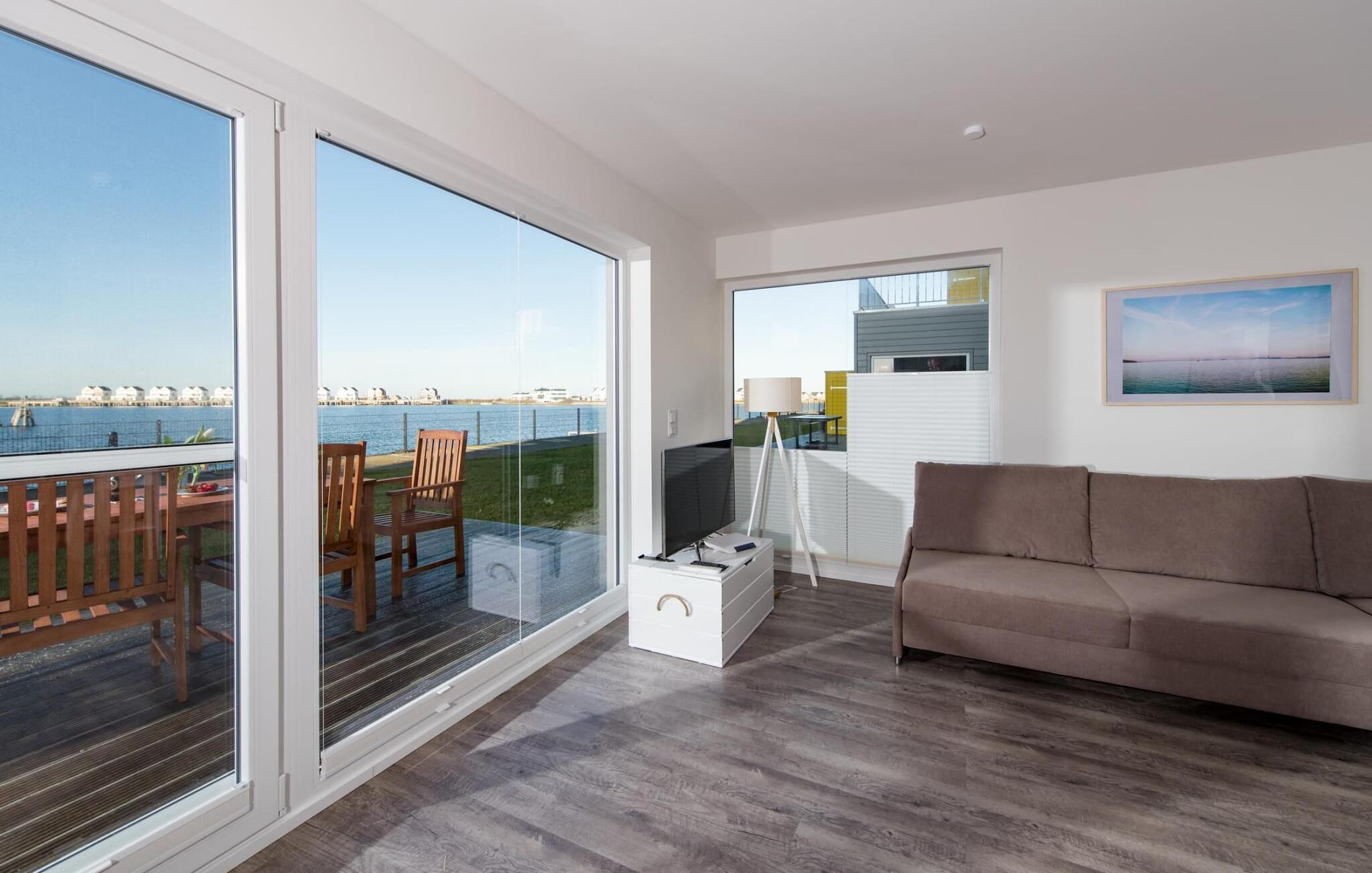 Traumhafte Aussichten eröffnen sich aus dem Wohnbereich und auf der angrenzenden Terrasse mit Blick über die Marina. Hafenkino sorgt hier für Unterhaltung während eines geselligen Grillabends oder romantischen Candle-Light-Dinners bei bilderbuchreifem Sonnenuntergang.