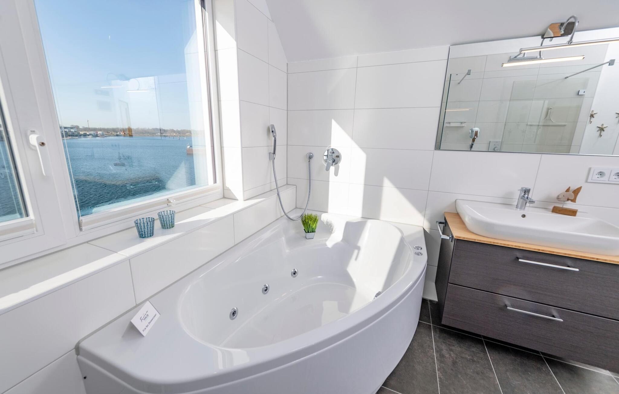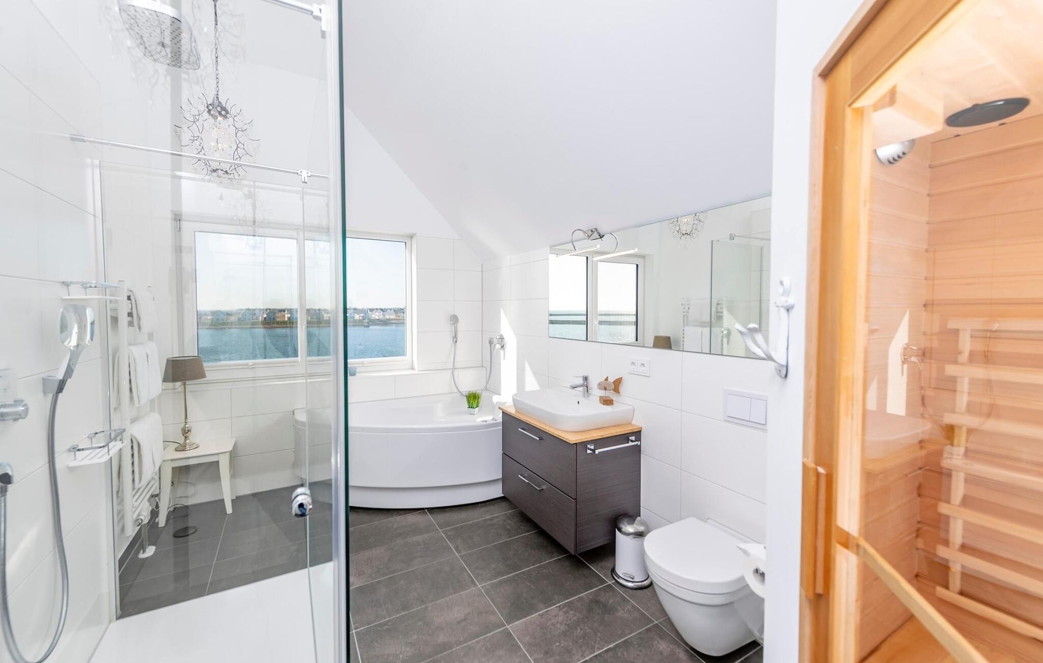 Der private Wellnessbereich lädt zum Entspannen ein: Eine Infrarot Wärmekabine mit Hifi-Sound-System und LED-Farblichttherapie sowie eine große Relax-Whirlwanne mit Wasserblick stehen nach dem Strandspaziergang zum Relaxen bereit.