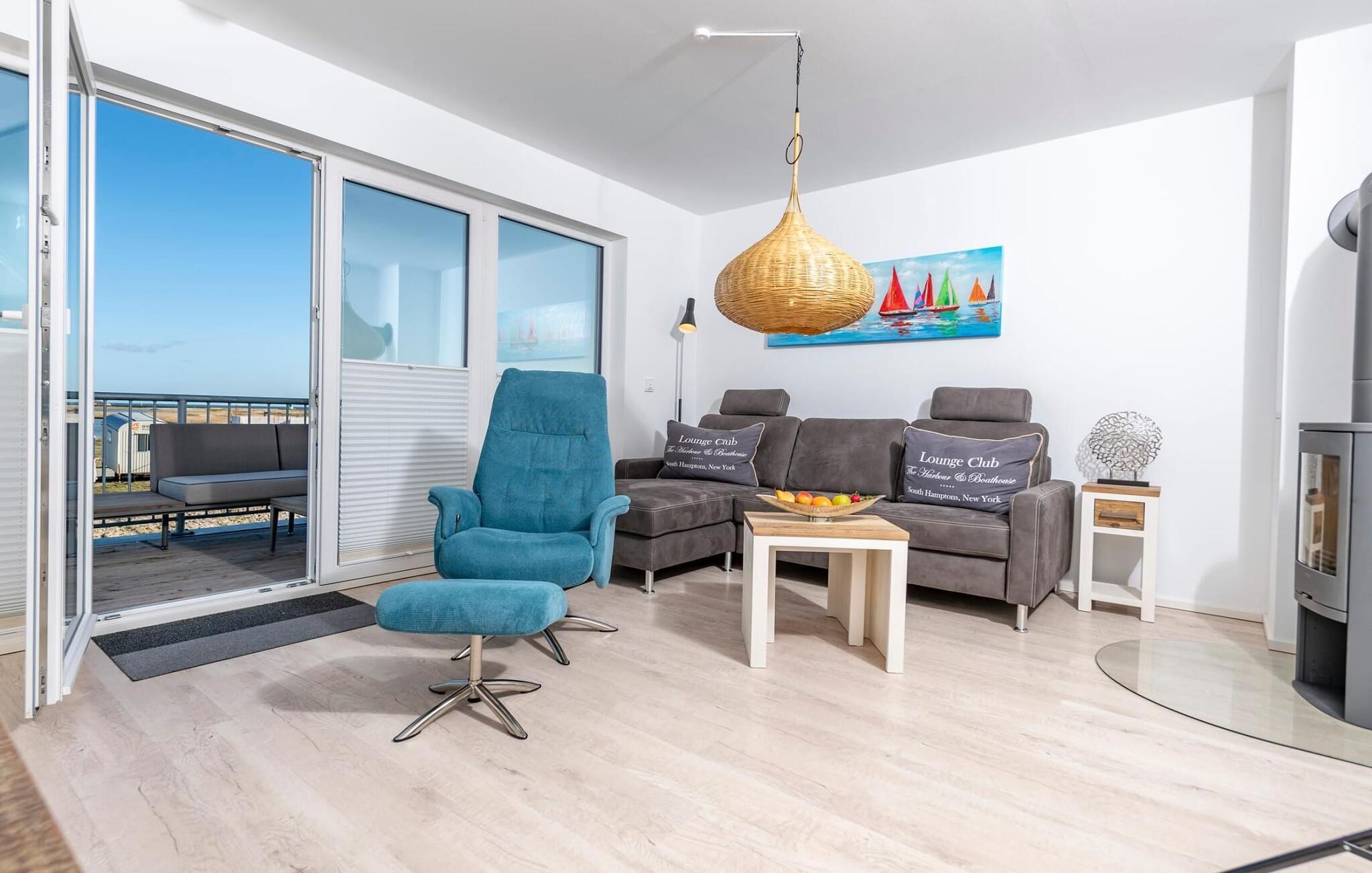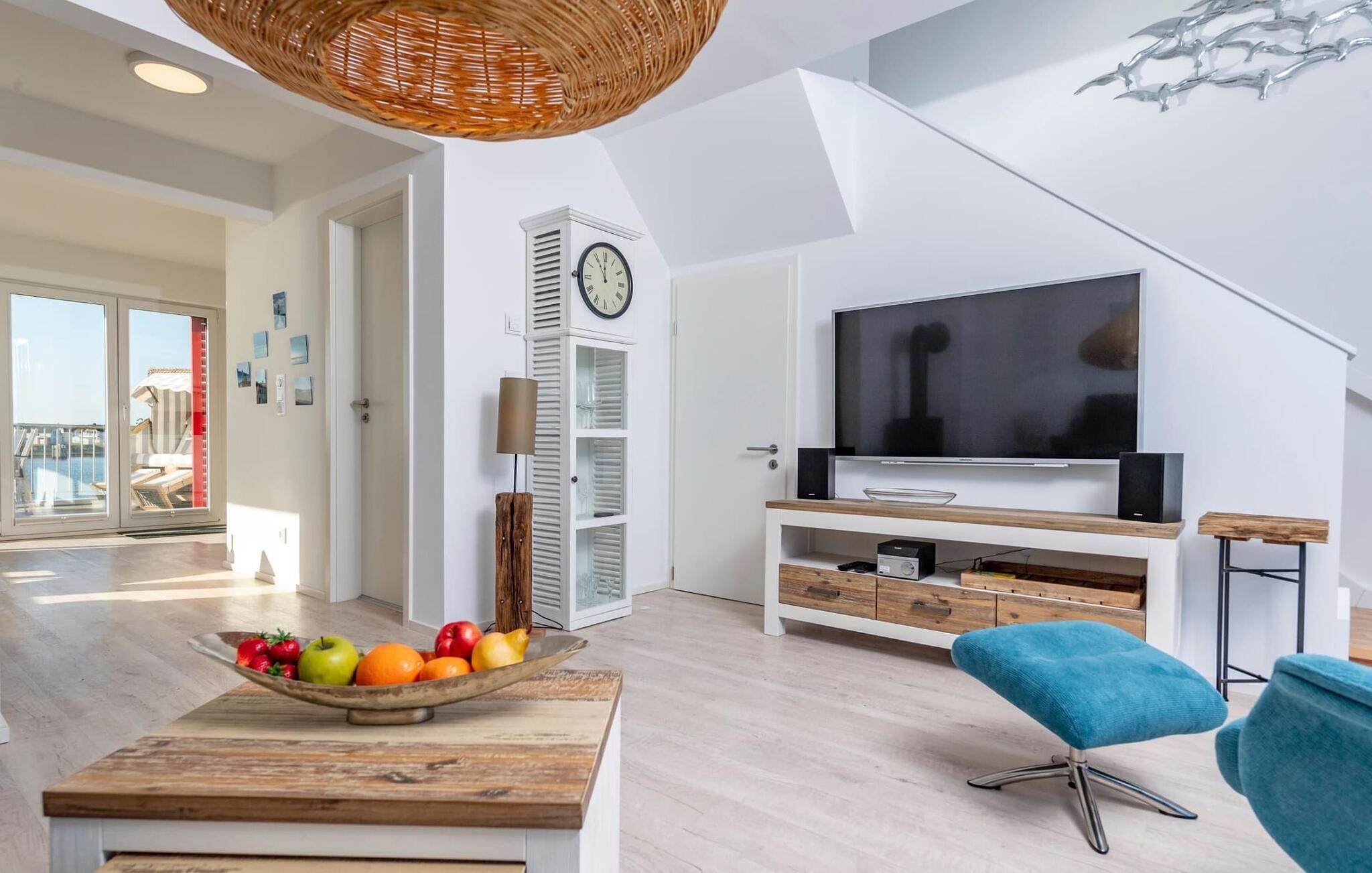 Kuschelig wird es im Wohnzimmer, denn hier lädt eine gemütliche Sitzlandschaft auch an nordischen Schietwettertagen zu einem Kaminabend ein. Für Indoor Entertainment sorgen außerdem SAT-TV und Gesellschaftsspiele.