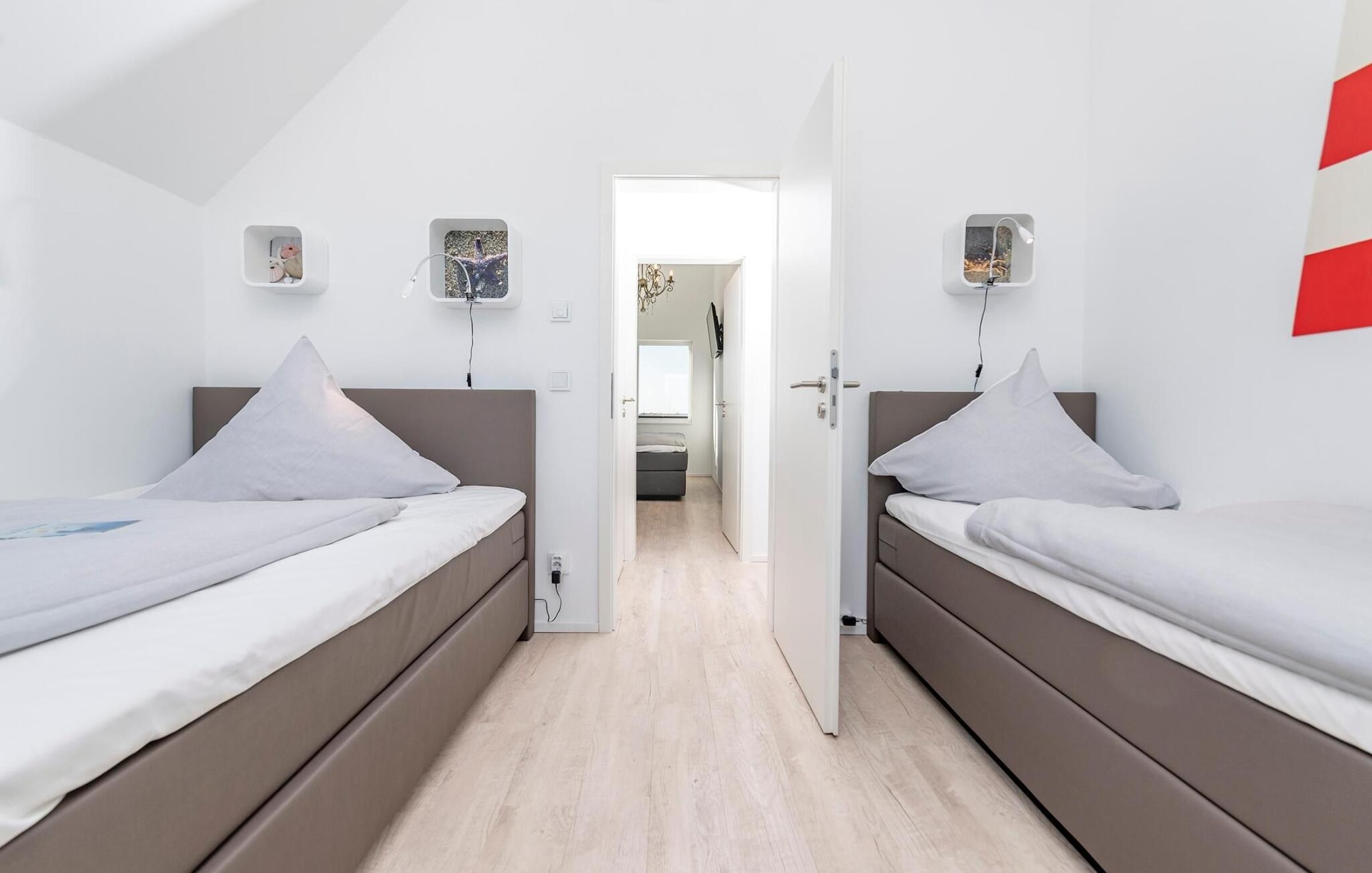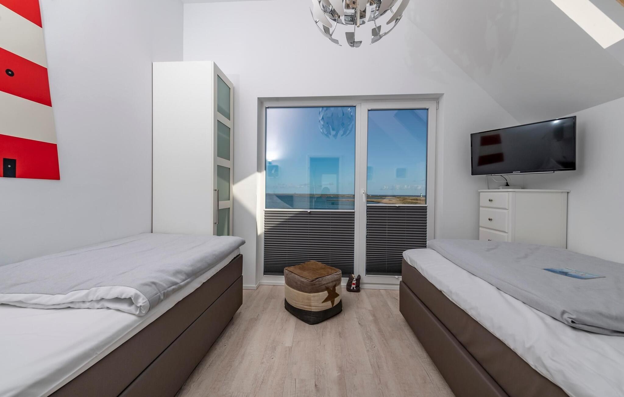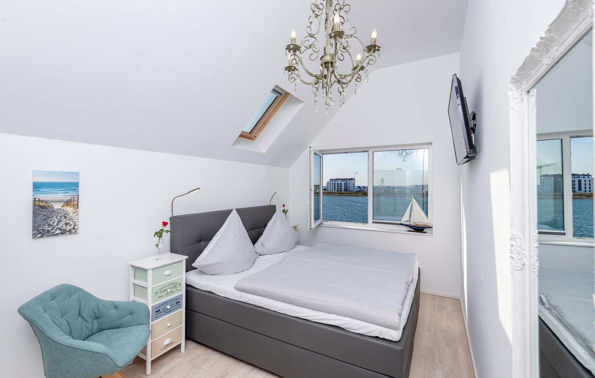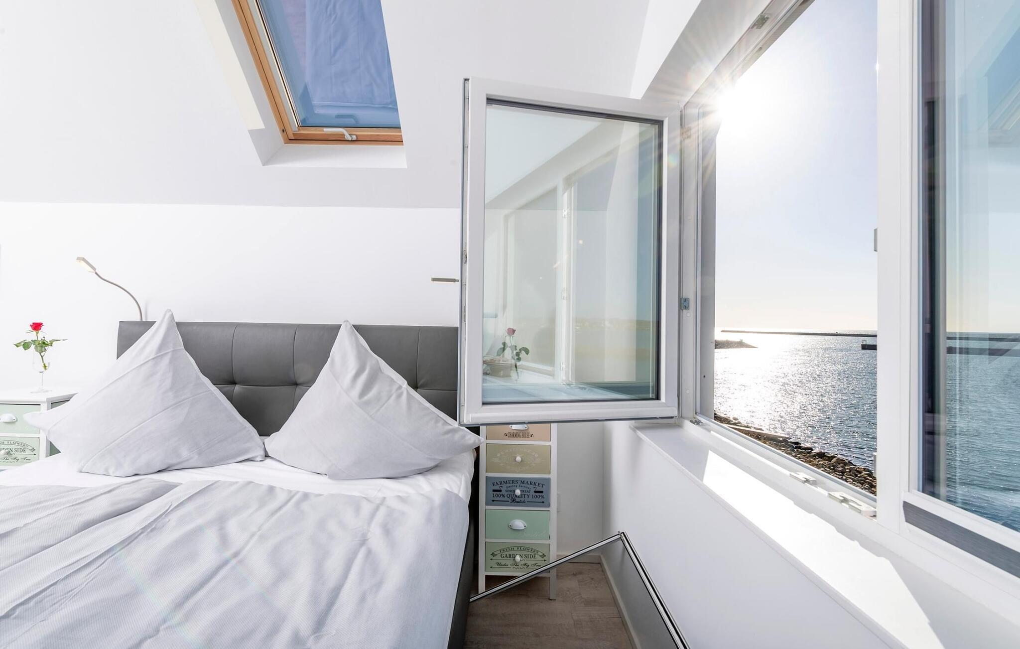 Auf der zweiten Ebene befindet sich der Ruhebereich des Ferienobjekts. Das Hauptschlafzimmer verfügt über einen traumhaften Hafen- und Ostseeblick. Einschlafen unter Sternen, ein Dachfenster erlaubt nicht nur den Blick in den Sternenhimmel, sondern auch in traumhafte Wolkenformationen, die so charakteristisch sind für den Norden sind. Das zweite Schlafzimmer bietet mit einem Doppel- und einem Einzelbett drei weiteren Personen Platz zum Schlafen und Träumen. Beide Schlafzimmer verfügen über einen zusätzlichen TV.