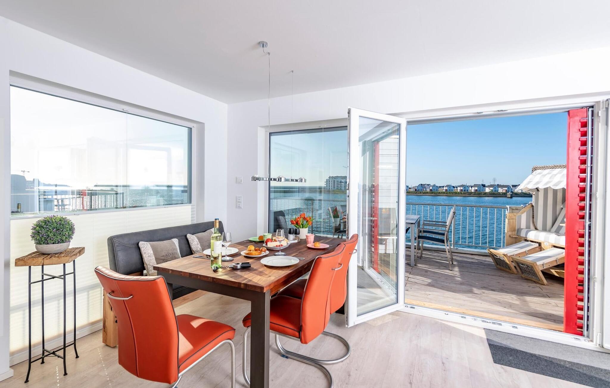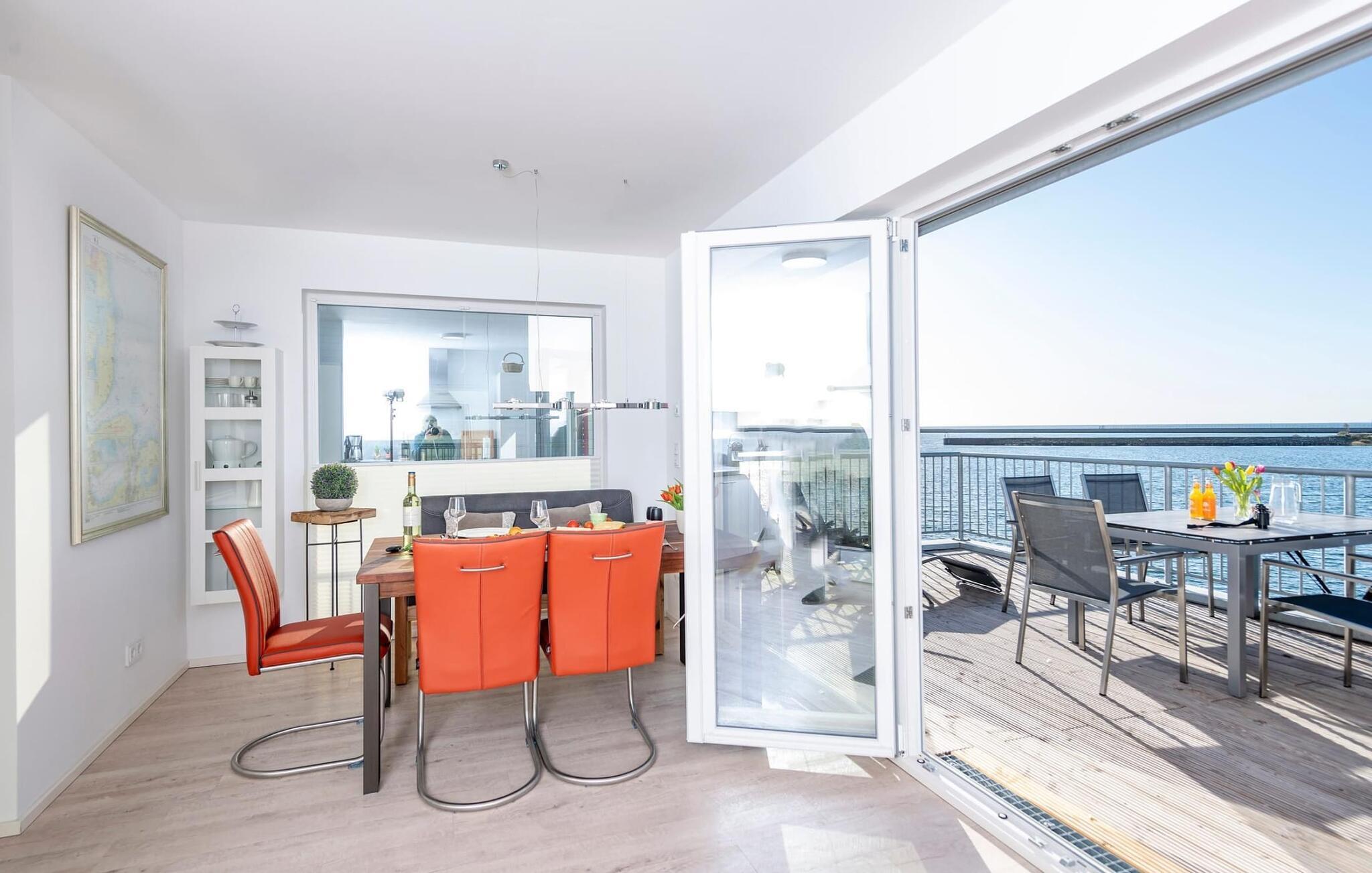 Lichtdurchflutet gestaltet sich der Wohn- /Essbereich der Ferienwohnung mit bodentiefen Panorama-Fensterfronten zu den anliegenden Terrassen auf beiden Seiten. Traumhafte Aussichten eröffnen sich auf der an den Essbereich angrenzenden Terrasse mit Blick über den Segel- und Sportboothafen des OstseeResort Olpenitz und die Ostsee. Ob romantisches Candle-Light-Dinner oder gesellige Grillrunde. Hafenkino ist hierbei garantiert. Eine zweite Terrasse grenzt an den Wohnbereich und ist gen Ostseefjord Schlei ausgerichtet.