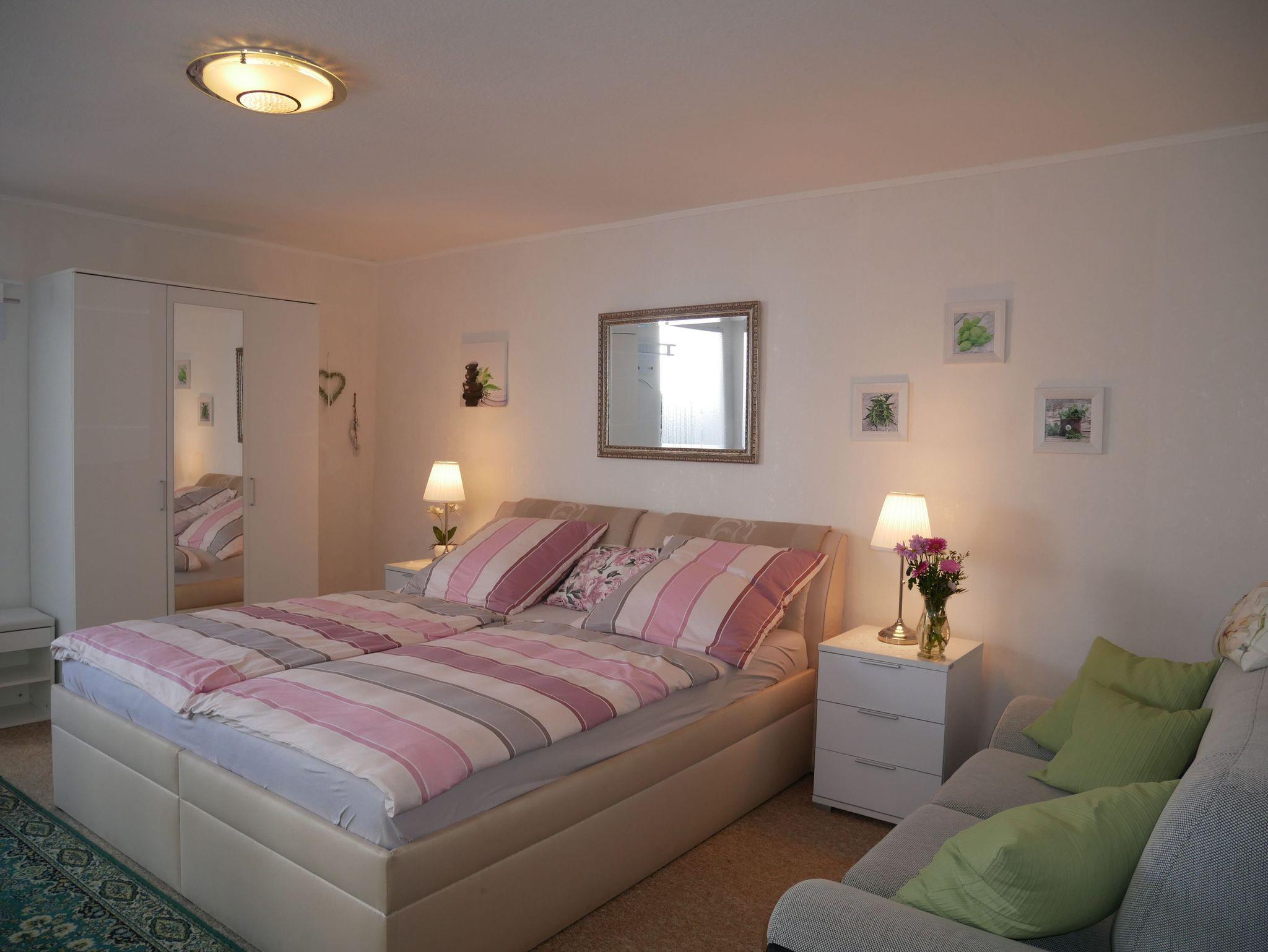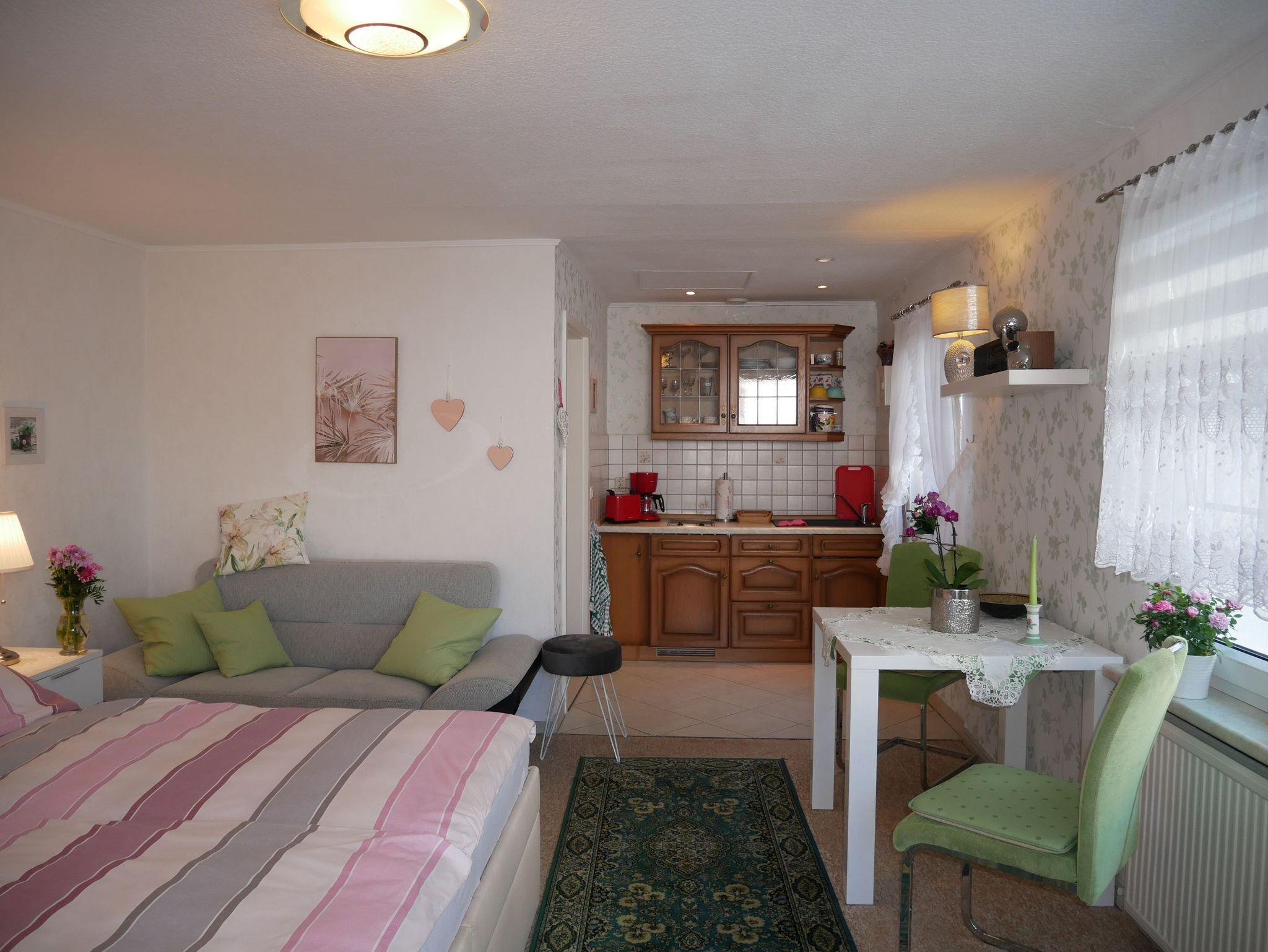 Ausgestattet mit einem hochwertigem Boxspringbett, Kleiderschrank, Schuh/Kofferablage und weichem Teppich im Schlafbereich. Außerdem finden Sie ein gemütliches, kleines Sofa, einen Esstisch mit zwei Stühlen, sowie einen Flachbild-TV an der Wand. Die Küchenzeile bietet Ihnen einen Toaster, Wasserkocher, Kaffeemaschine, Kühlschrank mit Gefriermöglichkeit und ein 2-Platten-Ceranfeld. Im Bad mit Fenster ist eine Dusche mit niedrigem Einstieg, sowie Haartrockner, Seife und Toilettenpapier. Die Erstausstattung Bettwäsche & Handtücher ist inklusive.