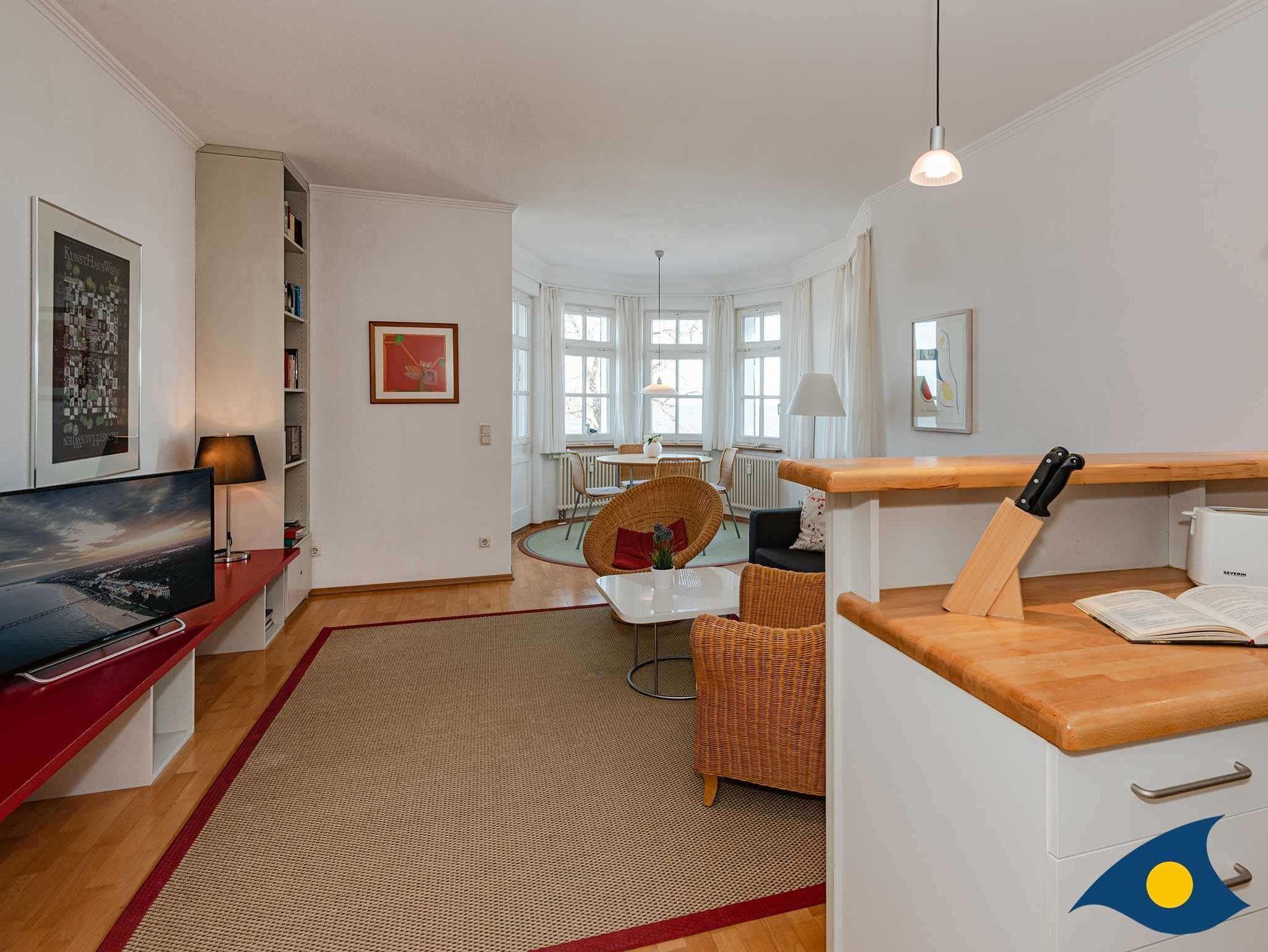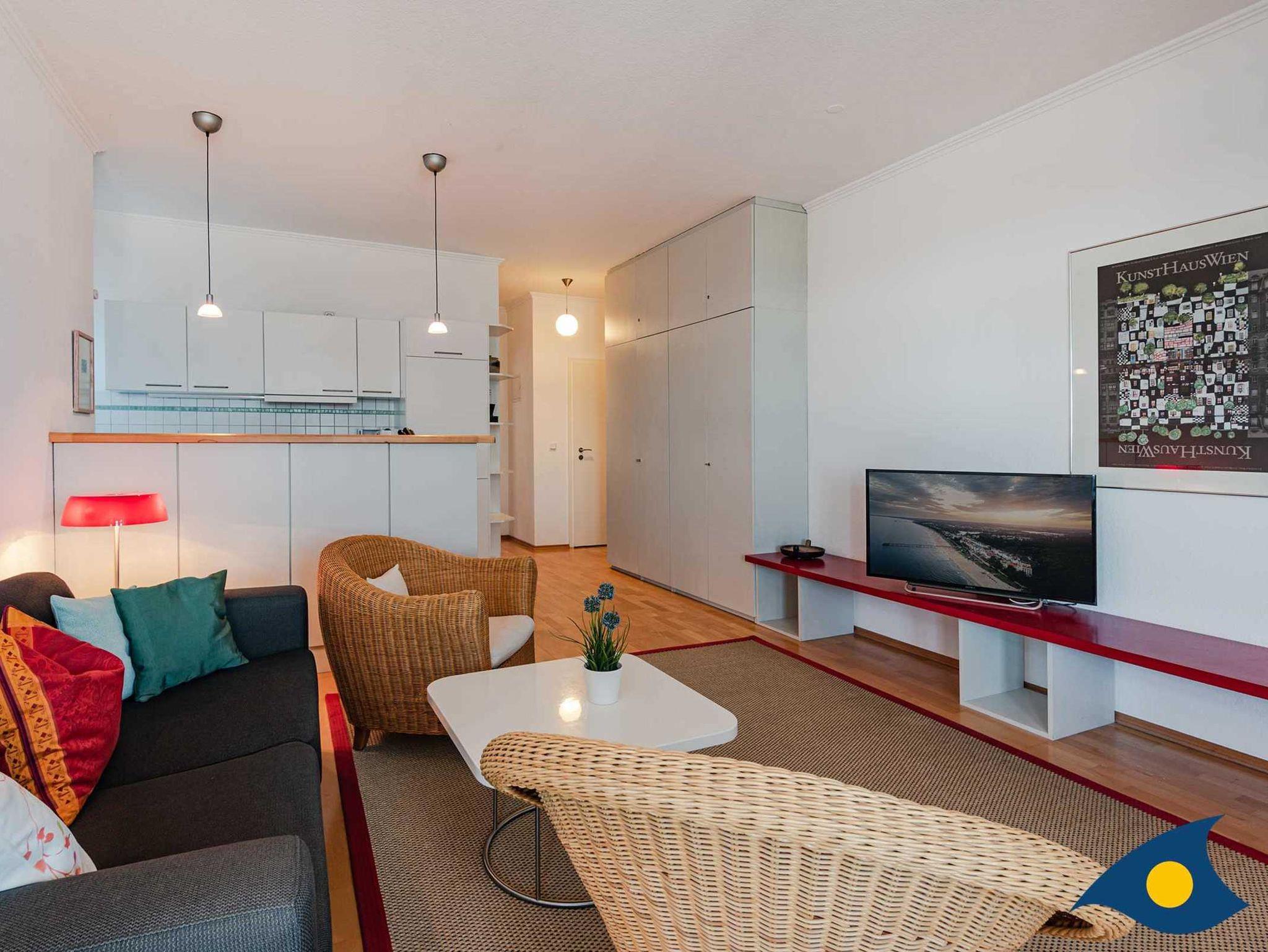 Die Wohnung 14 im 1. OG ist hochwertig und individuell eingerichtet. Vom romantischen Erker bietet sich ein traumhafter Blick über den Strand und die Ostsee. Die Wohnung besteht aus einem großen Wohnraum mit freiem Blick auf das Meer sowie einer offenen Küche mit Theke. Das Schlafzimmer ist hell und freundlich eingerichtet. Im Bad (mit Tageslicht) steht eine ebenfalls hochwertige Ausstattung inklusive einer Runddusche zur Verfügung.