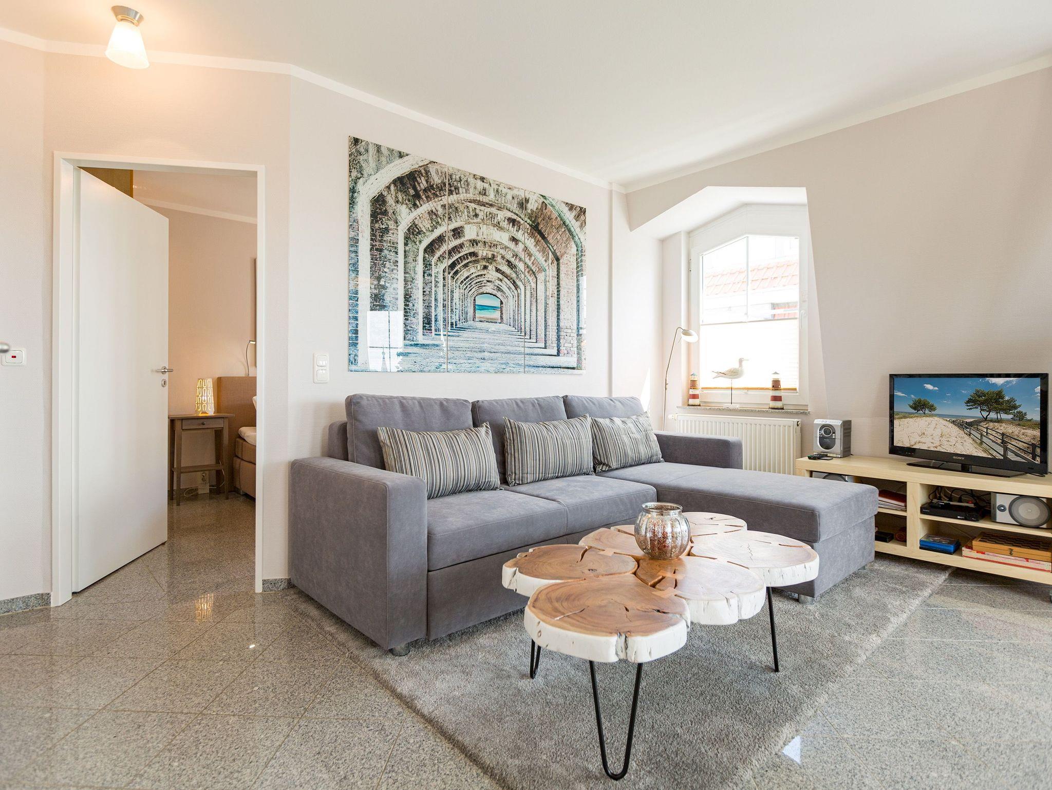 Diese schön gestaltete 2-Raum-Ferienwohnung empfängt Sie in der 3. Etage der Dünenresidenz und bietet Platz für 2 Personen und 1 Kleinkind bis 3 Jahre. Die stilvolle, moderne Möblierung und die geschmackvollen Dekorationen sorgen für einen schönen Urlaub. Der helle, freundliche Wohnbereich mit bequemer Sitzgruppe (Flat-TV, DVD) wird ergänzt durch und eine offene, komplett ausgestattete Küche und den schönen Essplatz im Glaserker. Von hier bietet sich Ihnen ein schöner Blick auf den Schloonsee und auf die Ostsee. Das Schlafzimmer mit Boxspringbett (1,80 m x 2,00m) bietet erholsamen Schlafkomfort. Ein modernes Wohlfühlbad mit WC und Dusche und ein Abstellraum für Ihre Koffer stehen ebenfalls zur Verfügung. Auf dem Südbalkon mit Blick auf Bansin genießt man die Abendsonne, der zweite seitliche Balkon bietet einen schönen Blick auf die Ostsee. Auf Wunsch stellen wir für unsere kleinen Gäste ein Kinderreisebett (ohne zusätzliche Matratze [&] Bettzeug) und einen Kinderhochstuhl (gegen einen Aufpreis) zur Verfügung. Für Ihren Komfort sind die Betten bei der Anreise bezogen und Handtücher liegen bereit.