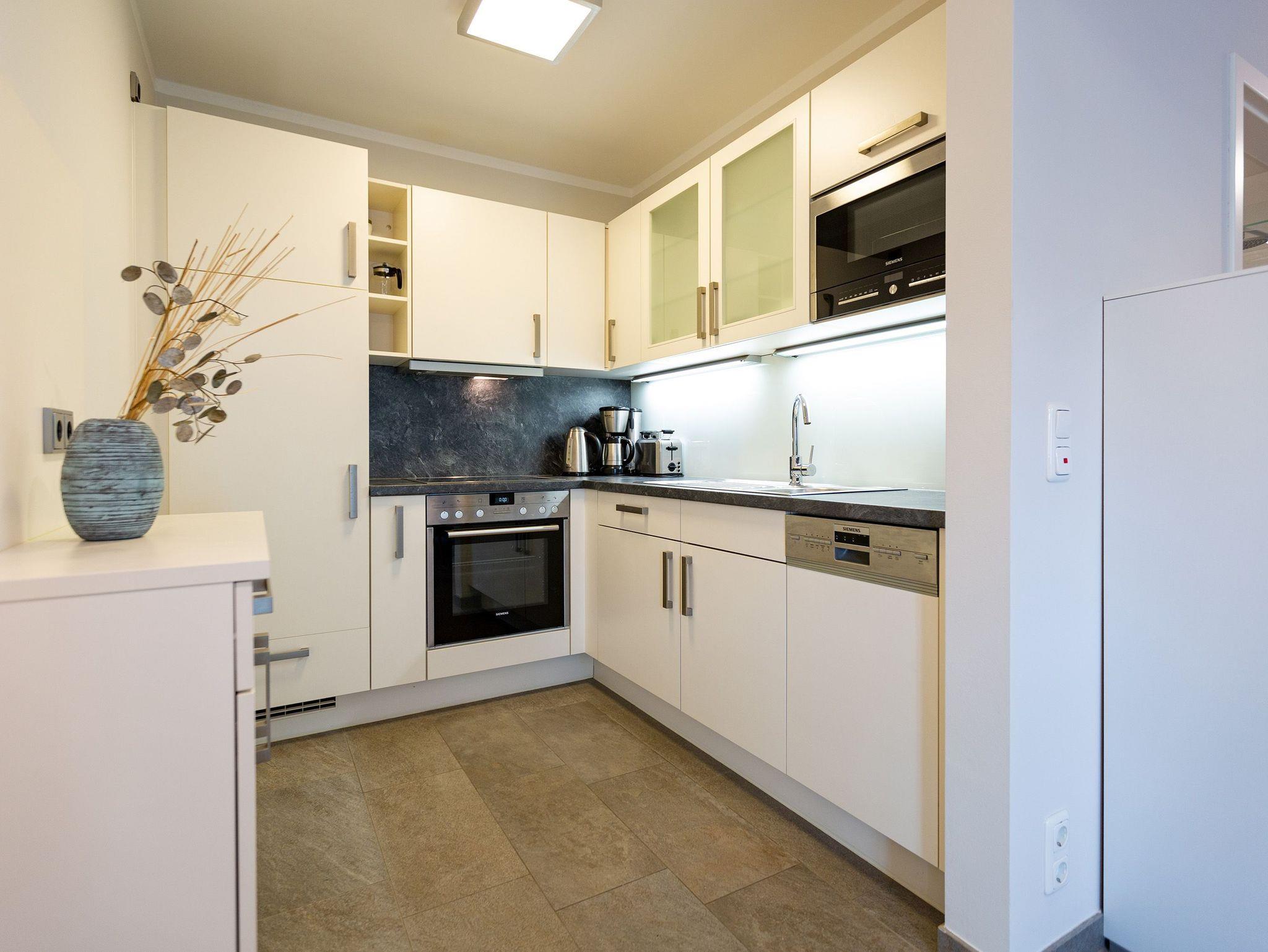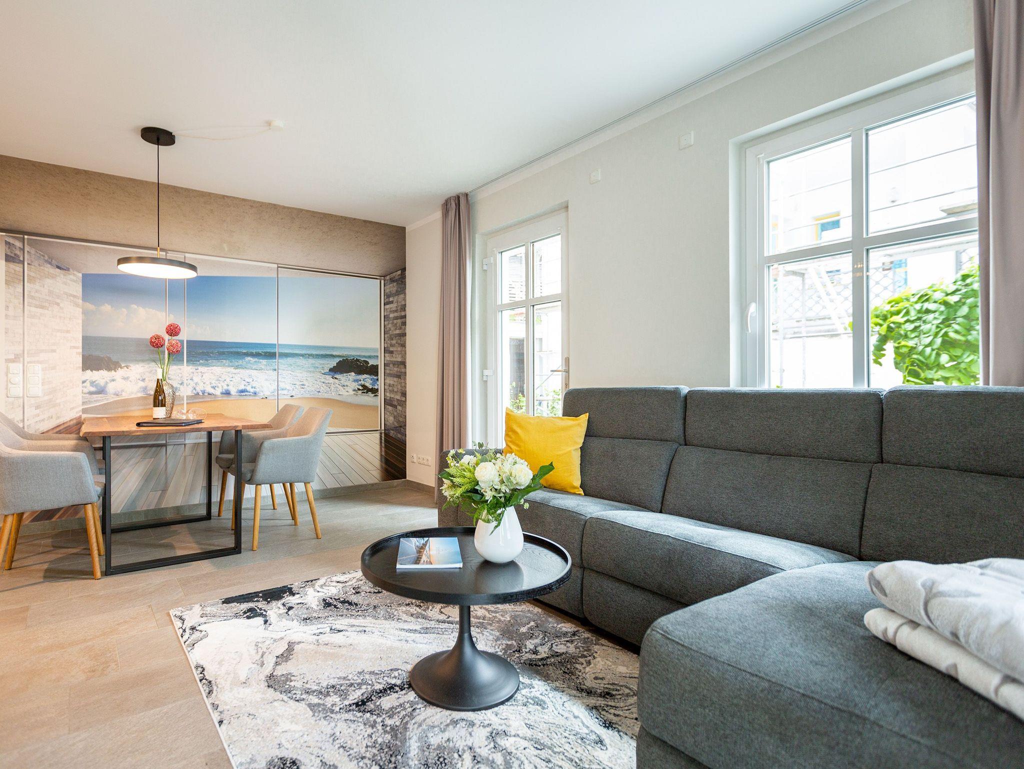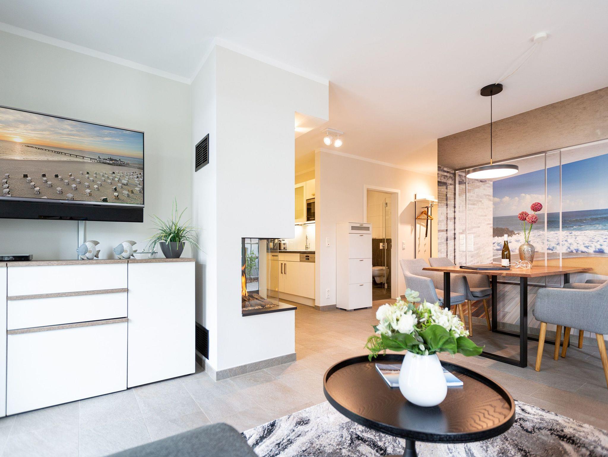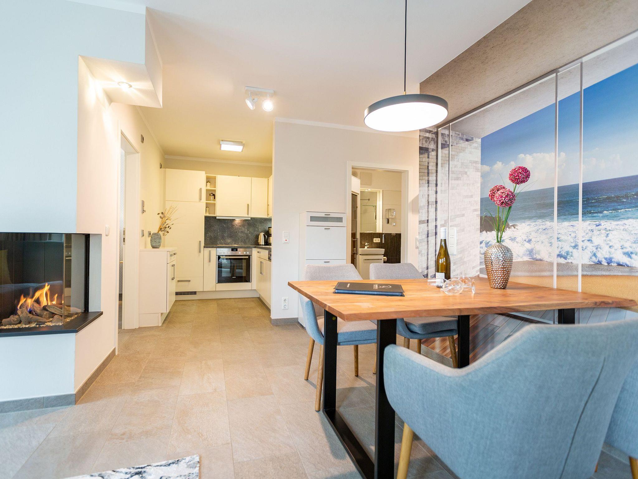 In diesem Appartement fühlen Sie sich direkt wie Zuhause! Eine gemütliche Einrichtung mit viel Liebe zum Detail empfängt Sie auf 61qm und drei Zimmern für bis zu 4 Personen im Erdgeschoss. Der wunderbar offen gestaltete Wohn-Ess-Bereich mit seiner bequemen Sofalandschaft, die sich elektrisch einstellen lässt, lädt zum gemütlichen Beisammensein ein. Ein Flat-TV, Blue-Ray-Player und eine iPod-Docking-Station runden den Wohnraum ab. Das besondere Highlight ist der zweiseitige Gaskamin, den Sie bequem per Fernbedienung steuern können und der seine wohlige Wärme bis zum Essplatz gegenüber versprüht. Die voll ausgestattete Küche (Ceranfeld, Backofen, Kühlschrank mit Gefrierfach, Spülmaschine, Mikrowelle und Kleinküchengeräte) lässt beim Zubereiten Ihrer Speisen keine Wünsche offen. Die gemütliche Süd-Terrasse mit Essplatz lädt Sie ein Ihren Abend draußen ausklingen zu lassen. Zwei Schlafzimmer mit Boxspringbetten (1,80m x 2,00m) bieten ausreichend Schlafmöglichkeiten für eine Familie oder befreundet reisende Pärchen. Ein Flat-TV jeweils darf hier nicht fehlen. Für zusätzliche Entspannung sorgt die Finnische Sauna im Masterbad. Echtglasdusche, Waschtisch und WC runden das Masterbad ab. Ein zusätzliches Gäste-WC steht Ihnen darüber hinaus ebenso zur Verfügung. Kostenfreies WLAN und ein Pkw-Stellplatz am Haus runden dieses Appartement ab.[nbsp]