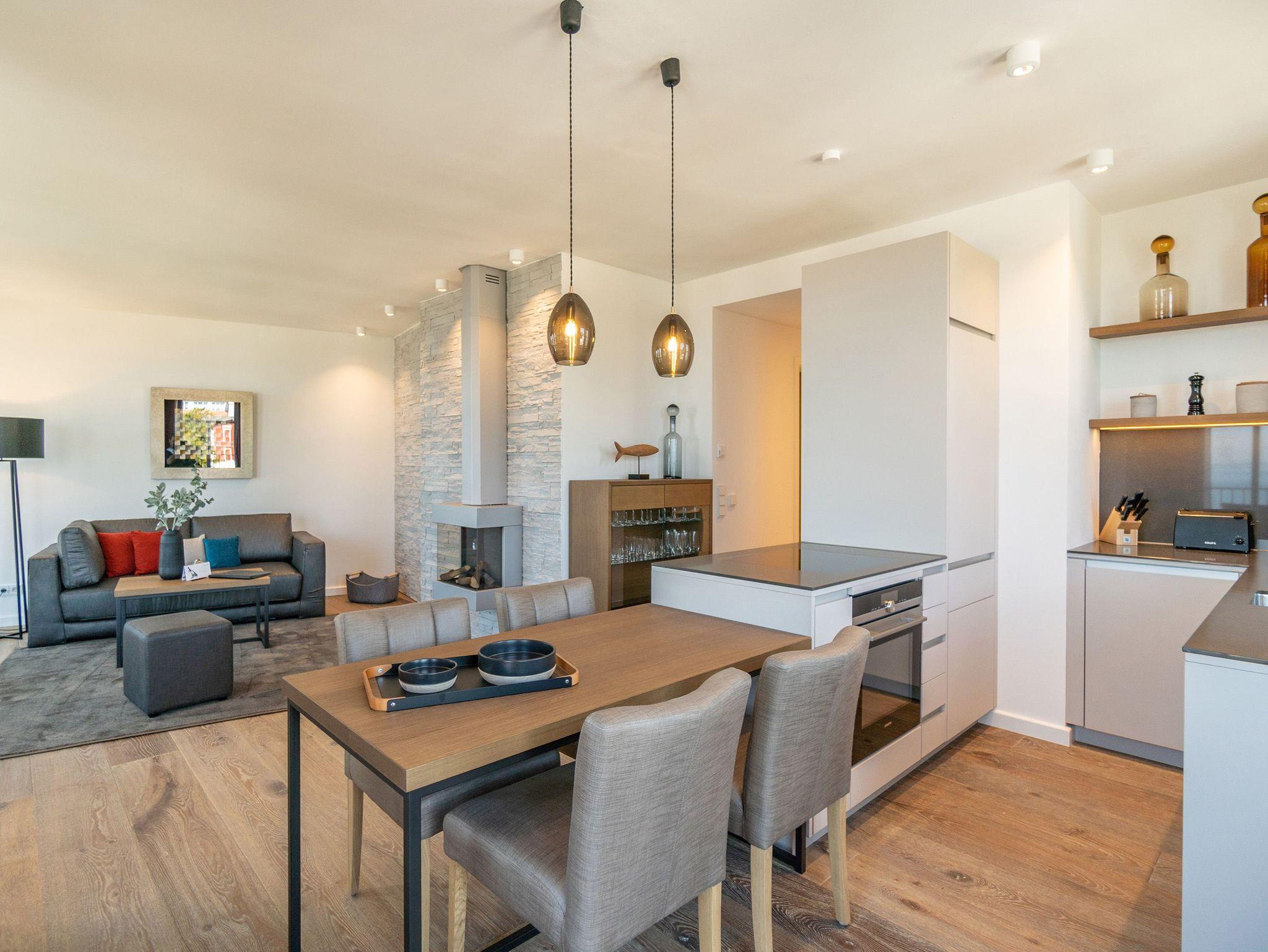 Mehr Meer geht nicht! Denn in dieser wunderschönen und großzügigen, 82 Quadratmeter großen Ferienwohnung in der 3. Etage des Beachhouse wohnen Sie unmittelbar am Meer. Bis zu vier Ostsee-Sehnsüchtige und ein Kleinkind bis drei Jahre (im Kinderreisebett) haben hier direkten Blick auf das endlose Blau. Auf dem umlaufenden Balkon (14 Quadratmeter groß) mit Nord-West-Ausrichtung können Sie die Ostsee sehen, riechen, fühlen ? einfach mit allen Sinnen genießen. Ein Urlaubsparadies der Extraklasse erwartet Sie mit allem Wohnkomfort, den Sie sich nur wünschen können. Die drei Räume sind elegant und zeitlos von Designerhand eingerichtet. Ein geräumiges Wohn-Esszimmer ist der Mittelpunkt des Domizils. Licht und hell besticht es durch seine großen, bodentiefen Fenster und die stylische Einrichtung. Der dezent lachsfarbene Akzent wirkt harmonisierend. Ein Sofa und ein bequemer Schaukelstuhl laden zum Faulenzen und Relaxen vor dem Flat-TV oder dem Flammenspiel des Gas-Kamins ein. Eine Bose-Musik-Anlage mit Bluetooth sorgt für einwandfreien Sound. Das WLAN ist kostenfrei. Der Esstisch mit den vier Stühlen ist bestens für gemeinsame Essen geeignet. Leckere Gerichte kochen, das geht in der offenen Küche ganz einfach. Vollausgestattet birgt sie sämtliche Geräte, die man für die Zubereitung feiner Speisen oder leckerer Brunches brauchen kann. Ob Geschirrspüler, Herd, Backofen oder Kaffeemaschine ? alle sind hochwertige Markengeräte. In den Schränken befindet sich zudem edles Geschirr. Die Liebe zum Detail ist in allen Ecken dieser Wohnung spürbar ? im Lampendesign genauso wie in den Accessoires. Und überall haben Sie die Ostsee im Blick. In den beiden Schlafzimmern warten komfortable Boxspringdoppelbetten (1,80 m x 2,00 m) darauf, Ihnen süße Träume zu schenken. Beide Schlafzimmer verfügen über einen Flat-TV und einen Schrank mit viel Ablagefläche. Das Masterbad ist mit einer Finnischen Sauna ausgestattet. Hier können Sie ganz privat abschalten und mal so richtig ins Schwitzen kommen. Außerdem gibt es eine Regendusche, einen Waschtisch mit Fön und beleuchtetem Spiegel sowie ein WC. Das zweite Badezimmer verfügt ebenfalls über eine ebenerdige und geräumige Regendusche, einen Waschtisch und ein WC. In einem separaten Hauswirtschaftsraum steht ein Waschtrockner zu Ihrer Verfügung. Für eine entspannte Auszeit sind die Betten bei Ihrer Ankunft bezogen und Handtücher liegen bereit. Für Ihr Auto ist der Stellplatz Nr. 19 in der Tiefgarage reserviert.