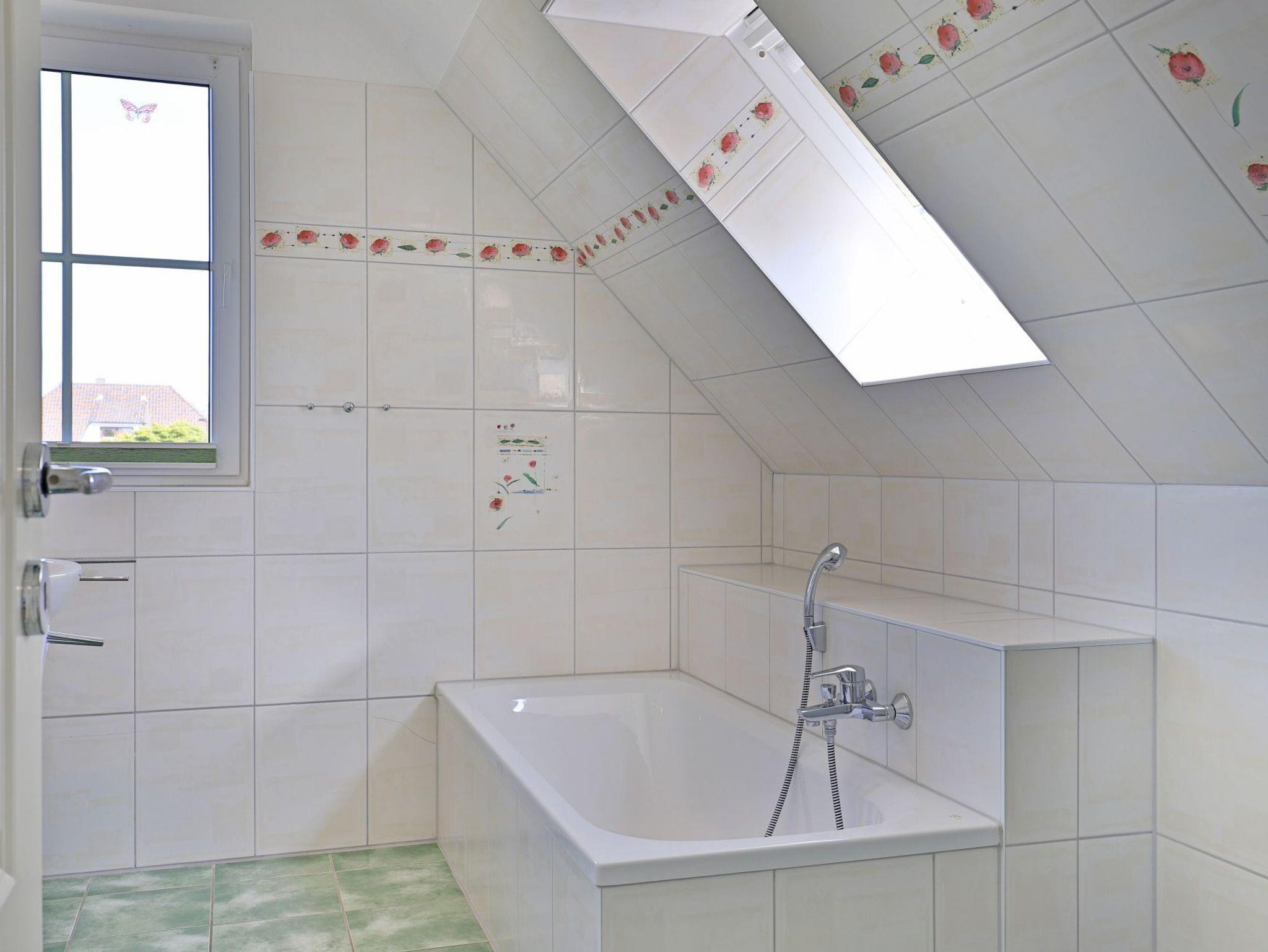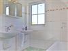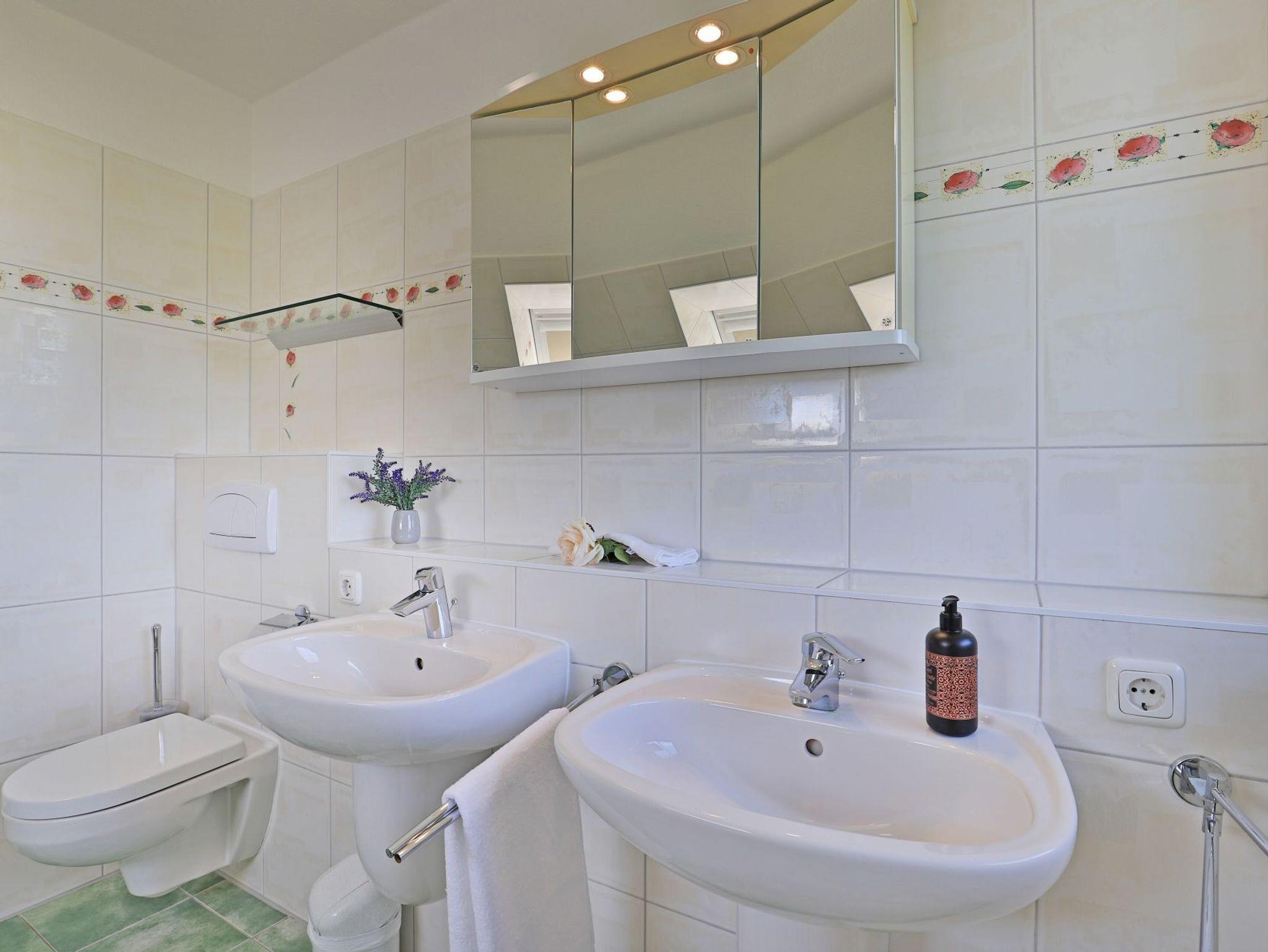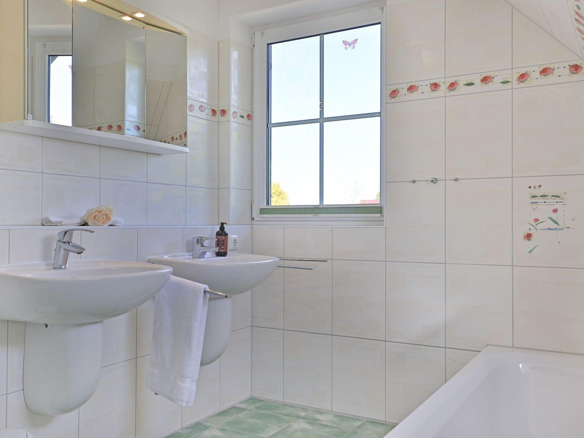 Ein großes Wannenbad mit Fenster, zwei Waschtischen und WC ist ebenfalls vorhanden.