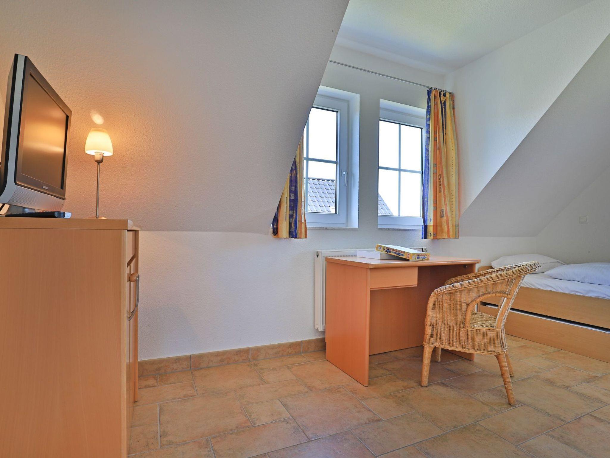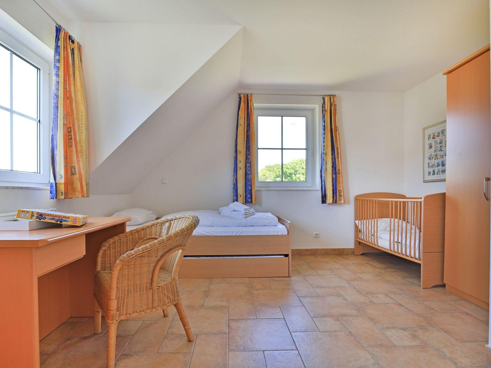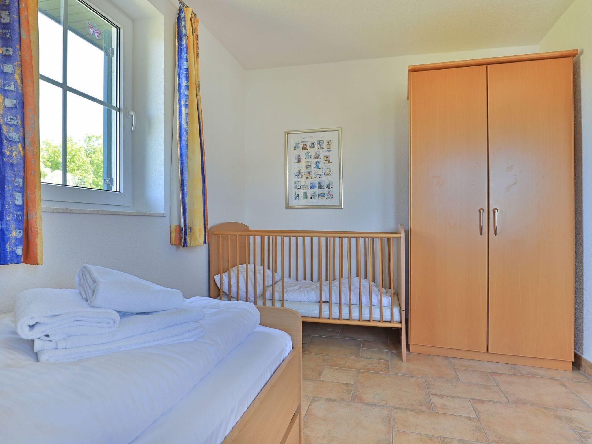 Schlafzimmer 3- mit Einzelbett als Ausziehbett für 2 Personen, Kleiderschrank, Kinderbett, Fernseher.