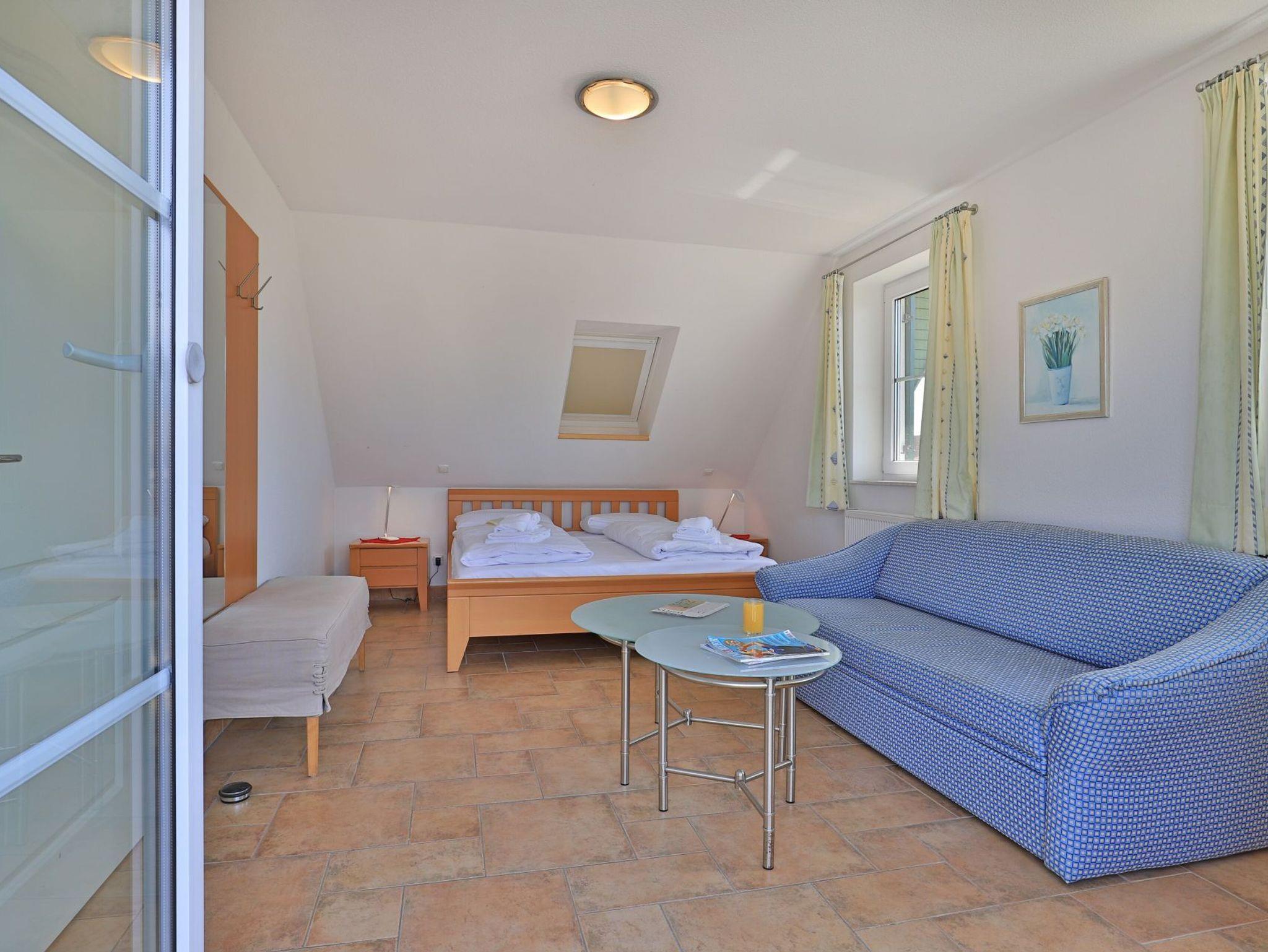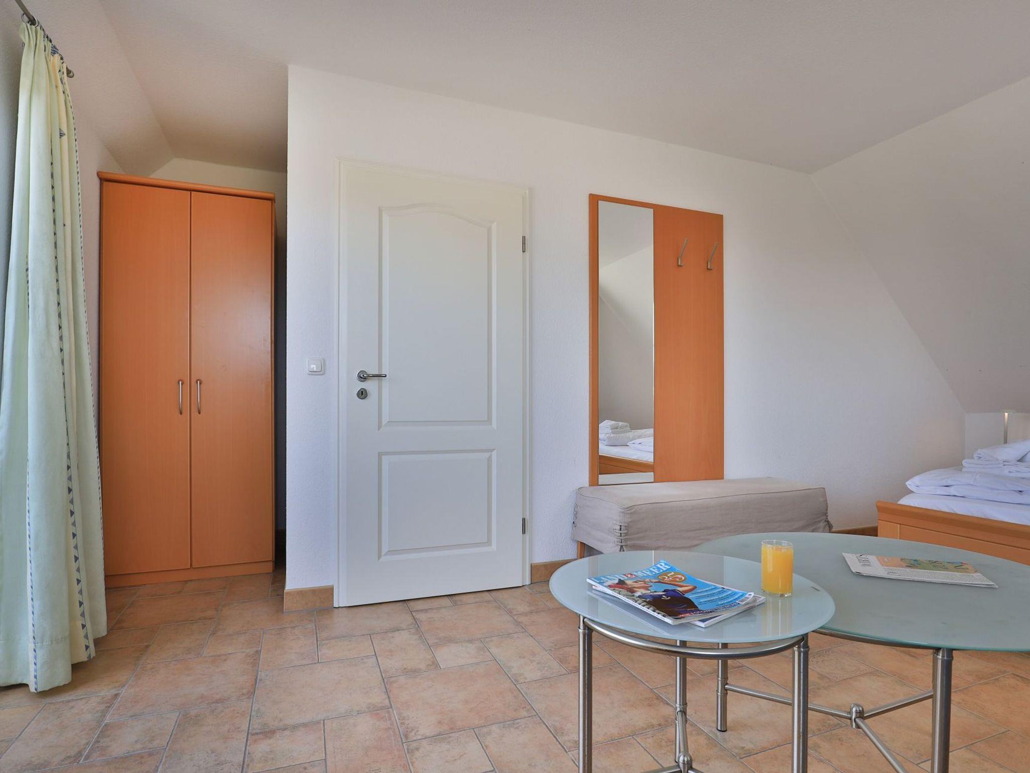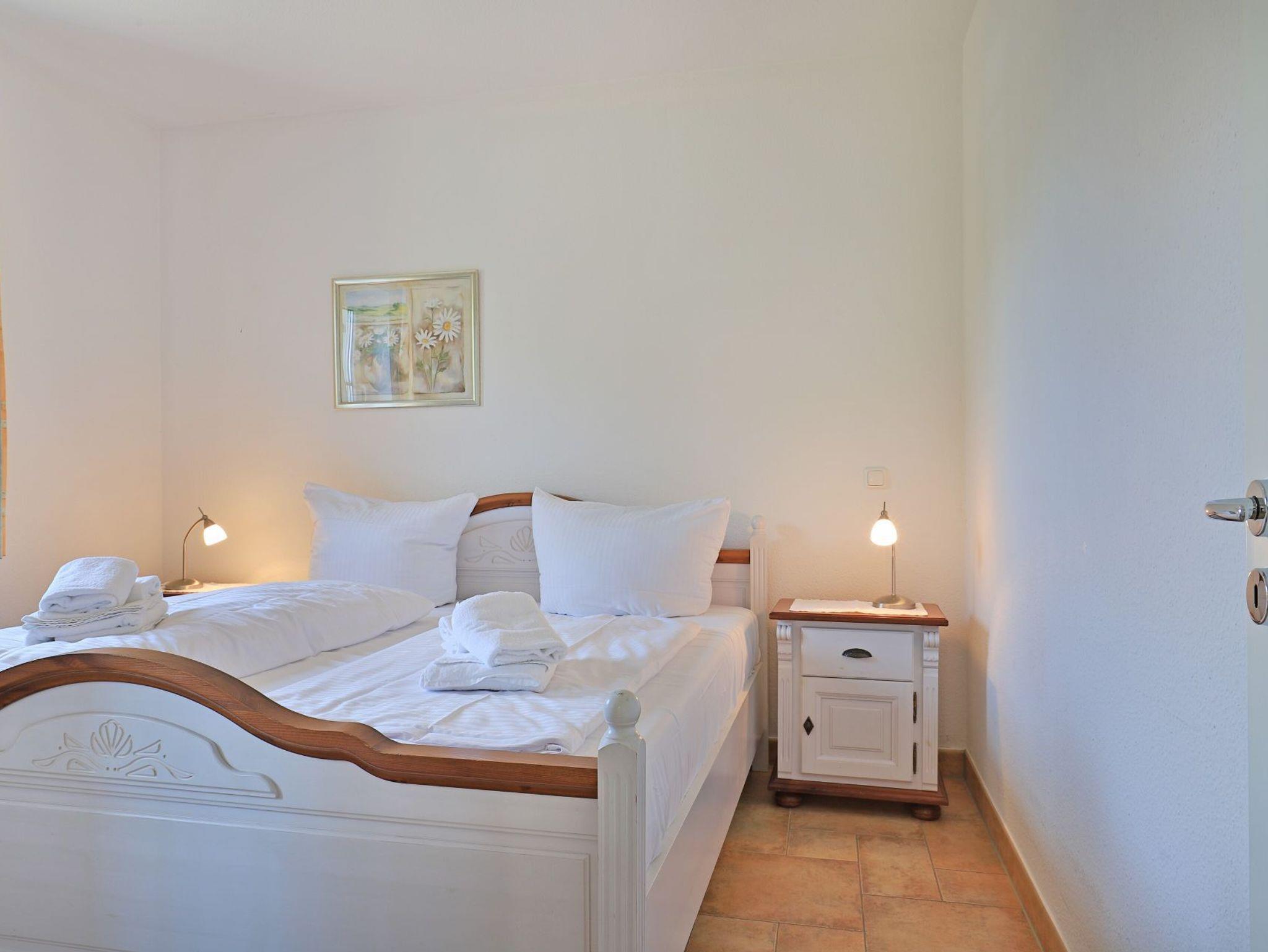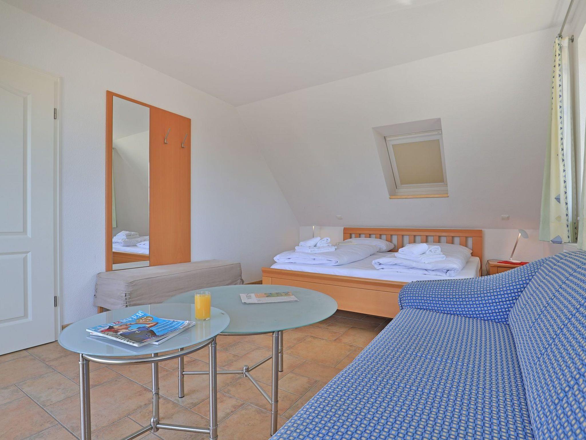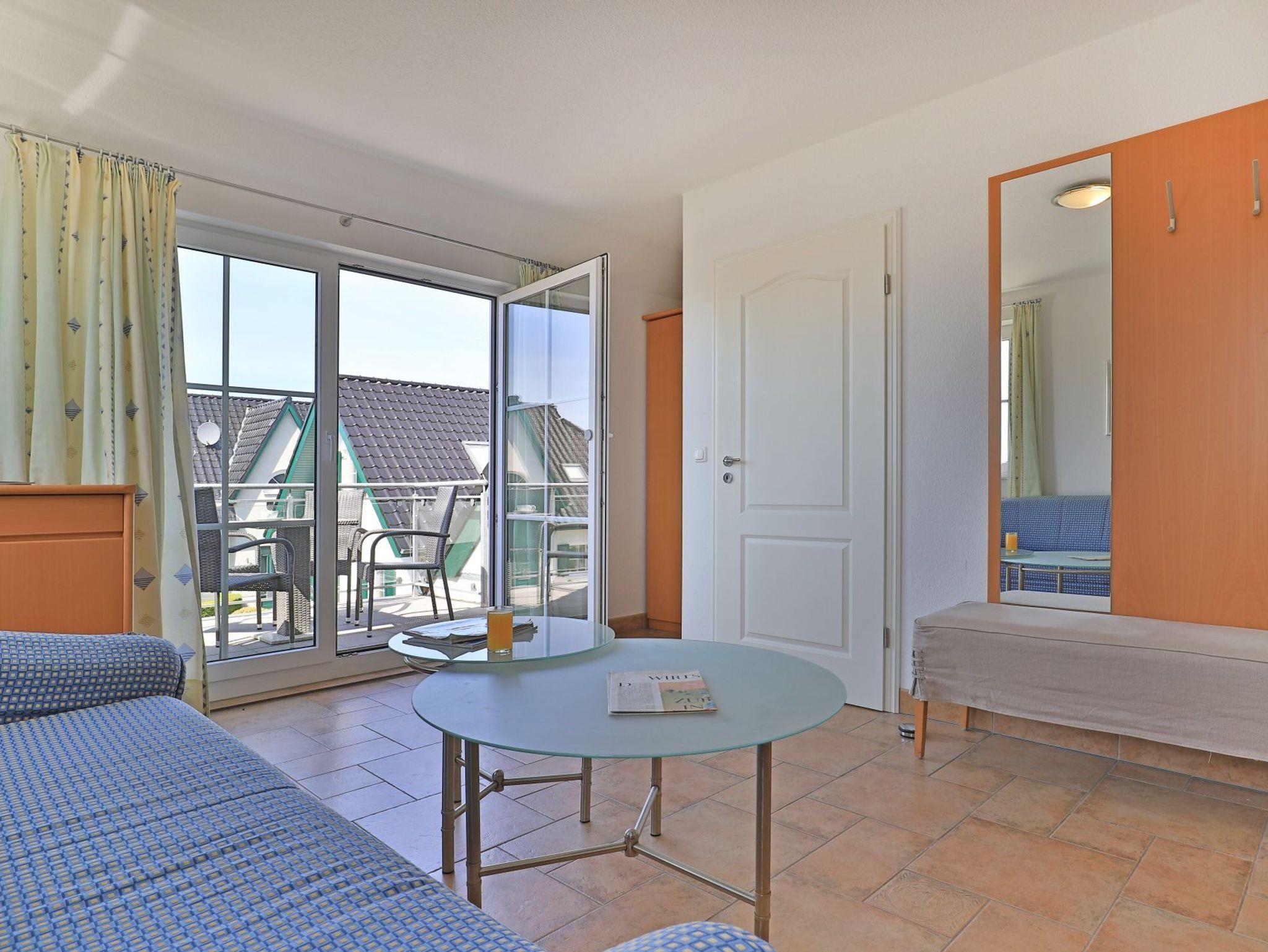 Schlafzimmer 2- mit Doppelbett, Kleiderschrank, Schlafsofa (70x150cm), Beistelltisch sowie Zugang zum Balkon mit Blickrichtung Ostsee.