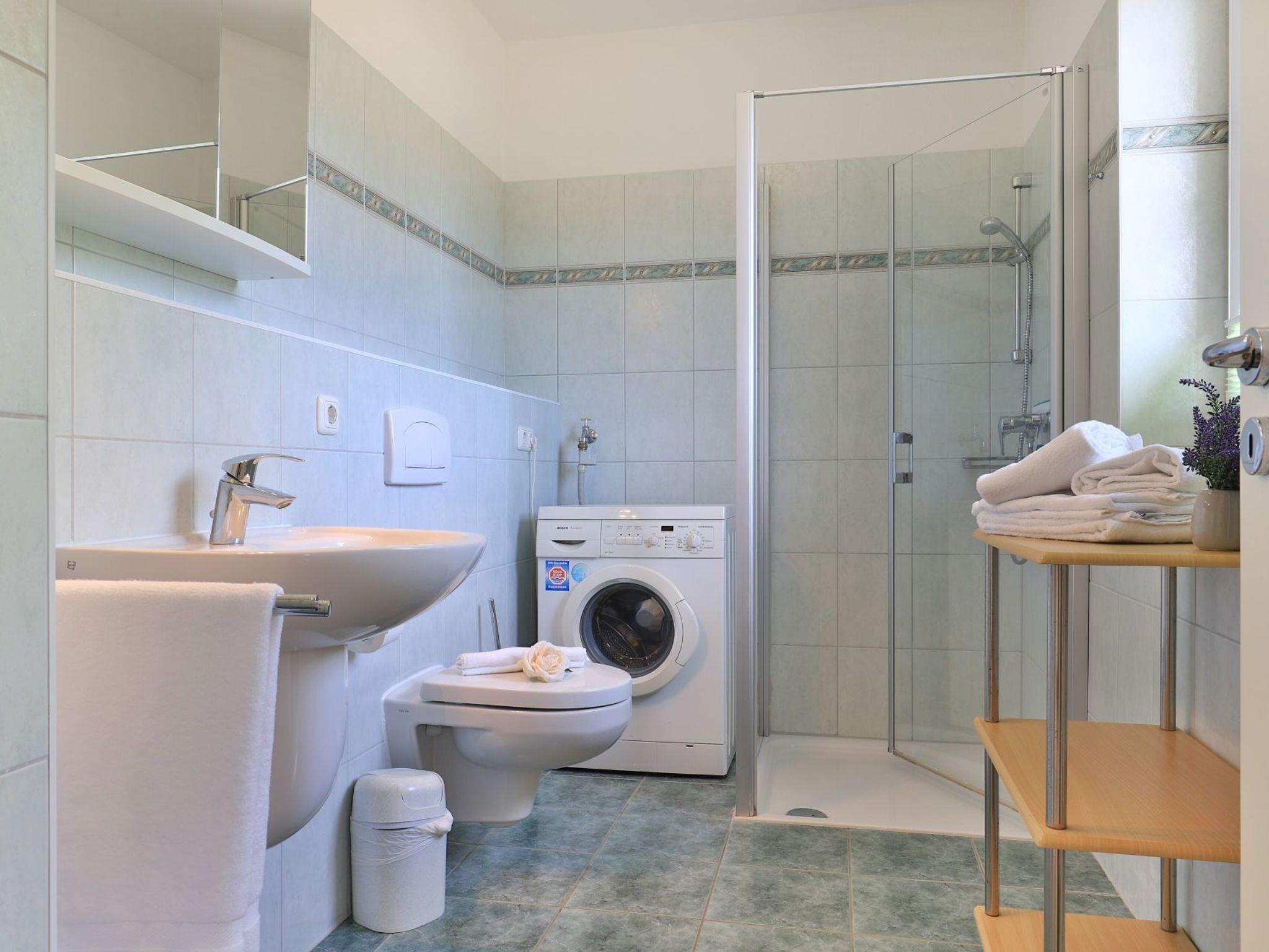 Im Erdgeschoss befindet sich zudem Schlafzimmer 1- mit Doppelbett, Kleiderschrank. Auch ein Duschbad mit flachem Duscheinstieg, Waschtisch, WC, Waschmaschine und Fenster liegt auf dieser Wohnebene.
