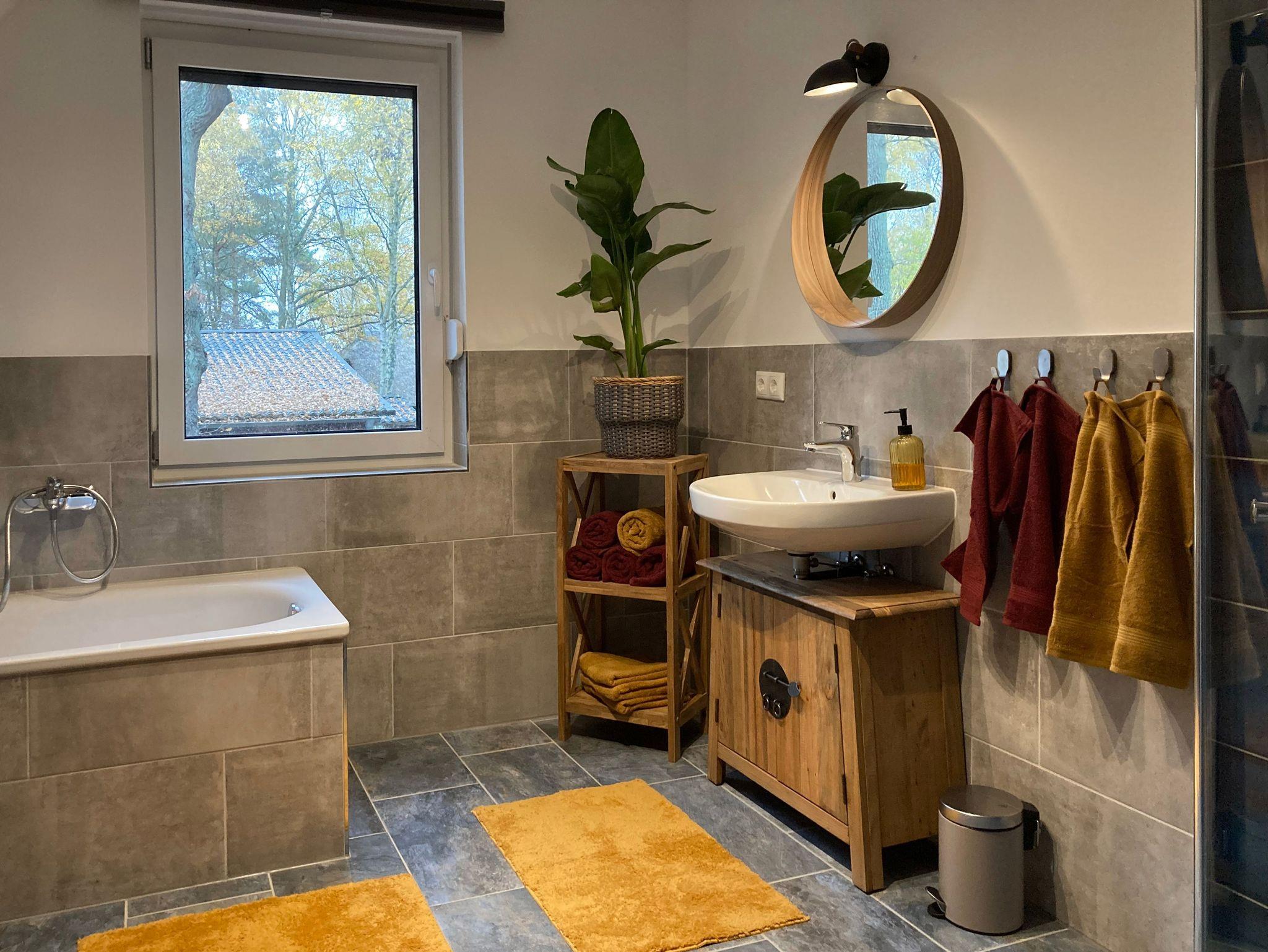 Das Haus hat 3 Schlafzimmer fu¨r je 2 Personen, ein Badezimmer mit Dusche und Wanne, einen großzu¨gigen Wohn- und Essbereich im Parterre und eine Ga¨stetoilette. Auch liegt hinter dem Haus ein eigener Garten und daneben der Parkplatz in der Einfahrt.