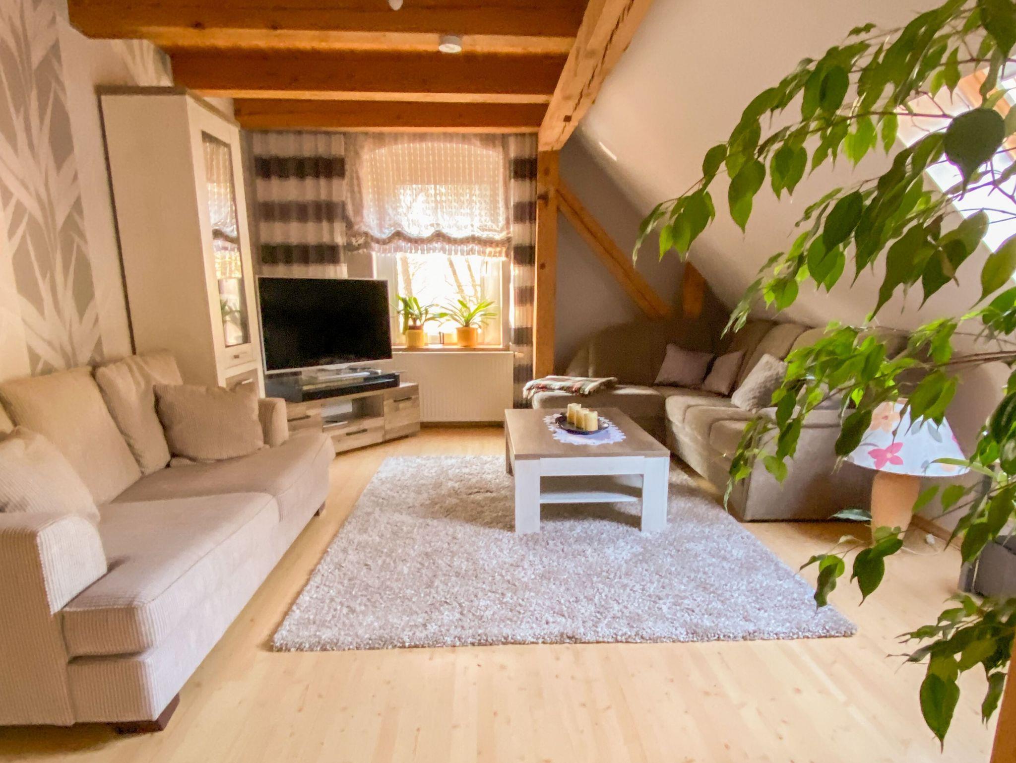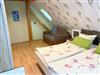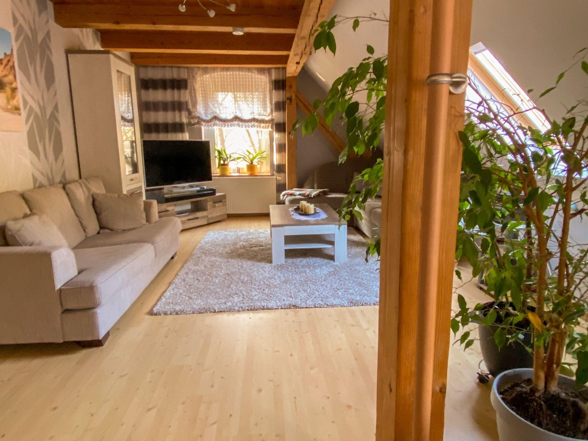 Die Ferienwohnung befindet sich im Obergeschoss und besteht aus einem Wohnzimmer mit angrenzendem Kochbereich, zwei Schlafzimmern und einem Bad mit Dusche und WC. Das erste Schlafzimmer verfügt über ein Doppelbett (180x200; getrennte Matratzen) und Schlafsofa (130x200, Aufbettung für 2 Personen) und das zweite Schlafzimmer über ein Doppelbett (140x200). Für Kinder bis 3 Jahre kann ein Kinderbett (60x120) zur Verfügung gestellt werden.