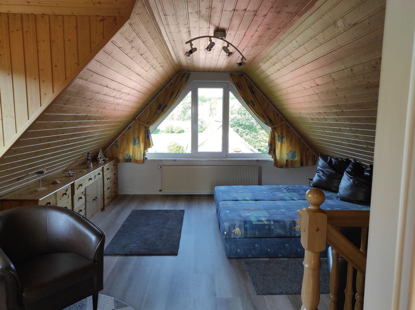 Über eine Wendeltreppe kommen Sie ins 1. OG, dort befinden sich die Schlafzimmer.