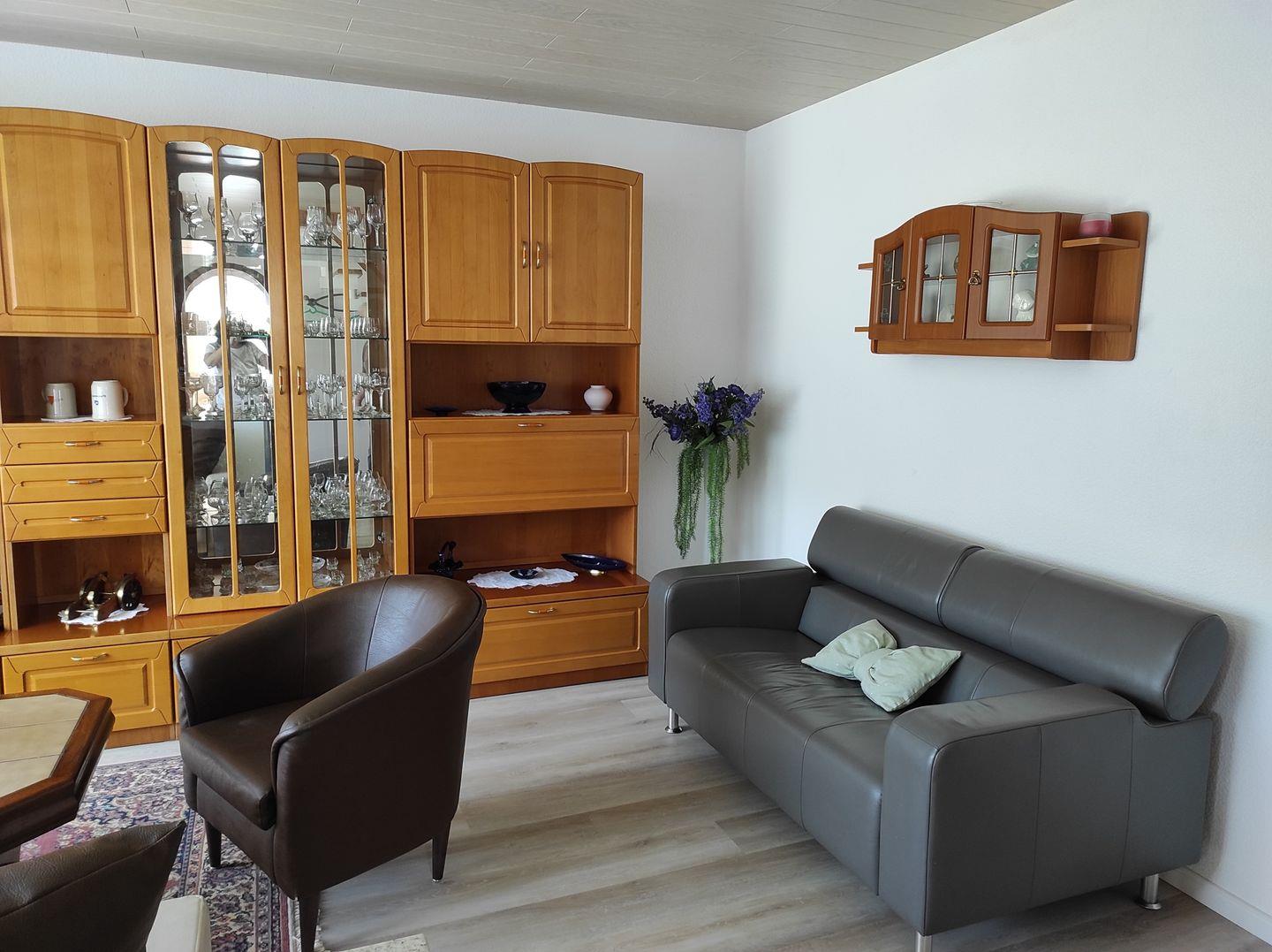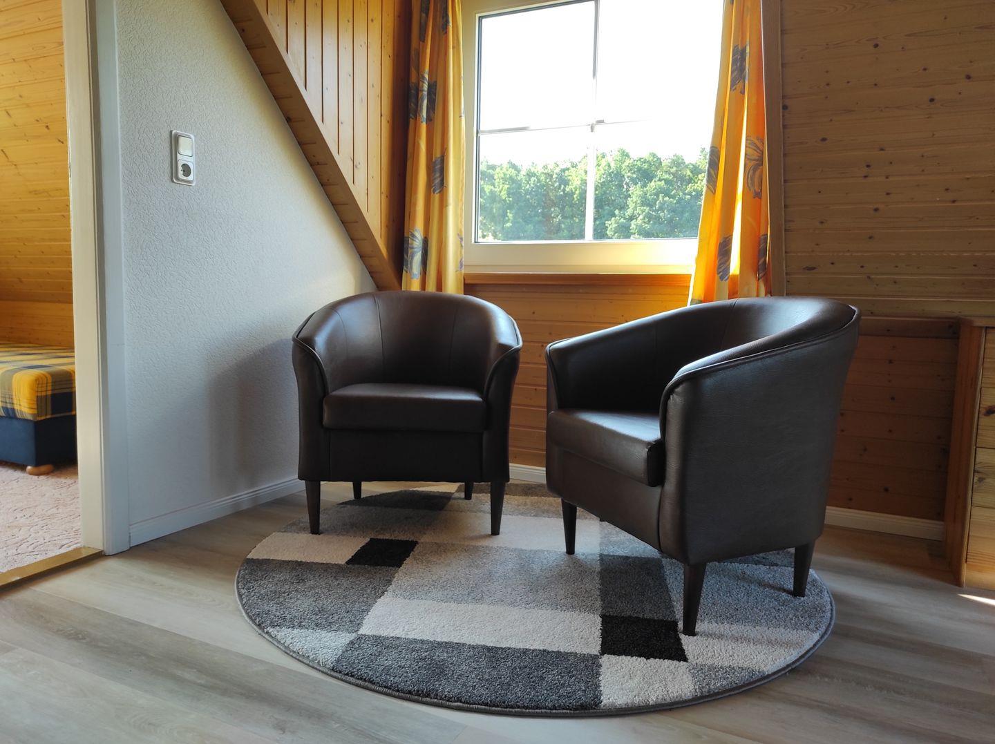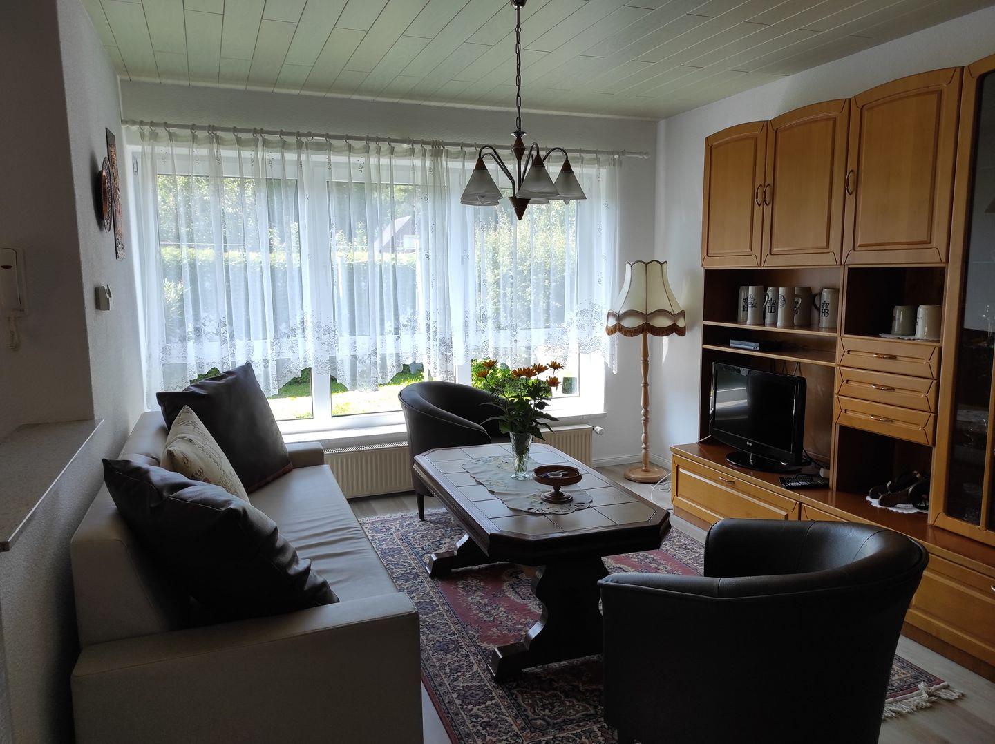 Im Wohnzimmer finden Sie ein großes Sofa sowie Sessel, die zum Entspannen einladen.