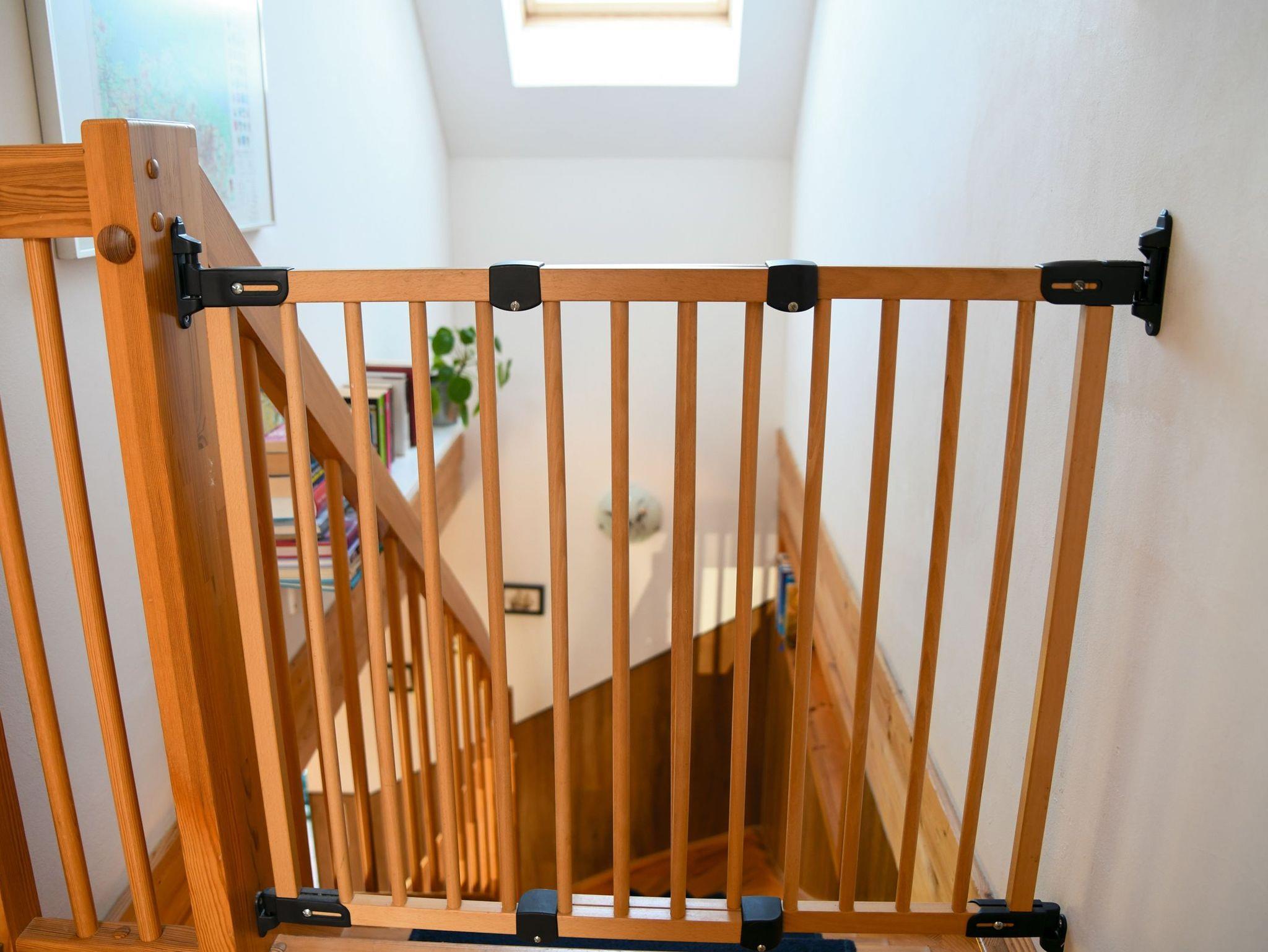 1 Kinderreisebett, 1 Kinderbett, inkl. Kissen, Bettdecke, 2 Hochstühle, Treppenschutz, Bollerwagen und Kinderspielzeug, Abschließbarer Schuppen für Fahrräder o.ä., Grill