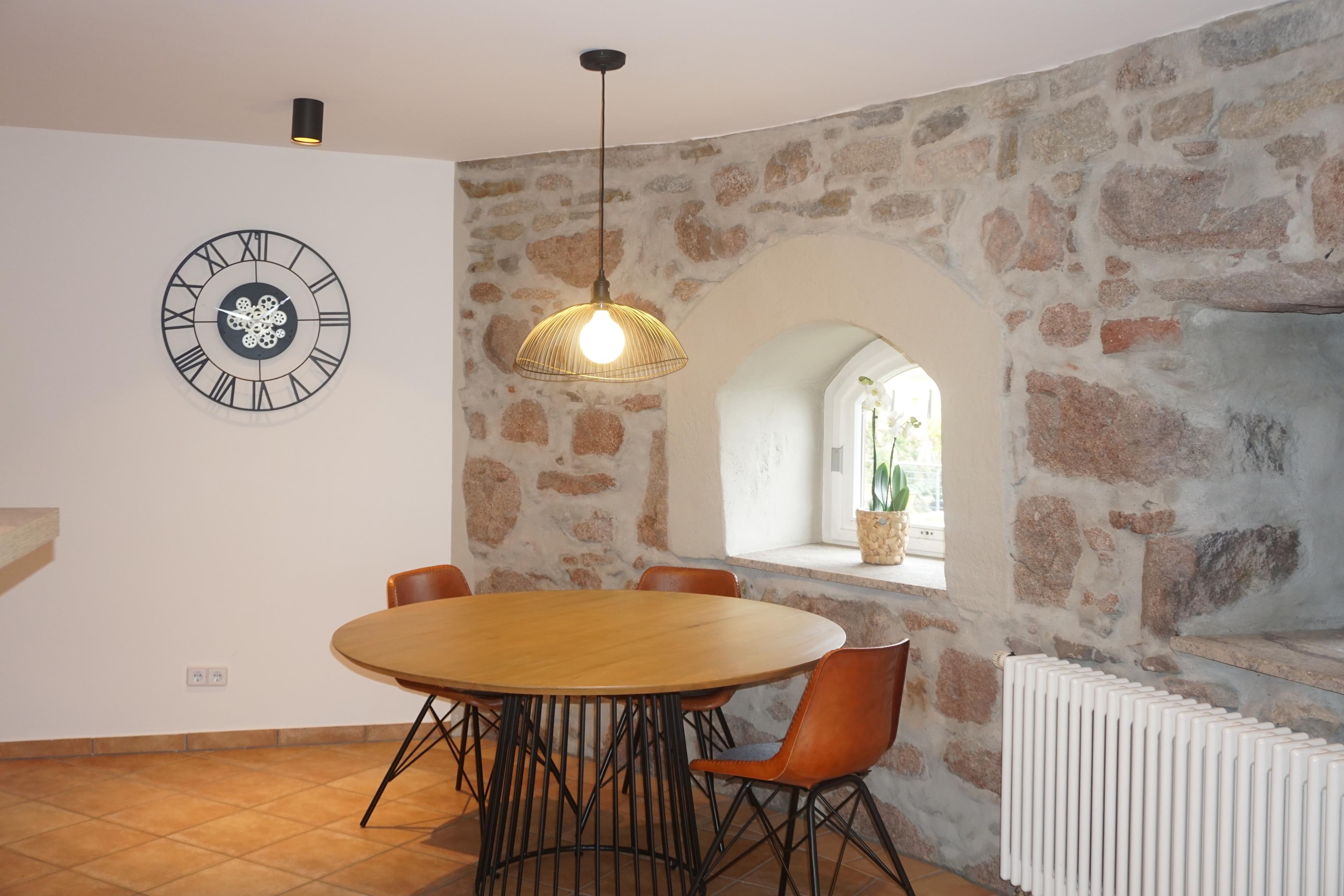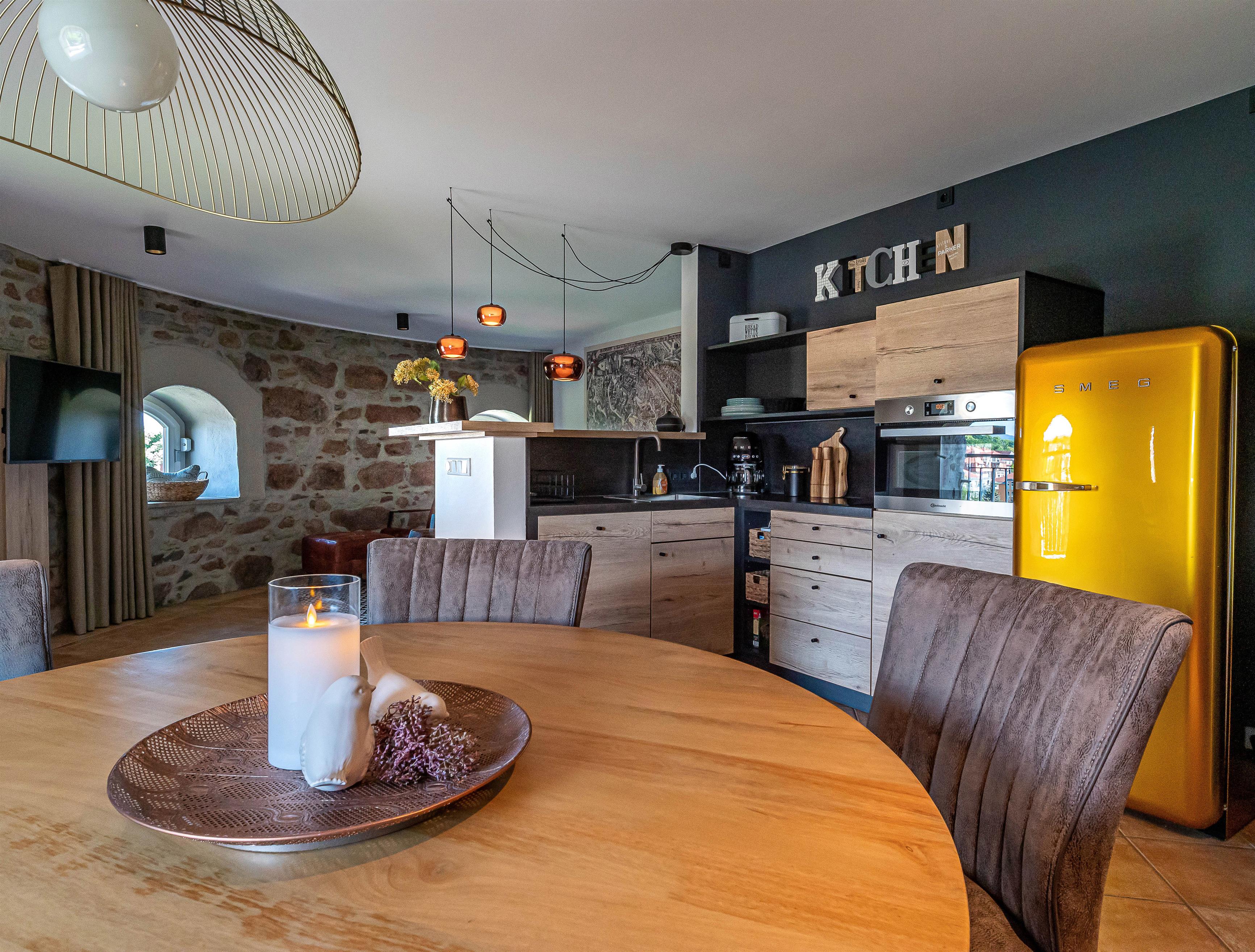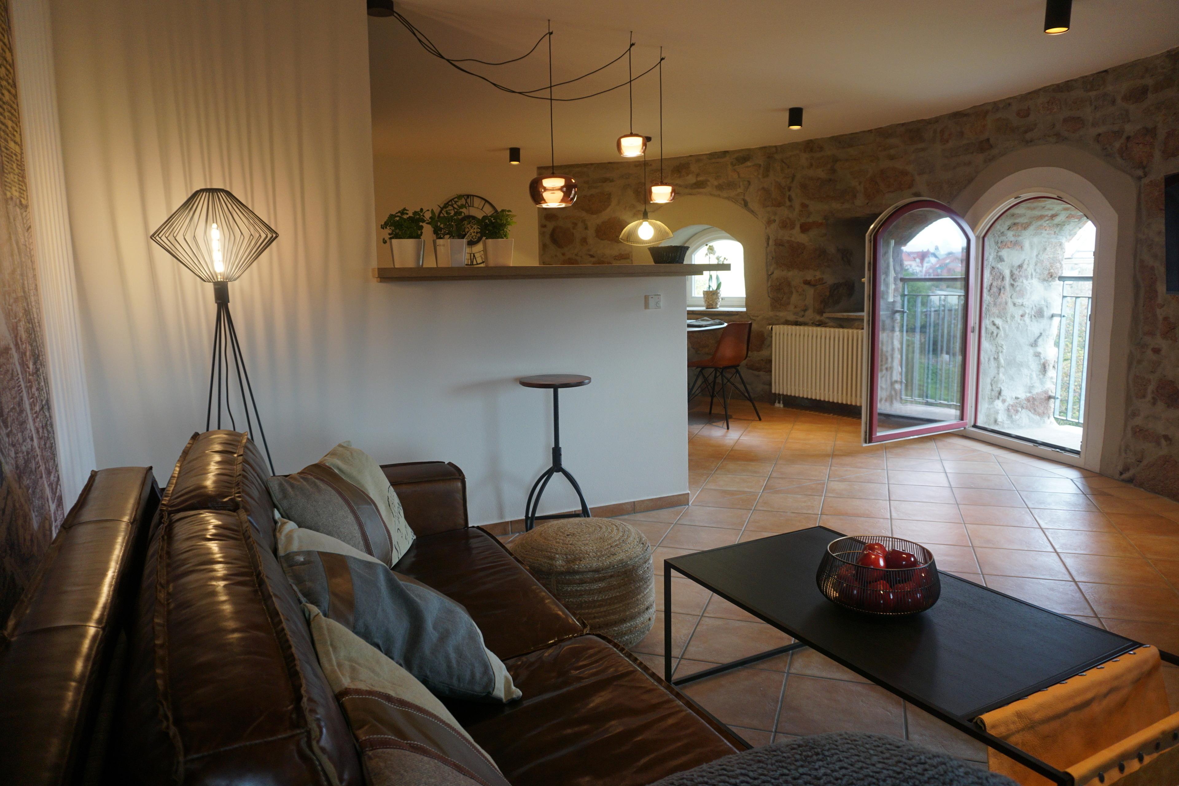 Genießen Sie die Aussicht ins Oberlausitzer Bergland und über das Flusstal in einer Höhe von 30 Metern über der Spree. Die großzügige Suite mit ihren insgesamt 67m² bietet viel Raum, um Ihren Urlaub genießen zu können. Das Bad mit Dusche & WC ist separat vom Flur aus erreichbar. Der Wohnbereich, mit seiner modernen Wohnküche, einem Ess-und Sitzbereich lädt zu entspannten Abenden in Ihrer Suite ein. Ihr Schlafzimmer ist separat erreichbar und bietet mit seiner Aussicht, den Natursteinmauern und dem Boxspringbett aus hochwertigen Materialien eine einzigartige Gemütlichkeit. Auf dem Sofa Bett schläft man gemütlich mit einer Breite von 142 cm.