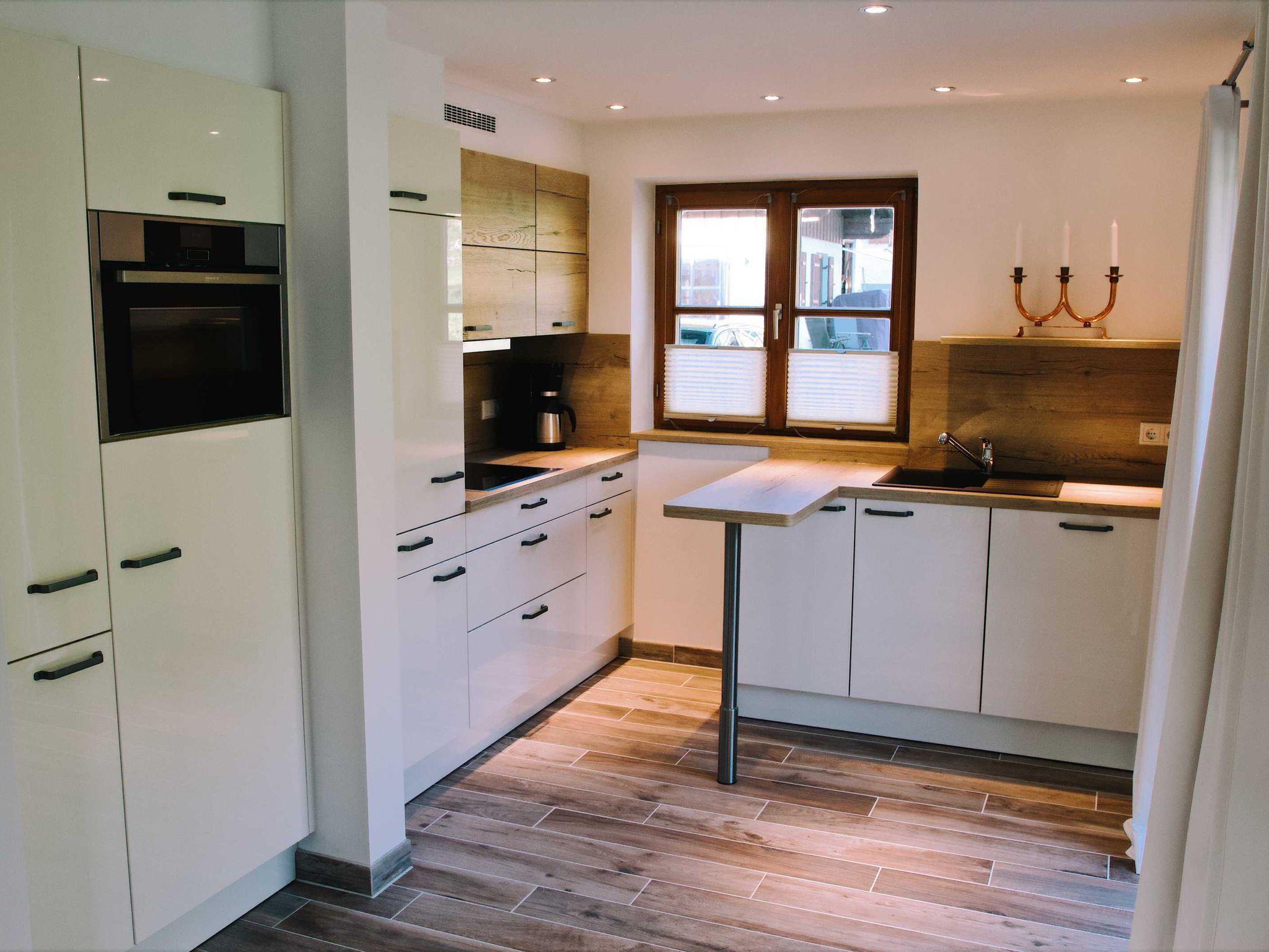 Hochwertig sanierte, 90 qm große ebenerdige Ferienwohnung für 2-5 Personen mit zwei Sonnenterrassen, offener Küche zum Wohnraum mit Mikrowelle, Backofen, Geschirrspüler, Cerankochfeld, Kühlschrank. Wohn-Esszimmer mit Kaminofen, bodentiefe Fenster, Flat-TV, Musikanlage mit Soundsystem, zusätzliches Couchbett mit Lattenrost und Federkernmatratze. Schlafzimmer mit Boxspringbett und TV, Gäste-WC, Wirtschaftsraum mit Waschmaschine und Trockner, großes Bad mit barrierefreier Dusche mit Glasabtrennung.