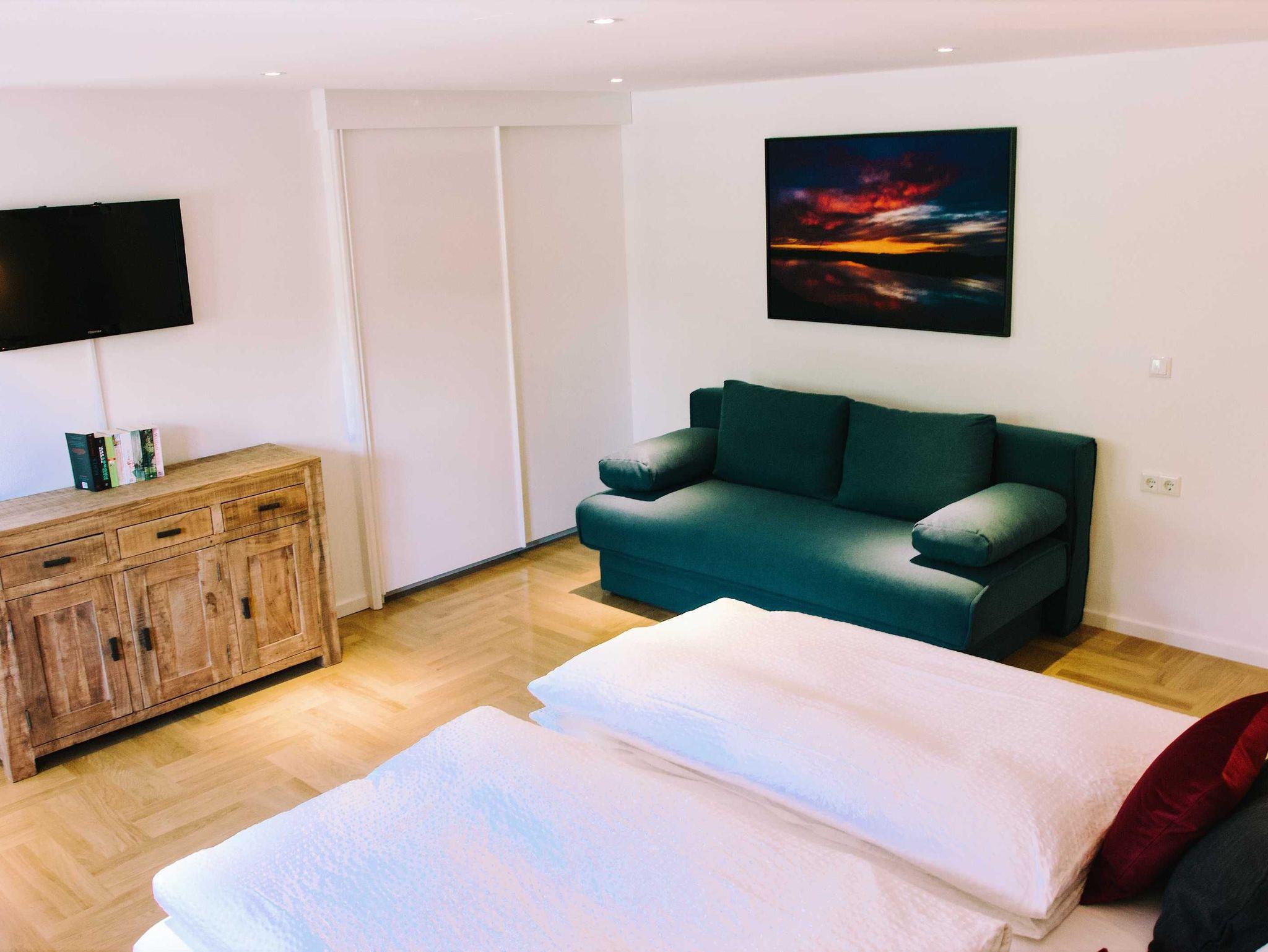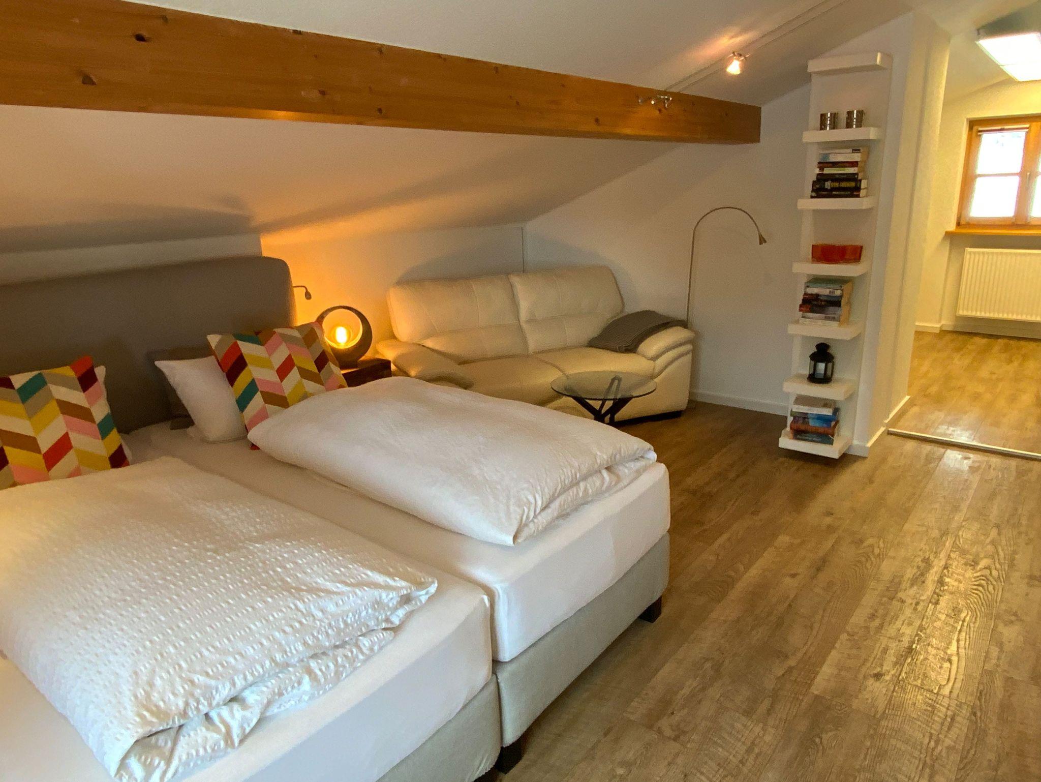 Apartment auf zwei Ebenen für Nichtraucher. Im Jahr 2017 hochwertig saniertes, modern eingerichtetes Apartment mit ebenerdiger Dusche mit Glasabtrennung; Schwedenofen, Garderobe. Im 1. OG: Küche inklusive Mikrowelle, Backofen. Wohn-/Schlafraum mit Boxspringbett, Ledercouch, Eßecke, Flat-screen, Musikanlage, Westbalkon, Designerböden. Eigene Sonnenterrasse zusätzlich außerhalb vom Haus mit Strandkorb.