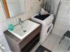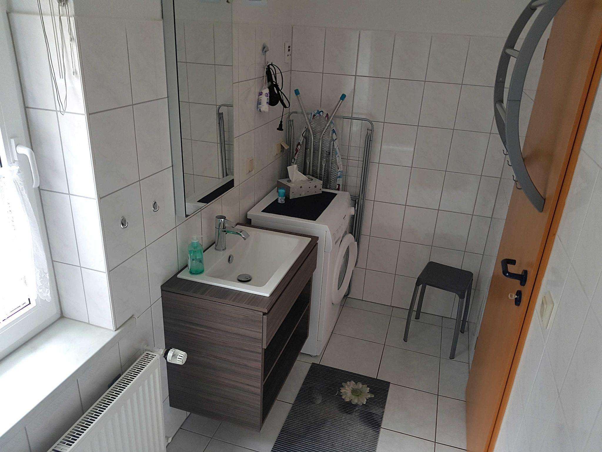 Das Bad hat ein Tageslichtfenster mit Blick auf den Wald. Es ist mit einer Badewanne mit Dusche, einer Waschmaschine, Haartrockner und einem modernen Waschtisch ausgestattet.