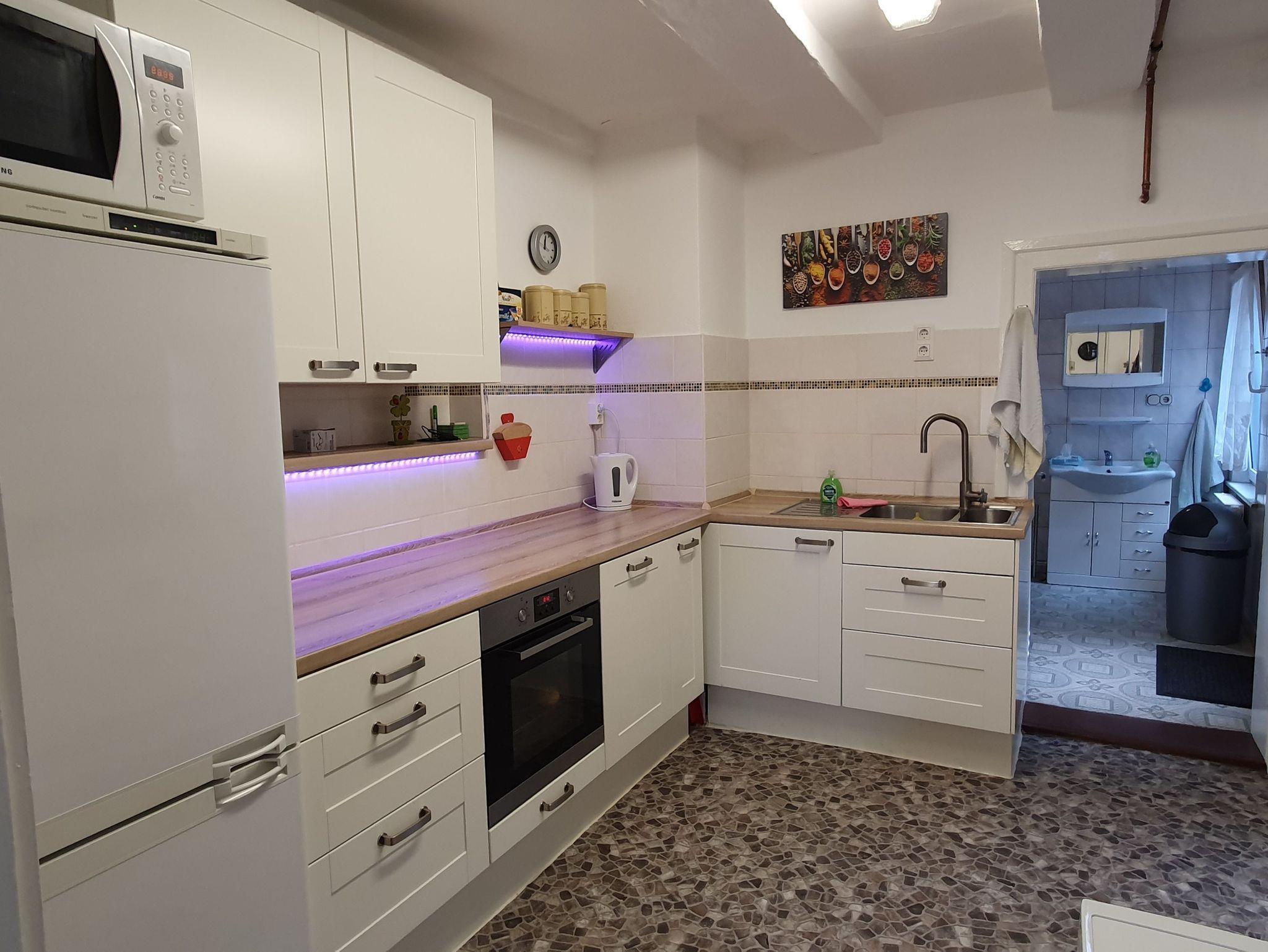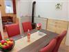 Das gemütliche Wohnzimmer ist ausgestattet mit einen LED-Flachbildfernseher einer Stereo-Anlage und zwei Sofas. Im anschließenden Esszimmer mit großem Esstisch und Ofen lädt für Spieleabende ein. Die Küche ist mit einem Kühlschrank-/Gefrierkombination, einem Geschirrspüler, einem Backofen, einem großen Gasherd mit fünf Kochstellen und einer Mikrowelle ausgestattet. Das Badezimmer erreicht man durch die Küche, in welchem sich ein WC und eine Badewanne mit Duschmöglichkeit befindet. Zudem erreicht man von hieraus auch den Außenbereich mit Sitzgelegenheit im kleinen Garten.