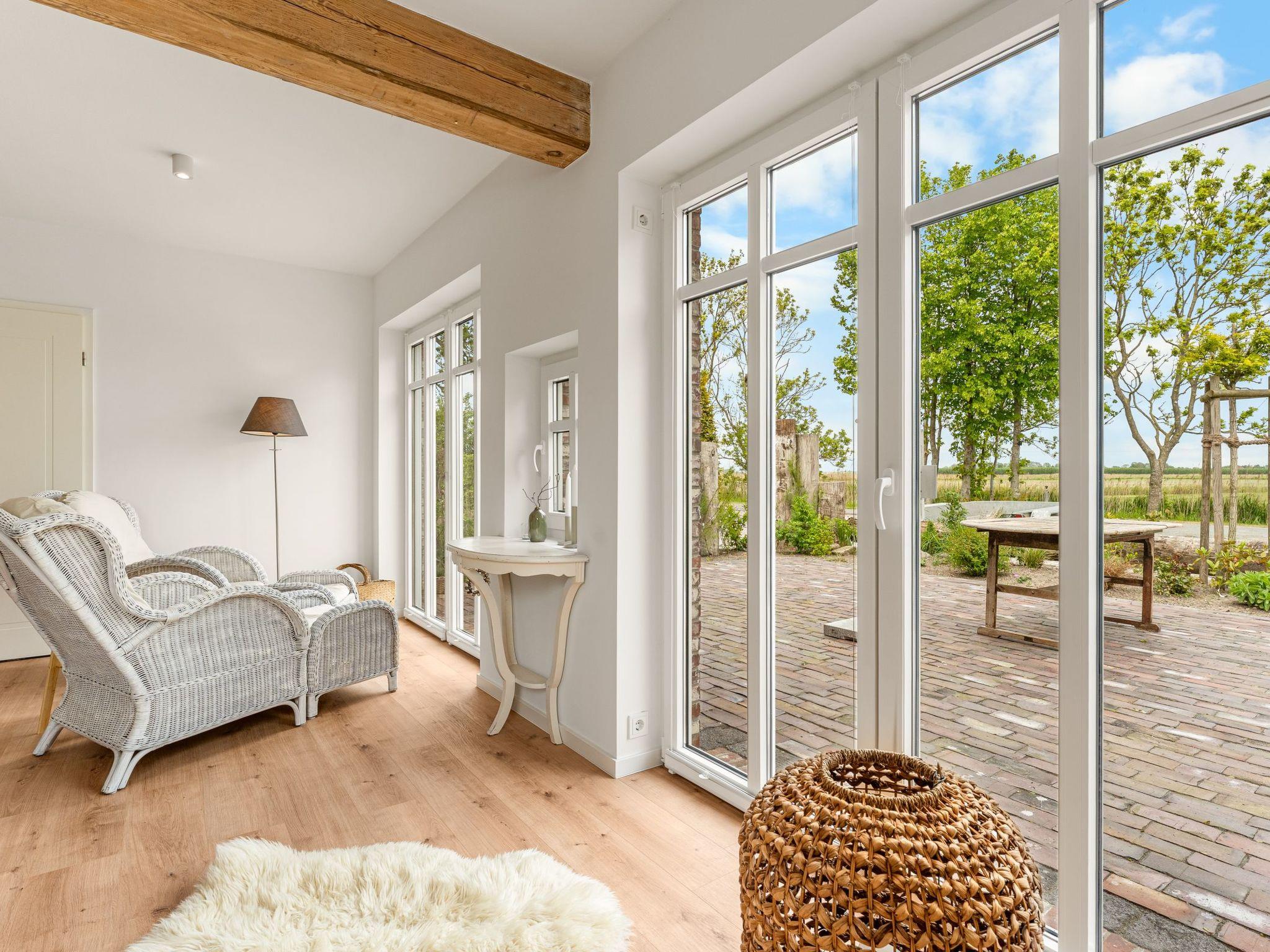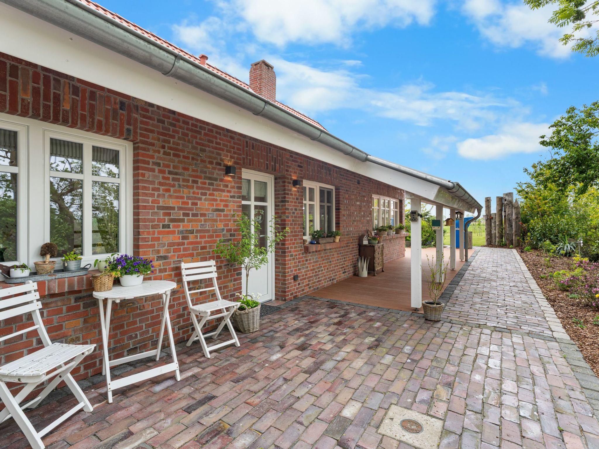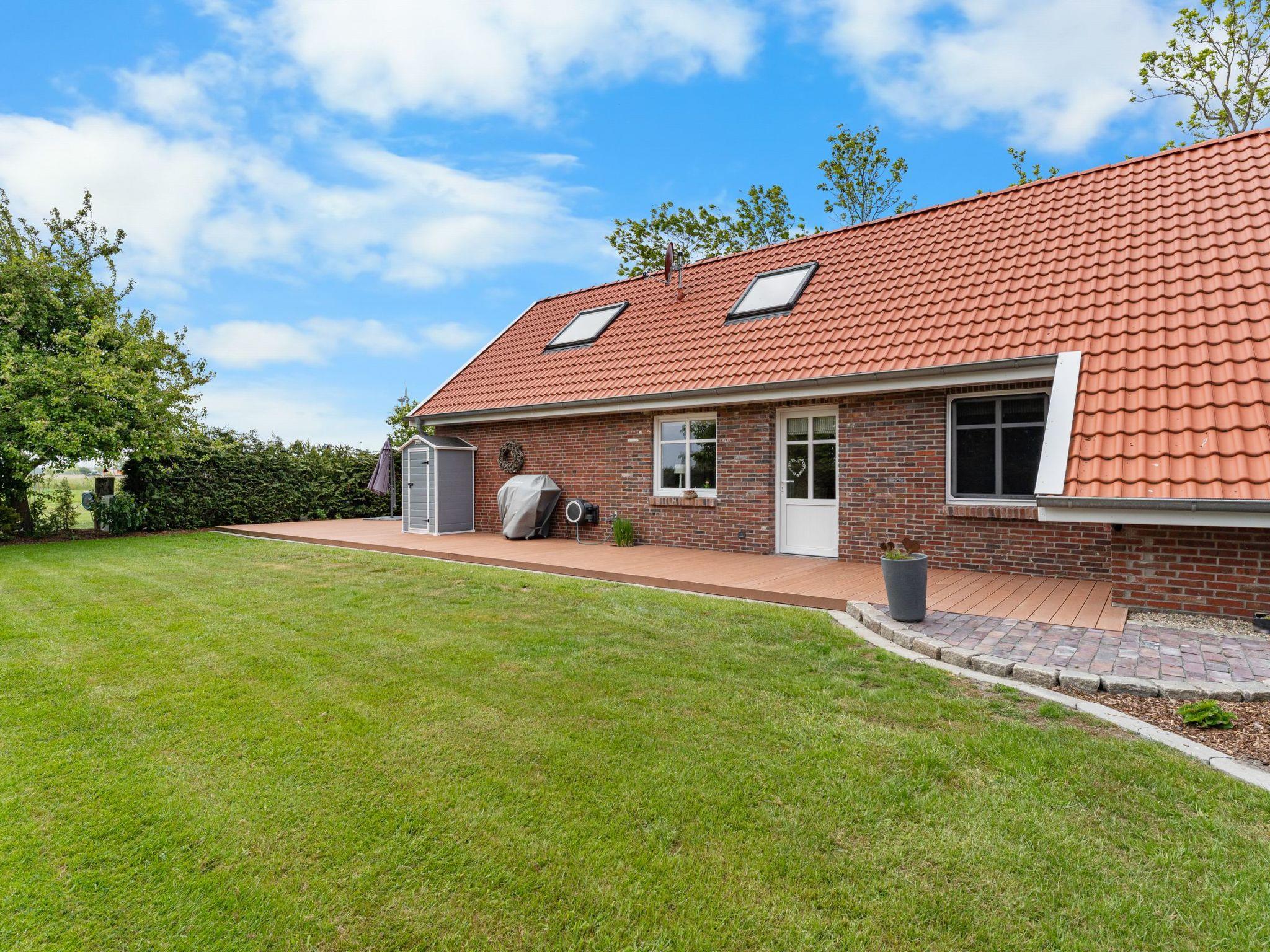 Im Außenbereich des 9000 qm großen Grundstücks finden Sie eine Oase der Ruhe. Eine großzügige Terrasse umgibt das Haus, sodass Sie jederzeit ein sonniges Plätzchen zum Entspannen finden können. Der Blick reicht bis zum alten Deich hinter Westerbur, eine Kulisse, die zum Verweilen und Seele baumeln lassen einlädt.