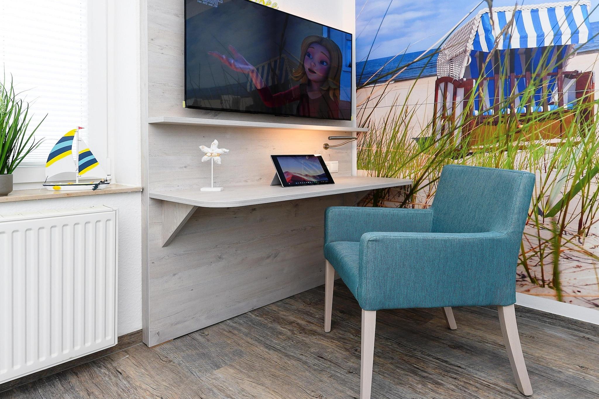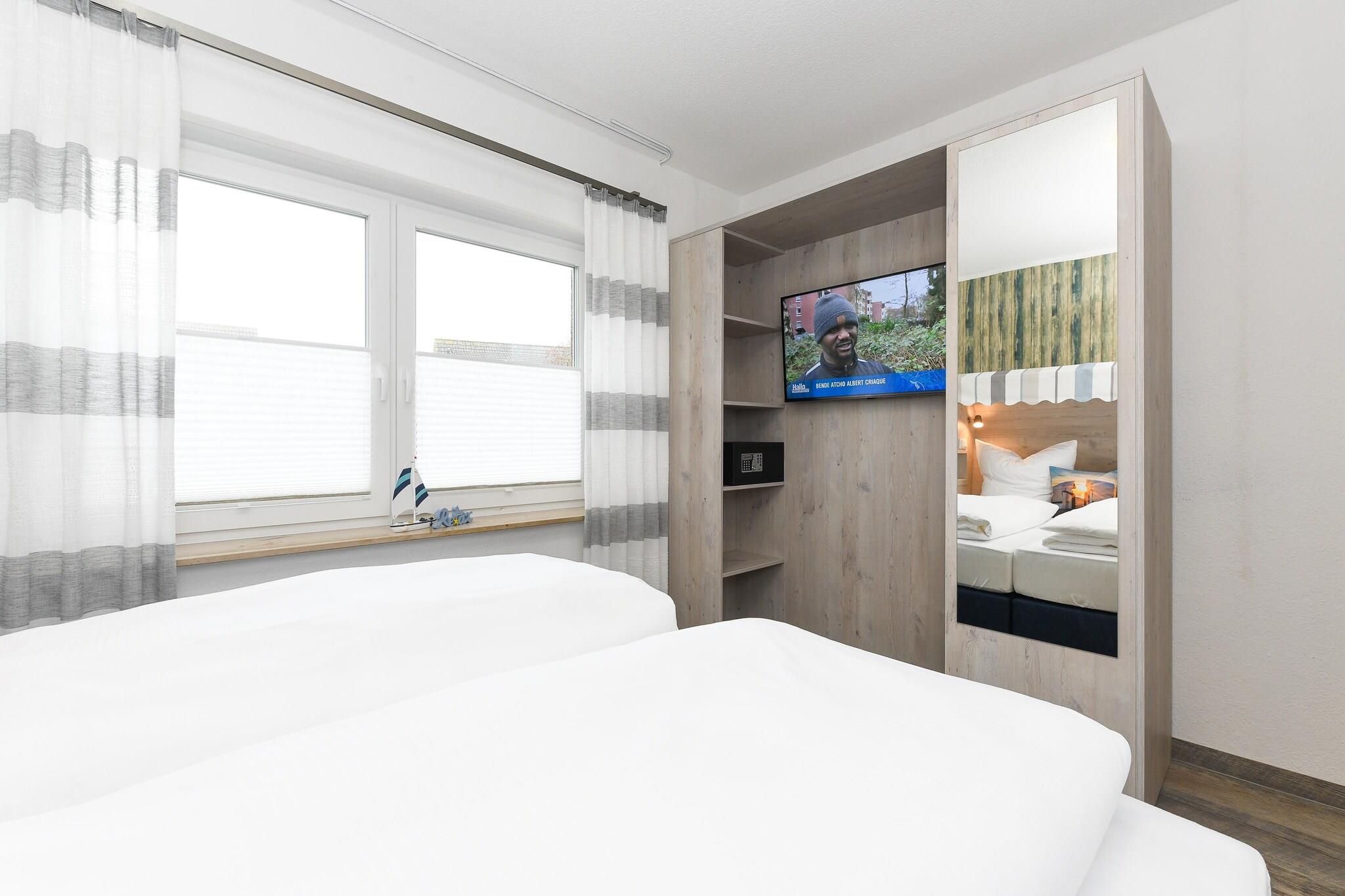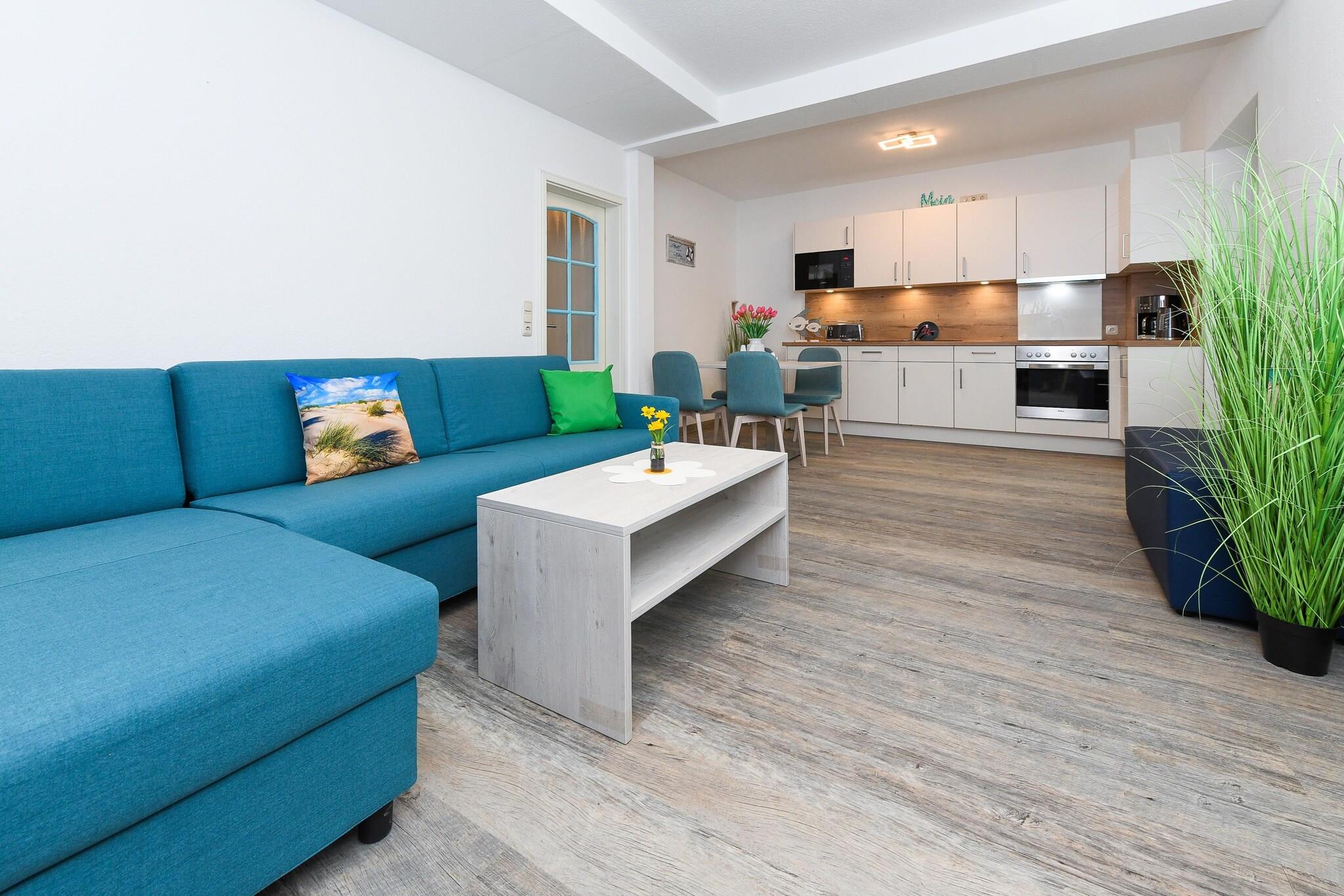 Diese gemütliche Ferienwohnung im Erdgeschoss bietet auf ca. 50?m² alles, was Familien und Erholungssuchende für einen entspannten Urlaub an der Nordsee benötigen. Die Wohnung ist optimal geeignet für 1 bis 4 Personen sowie ein zusätzliches Kleinkind. Die Ausstattung umfasst einen hellen Wohnbereich mit integrierter Küche, ein separates Schlafzimmer, ein Kinderzimmer sowie ein modernes Badezimmer mit Dusche und WC. Die private Terrasse lädt zu sonnigen Frühstücken oder entspannten Abenden im Freien ein. Ein kostenloses WLAN, moderne Küchengeräte, ein Flachbild-TV sowie hochwertige Matratzen sorgen für Komfort wie zu Hause. Für Familien besonders praktisch: Im gemeinschaftlich nutzbaren Bereich stehen Waschmaschine und Trockner zur Verfügung. Der gepflegte Garten hinter dem Haus bietet ausreichend Platz zum Spielen und Entspannen. Dank der ruhigen Lage und der Nähe zu Strand, Ortszentrum und Freizeitangeboten ist die Ferienwohnung ideal für Paare oder Familien mit Kindern, die ihren Urlaub an der Nordseeküste genießen möchten. Highlights: WLAN, verbrauchsabhängige Energiekosten und Wäschepaket inklusive. Hinweis zur Endreinigung: Bei einem Aufenthalt von unter 5 Nächten ist eine Gebühr von 80 EURO zu zahlen, ansonsten ist die Endreinigung inklusive.