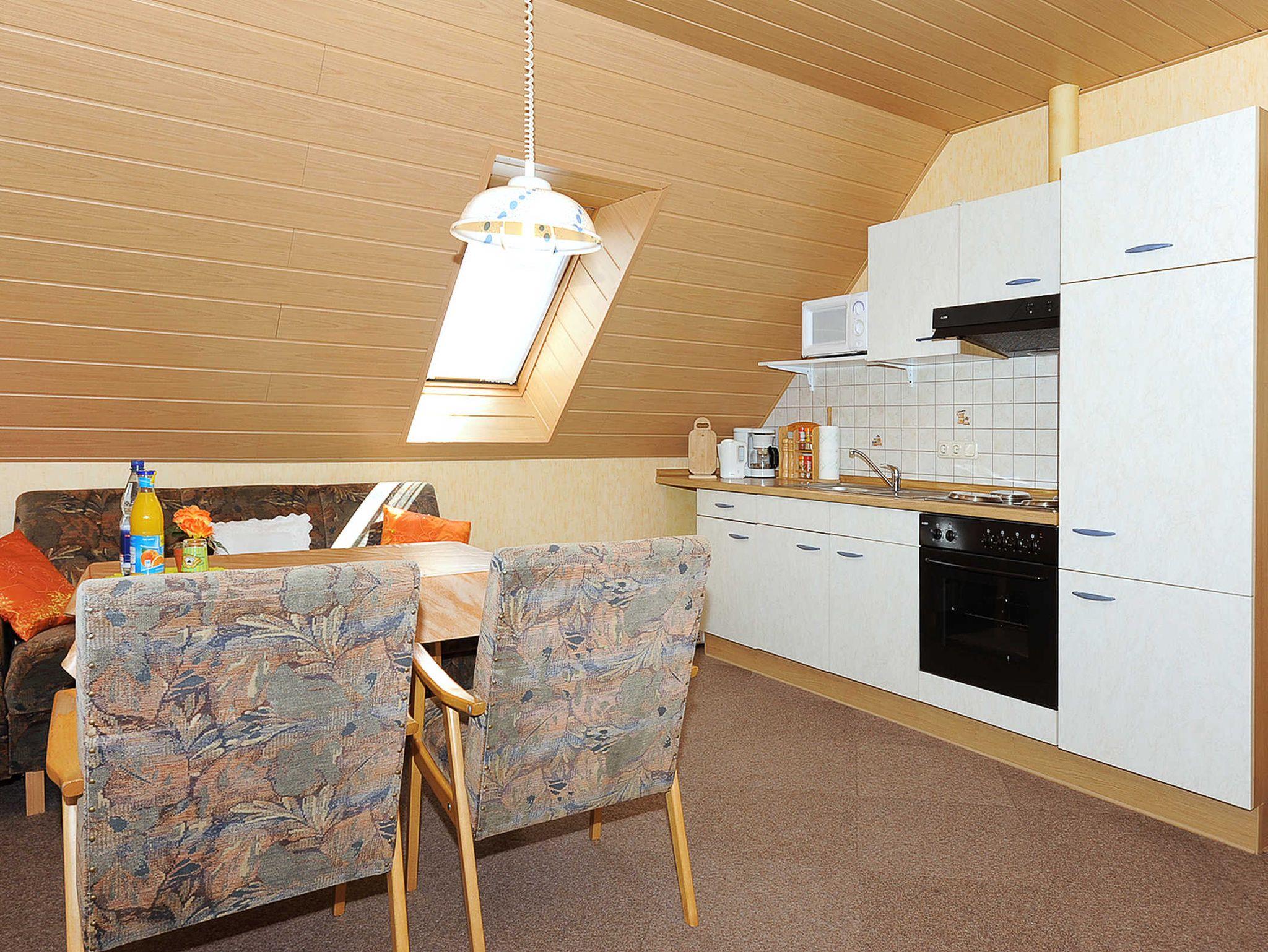 Größe ca. 50 Quadratmeter, Wohnraum mit integrierter Küche, Schlafzimmer, zweites separates, Schlafzimmer/Kinderzimmer, Badezimmer mit Dusche, Waschtisch und WC, Obergeschoss, Terrasse (Gemeinschaftsterrasse), optimal für 2 bis 4 Personen.
