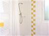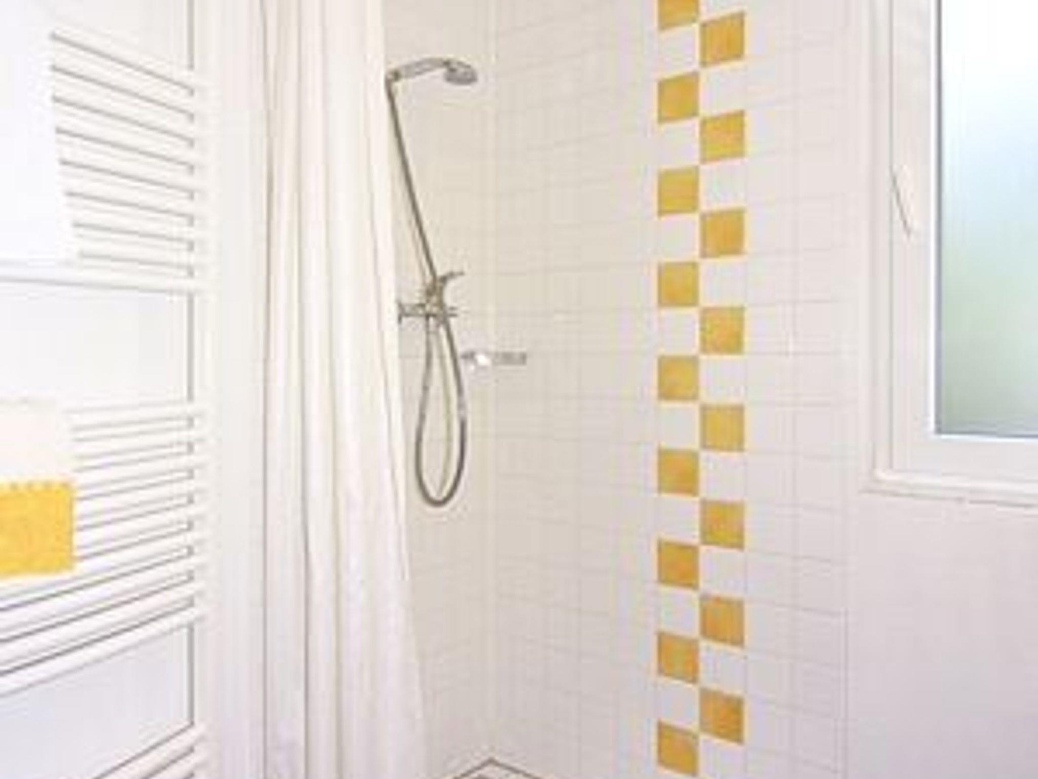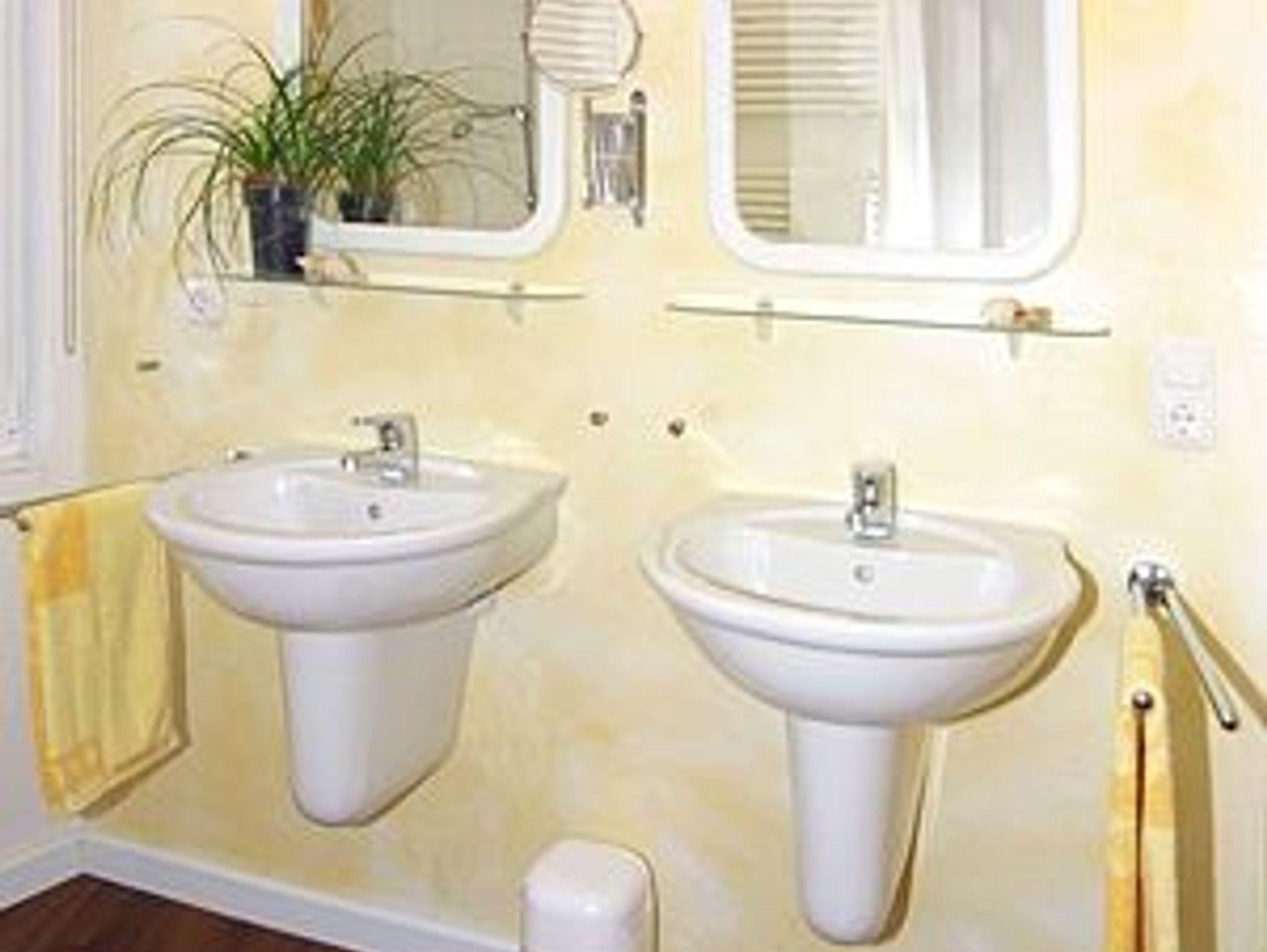 Badezimmer mit Doppel-Waschbecken, Dusche und WC