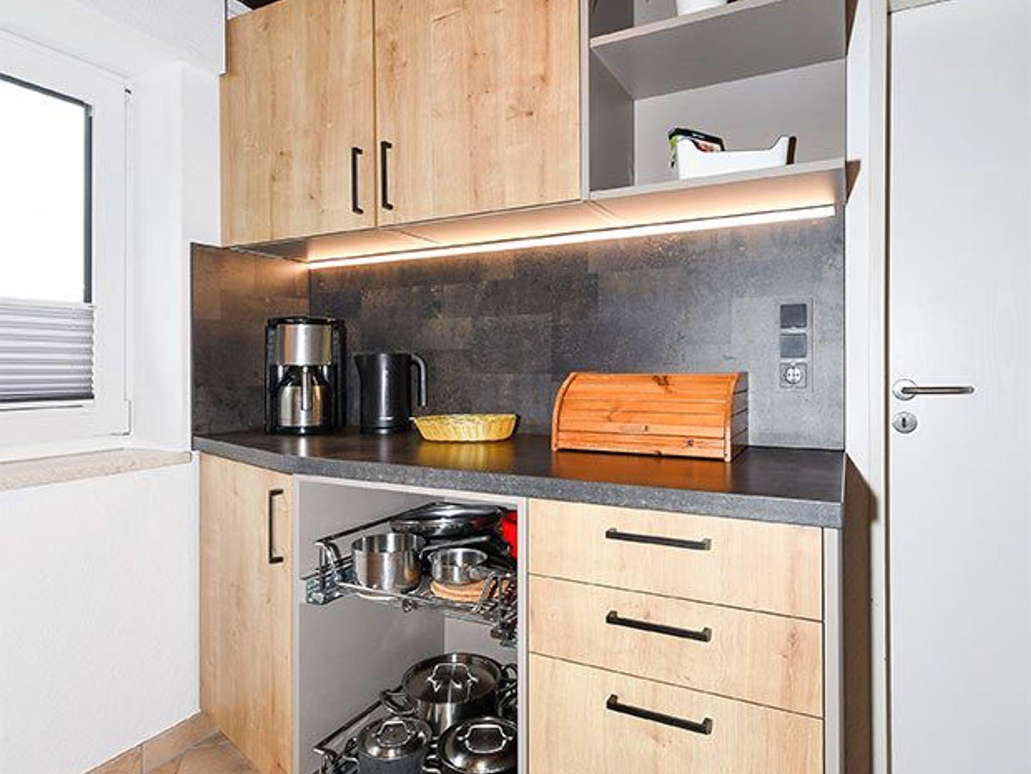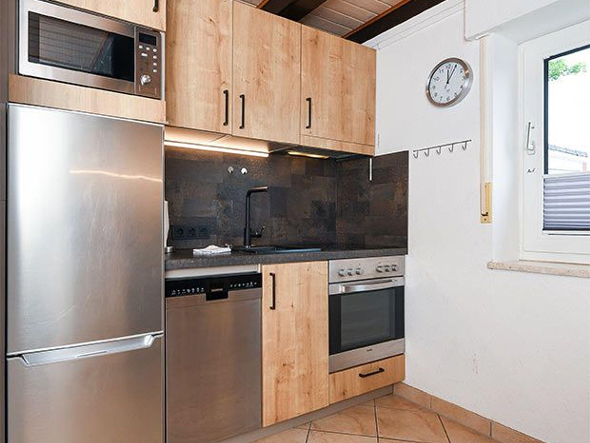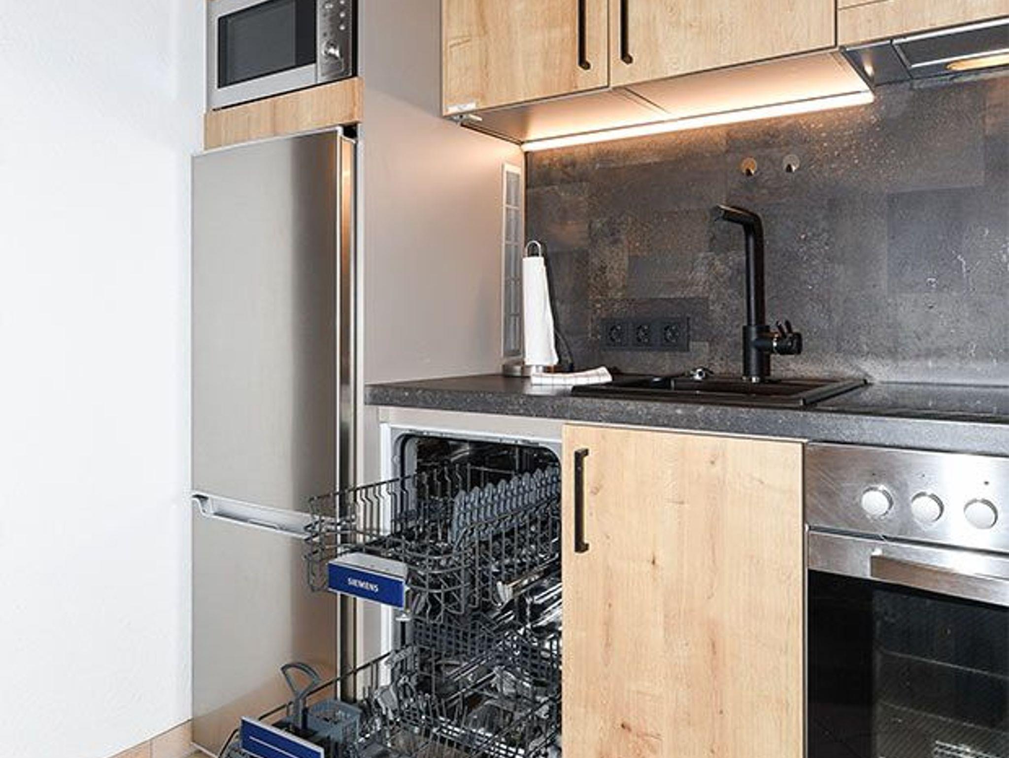 Moderne Küche mit Geschirrspülmaschine, Ceran-Kochfeld und Umluft-Backofen