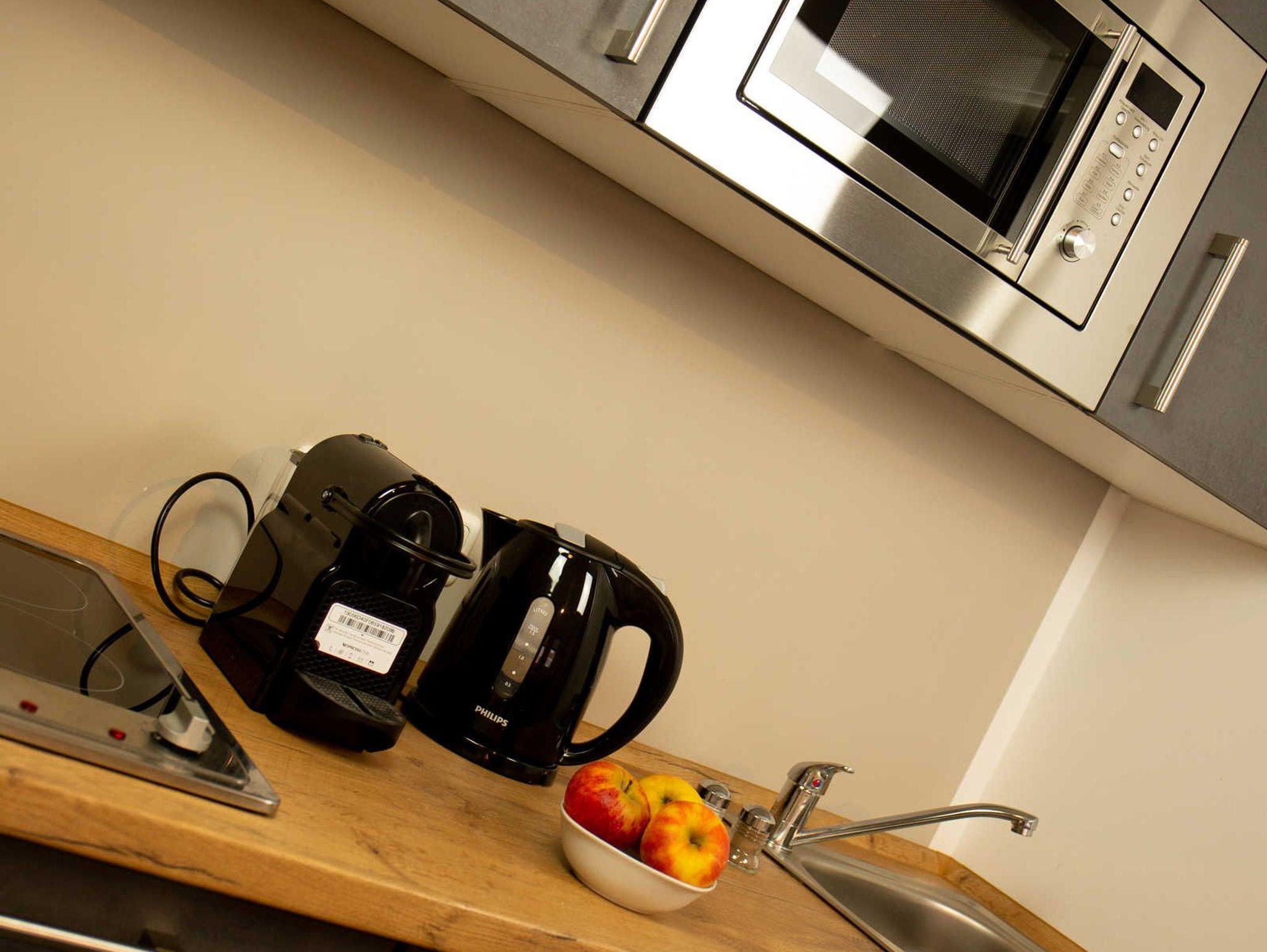 Ihre Unterkunft verfügt über kostenfreies WLAN. Der Wohnbereich bietet zudem eine gut ausgestattete offene Küchenzeile mit Kühlschrank, Gefrierfach, Kaffeemaschine, Wasserkocher und Mikrowelle. Das Appartement verfügt über einen Esstisch für 2 Personen und einen behaglichen Sitzbereich. Im separaten Schlafzimmer steht Ihnen ein komfortables Boxspringbett zur Verfügung. Im stilvollen Badezimmer befinden sich eine große begehbare Dusche sowie ein Waschtisch mit Föhn. Des Weiteren ist im Buchungspreis ein Wäschepaket mit Handtüchern und Bettwäsche enthalten.