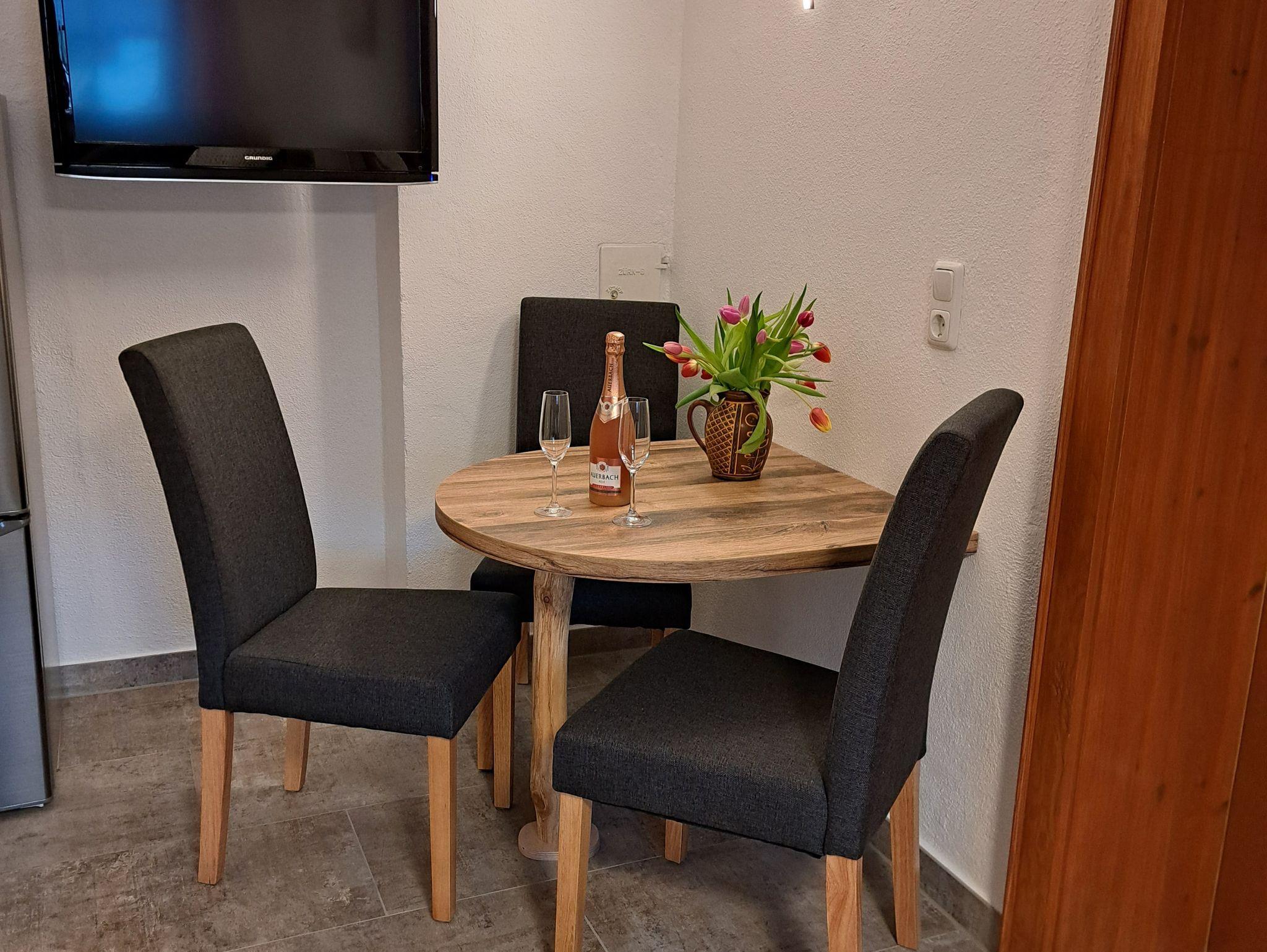 Sie betreten die Wohnung und gelangen in einen kleinen Vorraum, wo sich links das separate WC befindet. Nun betreten Sie die komfortable Wohnküche mit einem Esstisch, einem Relax-Sofa, sowie einer hochwertig ausgestatteten Einbauküche. In der Küche finden Sie eine Spülmaschine, einen E-Herd mit Ceranfeld und Backrohr, Wasserkocher, Kaffeemaschine und Toaster. Kühlschrank mit großem Gefrierabteil. Über die Küche betreten Sie den separaten Duschraum mit Waschbecken und Badmöbeln. Das geräumige, im ländlichen Stil eingerichtete Schlafzimmer ist vom Wohnraum getrennt und lädt zum Ausruhen und Entspannen ein. Auch ein Zustellbett oder ein Babybett würden hier Platz finden. Sämtlicher Service, sowie alle Freizeiteinrichtungen unseres Gästehauses können mitbenutzt werden.